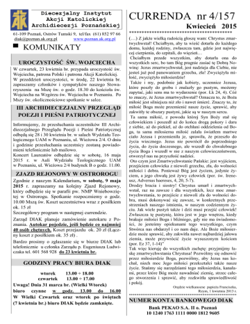 Diecezjalny Instytut Akcji Katolickiej Archidiecezji Poznańskiej 61-109 Poznań, Ostrów Tumski 9, tel/fax (61) 852 97 66 [email protected] www.poznan.ak.org.pl ▀ KOMUNIKATY UROCZYSTOŚĆ ŚW. WOJCIECHA W czwartek, 23 kwietnia br. przypada uroczystość św. Wojciecha, patrona Polski i patrona Akcji Katolickiej. W przeddzień uroczystości, w środę, 22 kwietnia br. zapraszamy członków i sympatyków naszego Stowarzyszenia na Mszę św. o godz. 18.30 do kościoła św. Wojciecha na Wzgórzu św. Wojciecha w Poznaniu. Po Mszy św. okolicznościowe spotkanie w salce. III ARCHIDIECEZJALNY PRZEGLĄD POEZJI I PIEŚNI PATRIOTYCZNEJ Informujemy, że przesłuchania uczestników III Archidiecezjalnego Przeglądu Poezji i Pieśni Patriotycznej odbędą się 28 i 30 kwietnia br. w salach Wydziału Teologicznego UAM w Poznaniu, ul. Wieżowa 2/4. O dniu i godzinie przesłuchania uczestnicy zostaną powiadomieni telefonicznie lub mailowo. Koncert Laureatów odbędzie się w sobotę, 16 maja 2015 r. w Auli Wydziału Teologicznego UAM w Poznaniu, ul. Wieżowa 2/4 budynek B o godz. 11.00. ZJAZD REJONOWY W OSTROROGU Zgodnie z naszym Kalendarium, w sobotę, 9 maja 2015 r. zapraszamy na kolejny Zjazd Rejonowy, który odbędzie się w parafii pw. NMP Wniebowziętej w Ostrorogu. Spotkanie rozpoczniemy o godz. 10.00 Mszą św. Koszt uczestnictwa wraz z posiłkiem ok. 15 zł Szczegółowy program w następnej currendzie. Zarząd DIAK planuje zamówienie autokaru z Poznania. Autokar pojedzie, jeśli będzie co najmniej 40 osób chętnych. Koszt przejazdu ok. 20 zł (Łączny koszt z posiłkiem ok. 35 zł) . Bardzo prosimy o zgłaszanie się w biurze DIAK lub telefonicznie u członka Zarządu p. Eugeniusza Ludwiczaka tel. 601 568 928 do 23 kwietnia br. GODZINY PRACY BIURA DIAK wtorek 13.00 ÷ 18.00 czwartek 13.00 ÷ 17.00 Uwaga! Dnia 31 marca br. (Wielki Wtorek) biuro czynne w godz. 13.00 do 16.00 W Wielki Czwartek oraz wtorek po świętach (7 kwietnia br.) biuro DIAK będzie zamknięte. CURRENDA nr 4/157 Kwiecień 2015 ***************************************** (…) Z jakże wielką radością głoszę wam: Chrystus zmartwychwstał! Chciałbym, aby ta wieść dotarła do każdego domu, każdej rodziny, zwłaszcza tam, gdzie jest najwięcej cierpienia, do szpitali, do więzień… Chciałbym przede wszystkim, aby dotarła ona do wszystkich serc, bo tam Bóg pragnie zasiać tę Dobrą Nowinę: Jezus zmartwychwstał, jest nadzieja dla Ciebie, nie jesteś już pod panowaniem grzechu, zła! Zwyciężyła miłość, zwyciężyło miłosierdzie! Także i my, podobnie jak kobiety, uczennice Jezusa, które poszły do grobu i znalazły go pustym, możemy zapytać, jaki sens ma to wydarzenie (por. Łk 24, 4). Cóż to znaczy, że Jezus zmartwychwstał? Oznacza to, że Boża miłość jest silniejsza niż zło i nawet śmierć. Znaczy to, że miłość Boga może przemienić nasze życie, sprawić, aby zakwitły te obszary pustyni, jakie są w naszym sercu. Ta sama miłość, z powodu której Syn Boży stał się człowiekiem i poszedł aż do końca drogą pokory i daru z siebie, aż do piekieł, aż do otchłani oddzielenia od Boga, ta sama miłosierna miłość zalała światłem martwe ciało Jezusa i przemieniła je, sprawiła, że przeszło do życia wiecznego. Jezus nie powrócił do poprzedniego życia, do życia doczesnego, ale wszedł do chwalebnego życia Boga i wszedł w nie z naszym człowieczeństwem, otworzył nas na przyszłość nadziei. Oto czym jest Zmartwychwstanie Pańskie: jest wyjściem, przejściem człowieka z niewoli grzechu, zła, do wolności miłości i dobra. Ponieważ Bóg jest życiem, jedynie życiem, a jego chwałą jest żywy człowiek (por. św. Ireneusz, Adversus haereses, 4, 20, 5-7). Drodzy bracia i siostry! Chrystus umarł i zmartwychwstał, raz na zawsze i dla wszystkich, lecz moc zmartwychwstania, to przejście z niewoli zła do wolności dobra, musi dokonywać się zawsze, w konkretnych przestrzeniach naszego istnienia, w naszym codziennym życiu. Jak wiele pustyń także i dziś musi przejść człowiek! Zwłaszcza tę pustynię, która jest w jego wnętrzu, kiedy brakuje miłości Boga i bliźniego, gdy nie ma świadomości, że jesteśmy opiekunami tego wszystkiego, czym Stwórca nas obdarzył i co nam daje. Ale Boże miłosierdzie może sprawić, aby zakwitła nawet najbardziej jałowa ziemia, może przywrócić życie wysuszonym kościom (por. Ez 37, 1-14)” Tak więc kieruję do wszystkich zachętę: przyjmijmy łaskę zmartwychwstania Chrystusa! Pozwólmy się odnowić przez miłosierdzie Boga, pozwólmy, aby Jezus nas kochał, niech moc Jego miłości przekształci także nasze życie. Stańmy się narzędziami tego miłosierdzia, kanałami, przez które Bóg może nawadniać ziemię, strzec całego stworzenia i sprawić, aby rozkwitła sprawiedliwość i pokój. Orędzie wielkanocne papieża Franciszka, Rzym, 1 kwietnia 2013 r. ********************************************************* NUMER KONTA BANKOWEGO DIAK Bank PEKAO S.A. II o. Poznań 10 1240 1763 1111 0000 1812 9605