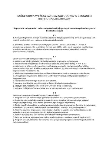 PAŃSTWOWA WYŻSZA SZKOŁA ZAWODOWA W GŁOGOWIE INSTYTUT POLITECHNICZNY Regulamin odbywania i zaliczania studenckich praktyk zawodowych w Instytucie Politechnicznym §1 1. Niniejszy Regulamin praktyk studenckich (zwany dalej Regulaminem), określa organizację i tok praktyk studenckich oraz związane z nią prawa i obowiązki. 2. Podstawą prawną studenckich praktyk jest ustawa z dnia 27 lipca 2005 r. - Prawo o szkolnictwie wyższym (Dz. U. z 2005 r. Nr 164, poz. 1365 z późn. zm.), regulamin studiów oraz standardy kształcenia oraz plany studiów i programy nauczania na kierunkach studiów prowadzonych w Uczelni. §2 Celem studenckich praktyk zawodowych jest: a. poszerzenie wiedzy zdobytej na studiach oraz jej praktyczne zastosowanie b. kształtowanie umiejętności niezbędnych w przyszłej pracy zawodowej, w tym m.in. umiejętności: analitycznych, organizacyjnych, pracy w zespole, nawiązywania kontaktów, prowadzenia negocjacji, a także przygotowanie studenta do samodzielności i odpowiedzialności za powierzone mu zadania, itp. c. wieloaspektowe zapoznanie się z profilem działania instytucji przyjmującej praktykanta, d. umiejętność integrowania posiadanej wiedzy teoretycznej z praktyką życia społeczno – gospodarczego, e. rozwijanie samodzielnego działania praktykanta, f. poznanie standardów specyfiki pracy w danym środowisku zawodowym, g. zdobycie doświadczeń pomocnych przy wyborze drogi zawodowej, h. zebranie doświadczeń i materiałów pomocnych przy pisaniu pracy dyplomowej. §3 Założenia i program studenckich praktyk zawodowych. a. Program praktyk powinien być zgodny z kierunkiem oraz specjalizacją/specjalnością. b. Student może zostać skierowany na praktykę przez Uczelnię lub samodzielnie wskazać instytucję/organizację, która wyrazi gotowość jego przyjęcia na praktykę. c. Zgodę na odbycie praktyki w wybranym przez studenta miejscu wyraża Dyrektor Instytutu pod warunkiem, że charakter wykonywanej działalności jest zgodny z programem praktyki. d. Praktyka powinna odpowiadać charakterowi studiów w Uczelni oraz być dostosowana do kierunku oraz specjalizacji/specjalności wybranej przez studenta. e. Termin realizacji oraz czas trwania praktyki zawodowej określa plan studiów. f. Dyrektor Instytutu wyznacza nauczyciela akademickiego – opiekuna praktyk studenckich. g. Program praktyk, stosowny do kierunku oraz specjalizacji/specjalności otrzymuje student od opiekuna praktyk . §4 Organizacja studenckich praktyk zawodowych. a. Studenckie praktyki zawodowe mogą być podejmowane przez studentów, którzy ukończyli pierwszy rok studiów, praktyki powinny być zrealizowane do końca VI semestru. b. Praktyka może być odbywana w wybranym przez studenta podmiocie gospodarczym lub instytucji, w kraju lub za granicą, której profil działania umożliwia studentowi zrealizowanie celów opisanych w § 2. c. Podstawą odbywania studenckiej praktyki zawodowej jest porozumienie (umowa) o współpracy w realizacji studenckich praktyk zawodowych zawarte pomiędzy Uczelnią a właściwą instytucją. d. Porozumienie (umowa) podpisywane jest w dwóch jednobrzmiących egzemplarzach po jednym dla każdej ze stron. e. Poświadczenie realizacji studenckich praktyk zawodowych odbywa się na podstawie stosownych dokumentów które dostarcza opiekun praktyk f. Dokumentację dotyczącą praktyk stanowiącą podstawę zaliczenia praktyk stanowią: dziennik praktyk lub w uzasadnionych przypadkach po uzyskaniu uprzedniej zgody Dyrektora Instytutu zaświadczenie o zrealizowanych praktykach studenckich, ewentualnie zaświadczenie potwierdzające realizowanie pracy zawodowej. §5 Do obowiązków studenta należy w szczególności: a. zapoznanie się z zasadami odbywania praktyki zawodowej, b. sumienność i staranność w wykonywaniu powierzonych w trakcie trwania praktyki obowiązków, c. student prowadzi na bieżąco dokumentację w dzienniku praktyk, w postaci co tygodniowych zapisów czynności wykonywanych podczas praktyki potwierdzoną pieczątką Zakładu Pracy i podpisem opiekuna praktyki z ramienia Zakładu Pracy. d. dostarczenie opiekunowi praktyk dzienniczka praktyk studenckich, w którym potwierdzone jest odbycie studenckiej praktyki zawodowej w terminie 14 dni od jej zakończenia, e. przestrzeganie ustalonego przez organizatora praktyki porządku i dyscypliny pracy f. przestrzeganie zasad BHP i ochrony przeciwpożarowej g. przestrzeganie zasad zachowania tajemnicy służbowej i państwowej oraz ochrony poufności danych w zakresie określonym przez organizatora praktyk. h. na czas odbywania praktyki student ma obowiązek ubezpieczenia od następstw nieszczęśliwych wypadków NNW. Koszty tego ubezpieczenia pokrywa student. §6 1. W wypadku, gdy student w sposób rażący naruszy dyscyplinę pracy lub nie dostosuje się do wymogów podyktowanych charakterem i funkcją instytucji, strona przyjmująca studenta na praktykę może żądać od Uczelni odwołania studenta z praktyki. 2. Obowiązki instytucji przyjmującej studenta na praktykę: a. zapewnienie warunków niezbędnych do przeprowadzenia praktyki zgodnie z postanowieniami umowy zawartej z Uczelnią, b. zapewnienie studentowi odpowiednich warunków lokalowych, c. zapoznanie studenta z przepisami BHP ora z wymogami dotyczącymi funkcjonowania instytucji, d. wyznaczenie dla studenta opiekuna praktyki z odpowiednim doświadczeniem zawodowym. §7 1. Zasady zaliczenia studenckich praktyk zawodowych. a. Warunkiem zaliczenia praktyki jest złożenie przez studenta dziennika praktyk opisującego przebieg praktyki i realizowane zadania. b. Niezaliczenie obowiązkowej studenckiej praktyki zawodowej jest równoznaczne z niezaliczeniem semestru. c. Jako praktykę Dyrektor Instytutu może zaliczyć: - zatrudnienie studenta w kraju lub za granicą, jeśli charakter pracy spełnia wymogi programu praktyki; - udział studenta w obozie naukowym o profilu zgodnym z programem praktyki; - inne formy aktywności z