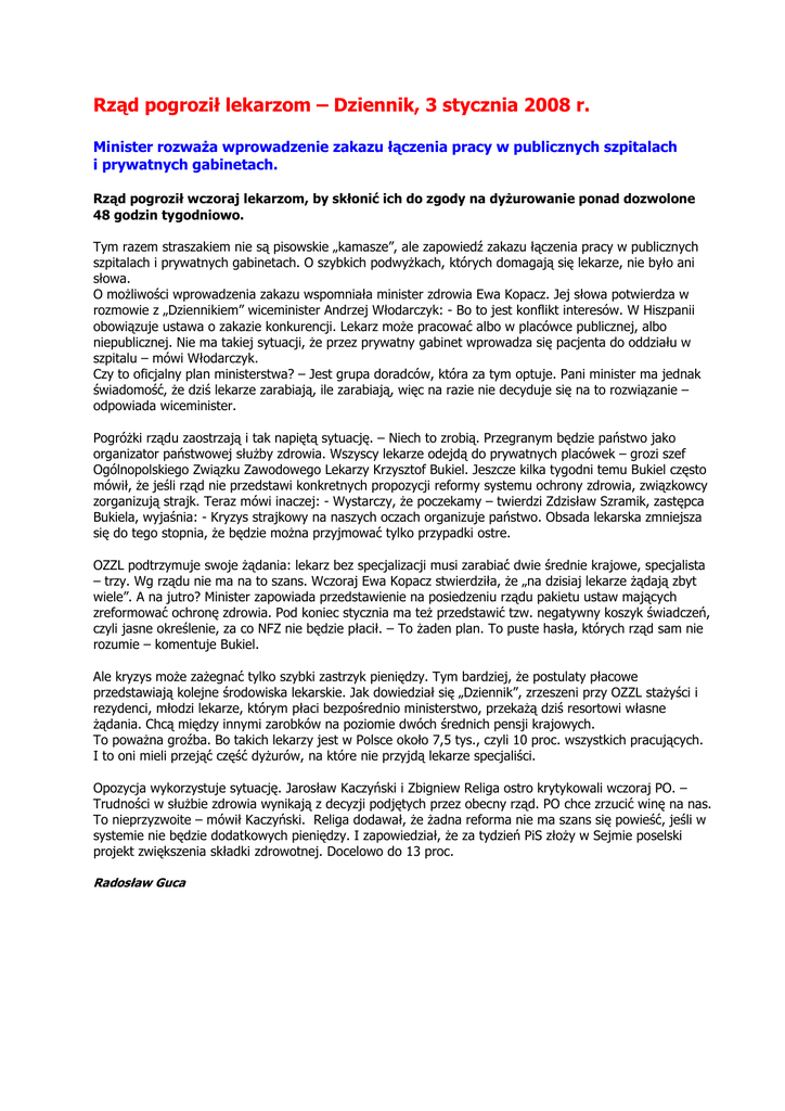 Rząd pogroził lekarzom – Dziennik, 3 stycznia 2008 r. Minister rozwaŜa wprowadzenie zakazu łączenia pracy w publicznych szpitalach i prywatnych gabinetach. Rząd pogroził wczoraj lekarzom, by skłonić ich do zgody na dyŜurowanie ponad dozwolone 48 godzin tygodniowo. Tym razem straszakiem nie są pisowskie „kamasze”, ale zapowiedź zakazu łączenia pracy w publicznych szpitalach i prywatnych gabinetach. O szybkich podwyŜkach, których domagają się lekarze, nie było ani słowa. O moŜliwości wprowadzenia zakazu wspomniała minister zdrowia Ewa Kopacz. Jej słowa potwierdza w rozmowie z „Dziennikiem” wiceminister Andrzej Włodarczyk: - Bo to jest konflikt interesów. W Hiszpanii obowiązuje ustawa o zakazie konkurencji. Lekarz moŜe pracować albo w placówce publicznej, albo niepublicznej. Nie ma takiej sytuacji, Ŝe przez prywatny gabinet wprowadza się pacjenta do oddziału w szpitalu – mówi Włodarczyk. Czy to oficjalny plan ministerstwa? – Jest grupa doradców, która za tym optuje. Pani minister ma jednak świadomość, Ŝe dziś lekarze zarabiają, ile zarabiają, więc na razie nie decyduje się na to rozwiązanie – odpowiada wiceminister. PogróŜki rządu zaostrzają i tak napiętą sytuację. – Niech to zrobią. Przegranym będzie państwo jako organizator państwowej słuŜby zdrowia. Wszyscy lekarze odejdą do prywatnych placówek – grozi szef Ogólnopolskiego Związku Zawodowego Lekarzy Krzysztof Bukiel. Jeszcze kilka tygodni temu Bukiel często mówił, Ŝe jeśli rząd nie przedstawi konkretnych propozycji reformy systemu ochrony zdrowia, związkowcy zorganizują strajk. Teraz mówi inaczej: - Wystarczy, Ŝe poczekamy – twierdzi Zdzisław Szramik, zastępca Bukiela, wyjaśnia: - Kryzys strajkowy na naszych oczach organizuje państwo. Obsada lekarska zmniejsza się do tego stopnia, Ŝe będzie moŜna przyjmować tylko przypadki ostre. OZZL podtrzymuje swoje Ŝądania: lekarz bez specjalizacji musi zarabiać dwie średnie krajowe, specjalista – trzy. Wg rządu nie ma na to szans. Wczoraj Ewa Kopacz stwierdziła, Ŝe „na dzisiaj lekarze Ŝądają zbyt wiele”. A na jutro? Minister zapowiada przedstawienie na posiedzeniu rządu pakietu ustaw mających zreformować ochronę zdrowia. Pod koniec stycznia ma teŜ przedstawić tzw. negatywny koszyk świadczeń, czyli jasne określenie, za co NFZ nie będzie płacił. – To Ŝaden plan. To puste hasła, których rząd sam nie rozumie – komentuje Bukiel. Ale kryzys moŜe zaŜegnać tylko szybki zastrzyk pieniędzy. Tym bardziej, Ŝe postulaty płacowe przedstawiają kolejne środowiska lekarskie. Jak dowiedział się „Dziennik”, zrzeszeni przy OZZL staŜyści i rezydenci, młodzi lekarze, którym płaci bezpośrednio ministerstwo, przekaŜą dziś resortowi własne Ŝądania. Chcą między innymi zarobków na poziomie dwóch średnich pensji krajowych. To powaŜna groźba. Bo takich lekarzy jest w Polsce około 7,5 tys., czyli 10 proc. wszystkich pracujących. I to oni mieli przejąć część dyŜurów, na które nie przyjdą lekarze specjaliści. Opozycja wykorzystuje sytuację. Jarosław Kaczyński i Zbigniew Religa ostro krytykowali wczoraj PO. – Trudności w słuŜbie zdrowia wynikają z decyzji podjętych przez obecny rząd. PO chce zrzucić winę na nas. To nieprzyzwoite – mówił Kaczyński. Religa dodawał, Ŝe Ŝadna reforma nie ma szans się powieść, jeśli w systemie nie będzie dodatkowych pieniędzy. I zapowiedział, Ŝe za tydzień PiS złoŜy w Sejmie poselski projekt zwiększenia składki zdrowotnej. Docelowo do 13 proc. Radosław Guca