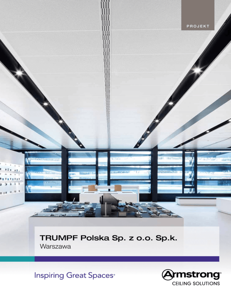PROJEKT TRUMPF Polska Sp. z o.o. Sp.k. Warszawa Inwestor, będąc ekspertem w obróbce metalu, chciał zastosować sufity metalowe najwyższej jakości. W naturalny sposób wybór padł na firmę Armstrong. Architekt zaproponował sufit metalowy, prosty w formie, z uporządkowanymi elementami serwisowymi i z pełnym dostępem do przestrzeni ponadsufitowej. Idealny okazał się system prostokątnych płyt Metal R-Clip z płytami o różnych wymiarach. Mając na względzie konieczność zapewnienia komfortu akustycznego pracowników, płyty są perforowane i z flizeliną akustyczną Inwestorowi zależało na wyróżnieniu sali ekspozycyjnej, gdzie wystawiono sprzęt sprzedawany przez firmę Trumpf. Architekt, w porozumieniu z firmą Armstrong zaprojektował sufit nieciągły w formie dużych sufitów wyspowych wykończonych specjalnie zaprojektowanymi listwami o szerokości 100mm z płytami kwadratowymi i prostokątnymi w systemie Clip-In w kolorze RAL9006. Efekt końcowy usatysfakcjonował wszystkie zaangażowane strony. Właściciel TRUMPF Polska Sp. z o.o. Sp.k. Główny architekt BERKOW LEIBINGER Architekt Artchitecture Nowoczesny wygląd, nowoczesna technologia i komfort akustyczny Firma TRUMPF to jedno z czołowych przedsiębiorstw w branży technologicznej na świecie, gwarantujące jakość, doskonałe produkty i wysoko wydajne procesy. TRUMPF to synonim innowacji. Rozwój firmy związany jest z fascynacją technicznymi osiągnięciami najwyższej klasy, co przekłada się na dodatkowe wartości dla klientów. Dla firmy Trumpf nie bez znaczenia jest ochrona środowiska naturalnego i zdrowia ludzi. Dlatego zawsze stosuje najlepsze technologie w celu uniknięcia szkodliwych konsekwencji swojej działalności gospodarczej. Planując swoją nową siedzibę inwestor kierował się tymi samymi wartościami, którymi firma kieruje się na co dzień. Będąc firmą specjalizującą się w technologii laserowej i obróbce metalu, również w swojej siedzibie chciała zastosować sufity metalowe najwyższej jakości. Projekt zakładał monolityczny, czysty wygląd, funkcjonlaność systemu i łatwy dostęp do przestrzeni powyżej sufitu. Dbając o swoich pracowników, inwestor chciał również zapewnić im komfort akustyczny, tak, by najefektywniej i bez uszczerbku na samopoczuciu i zdrowiu mogli przebywać w swoim miejscu pracy. Będąc firmą rodzinną inwestor przede wszystkim ceni w firmach, z którymi współpracuje, rzetelność, zaufanie, profesjonalizm. W przypadku sufitów podwieszanych inwestor wskazał firmę Armstrong jako kooperanta. Sufity Metal R-Clip Rg2516 z flizeliną RAL9010, 1500.00 x 600.00 – 57,60m2 Metal R-Clip Rg2516 z flizeliną RAL9010, 1800.00 x 600.00 – 684,72 m2 Metal R-Clip Rg2516 z flizeliną RAL9010, 2100.00 x 600.00 – 18,90m2 Metal R-Clip Rg2516 z flizeliną RAL9010, 1660.00 x 600.00 Metal F-L 601 Rg2516 z flizeliną RAL9010, 2100.00 x 600.00 – 99,54 m2 Metal F-L 601 Rg2516 z flizeliną RAL9010, 1500.00 x 600.00 -41,4m2 Sufity wyspowe wykończone listwami o szerokości 100mm z płytami: Metal R-Clip Rg4022 z flizeliną RAL9006, 1270.00 x 600.00 – 128,78 m2 Metal Q-Clip Rg4022 z flizeliną RAL9006, 600x600 - 20,16 m2 Metal R-Clip Rg4022 z flizeliną RAL9006, 785.00 x 600.00 – 52,75 m2 Systemy zawieszenia Profil przyścienny RA9F RAL9006 – 10 szt. Specjalny Bandraster 3600x300, RAL9005 – 32,40 mb Specjalny profil brzegowy 1800x100x30, RAL9006, nieperforowany – 194,40 mb METAL R-Clip METAL F-L 601 Więcej znajdziesz w Galerii Projektów Armstrong Building Products BV Sp. z o.o. Oddział w Polsce ul. Domaniewska 37 02-672 Warszawa Polska Tel. (+48) 22 337 86 10/11 Fax (+48) 22 337 86 12 [email protected] www.armstrongsufity.pl 11/2016 - Armstrong World Industries - RCS Besançon B 784 131 575 METAL Q-Clip