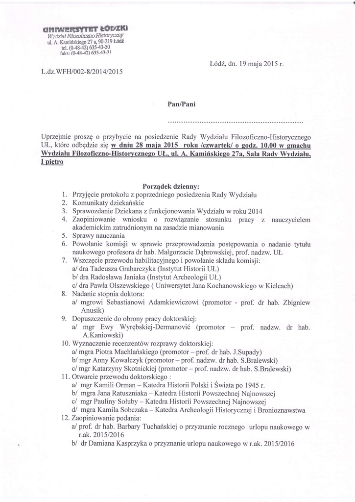 t|nnfftfrlt'lllt Lot zKl WjdzialFilozoficmollistorycmY. a,9L2l9t'&t il. e. Xanirn*iesoz? tcl.(048J2)63543-50 feks:'(04842) 6354?-?1 N-6d2, dn. 19 maja20l5 r. L.dz.WFH/002-8I20I 4I20| 5 Pan/Pani Uprzejmieproszgo przybycie na posiedzenieRady Wydzialu Filozoficzno-Historycznego Utr-,kt6re odbgdziesig w dniu 28 maia 2015 roku /cnvartek/ o sodz. 10.00w, smachu Wvdzialu Filozoficzno-Historycznego UI,. ul. A. Kamifiskieso 27a. Sala Rady Wvdzialu. I pietro Porz4dekdzienny: posiedzenia Przyjgcieprotokoluzpoprzedniego RadyWydzialu Komunikatydziekanskie Sprawozdanie Dziekanaz funkcjonowaniaWydzialuw roku 2014 Zaopiniowanie wniosku o rozwiryanie stosunku pracy z nauczycielem akademickimzatrudnionymna zasadzie mianowania 5. Sprawynauczania 6. Powolaniekomisji w sprawieprzeprowadzenia postgpowaniao nadanietytulu naukowegoprofesoradr hab.MalgorzacieD4browskiej,prof. nadzw.Utrprzewoduhabilitacyjnego 7. Wszczgcie i powolanieskladukomisji: (InstytutHistorii Utr) al draTadeuszaGrabarczyka bl draRadoslawa Janiaka(InstytutArcheologiiUL) ( UniwersytetJanaKochanowskiego cl draPawlaOlszewskiego w Kielcach) 8. Nadaniestopniadoktora: a/ mgrowi SebastianowiAdamkiewiczowi(promotor - prof. dr hab. Zbigniew Anusik) 9. Dopuszczenie do obronypracydoktorskiej: al mgr Ewy Wyrgbskiej-Dermanovii(promotor prof. nadzw. dr hab. A.Kaniowski) I 0. Wyznaczenierecenzent6w rozprary doktorskiej: (promotor-prof. dr hab.J.Supady) al mgraPiotraMachlanskiego b/ mgr Arury Kowalczyk(promotor- prof. nadzw.dr hab.S.Bralewski) c/ mgr KataruynySkotnickiej(promotor- prof. nadzw.dr hab.S.Bralewski) 1l. Otwarcieprzewodudoktorskiego: al mgrKamili Orman- KatedraHistorii Polskii Swiatapo 1945r. b/ mgraJanaRatuszniaka-KatedraHistorii Powszechnej Najnowszej c/ mgr PaulinySoluby KatedraHistorii Powszechnej Najnowszej - KatedraArcheologiiHistoryczneji Bronioznawstwa dl mgraKamila Sobczaka 12.Zaopiniowanie podania: a/ prof. dr hab. BarbaryTuchanskiejo przyznanierocznegourlopunaukowegow r.ak.20l512016 b/ dr DamianaKasprzykaoprzyznanieurlopunaukowegow r.ak. 201512016 1. 2. 3. 4. 13.ZaopiniowaniepismaInstytutuArcheologiio rozpisaniekonkursuna zatrudnienie pracownika naukowego w Pracowni datowania termoluminiscencyjnego od r.ak.20l5l20I6 14.Wolnewnioski Dziekan Wydzialu Filo zoficzno-Hi storycznego Uniwersytetutr6dzkiego Prof.dr hab. ZbisniewAnusik