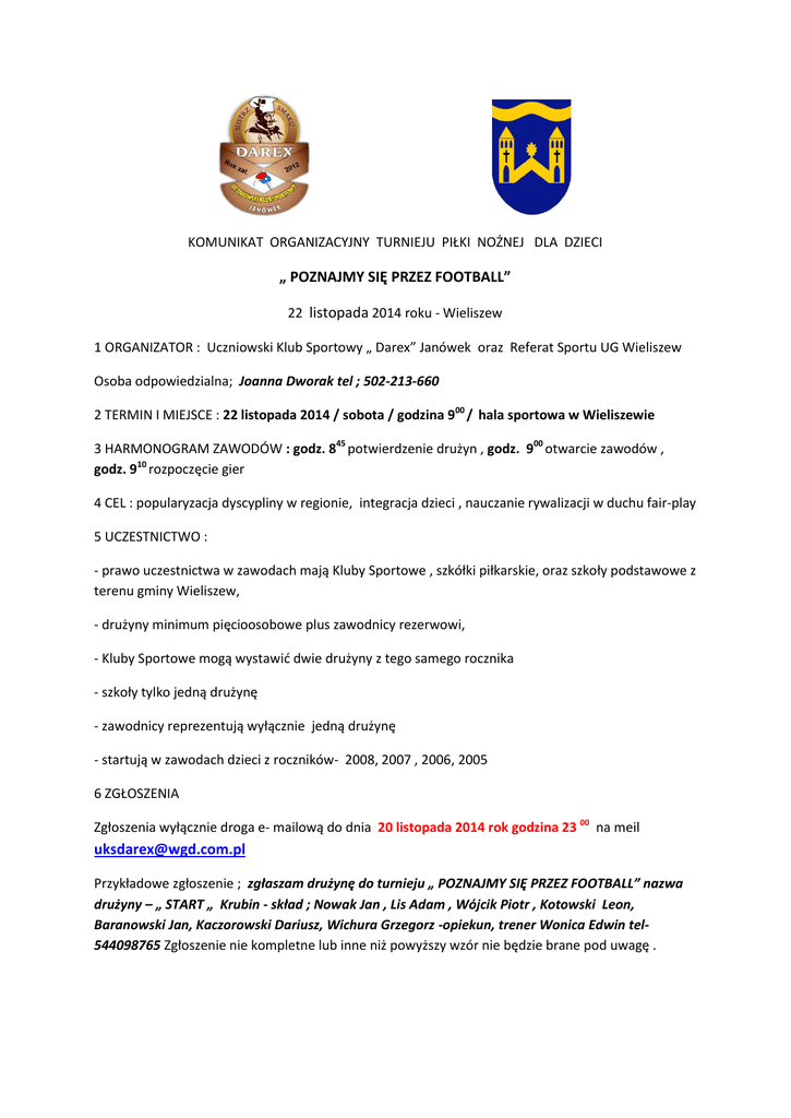 KOMUNIKAT ORGANIZACYJNY TURNIEJU PIŁKI NOŻNEJ DLA DZIECI „ POZNAJMY SIĘ PRZEZ FOOTBALL” 22 listopada 2014 roku - Wieliszew 1 ORGANIZATOR : Uczniowski Klub Sportowy „ Darex” Janówek oraz Referat Sportu UG Wieliszew Osoba odpowiedzialna; Joanna Dworak tel ; 502-213-660 2 TERMIN I MIEJSCE : 22 listopada 2014 / sobota / godzina 900 / hala sportowa w Wieliszewie 3 HARMONOGRAM ZAWODÓW : godz. 845 potwierdzenie drużyn , godz. 900 otwarcie zawodów , godz. 910 rozpoczęcie gier 4 CEL : popularyzacja dyscypliny w regionie, integracja dzieci , nauczanie rywalizacji w duchu fair-play 5 UCZESTNICTWO : - prawo uczestnictwa w zawodach mają Kluby Sportowe , szkółki piłkarskie, oraz szkoły podstawowe z terenu gminy Wieliszew, - drużyny minimum pięcioosobowe plus zawodnicy rezerwowi, - Kluby Sportowe mogą wystawid dwie drużyny z tego samego rocznika - szkoły tylko jedną drużynę - zawodnicy reprezentują wyłącznie jedną drużynę - startują w zawodach dzieci z roczników- 2008, 2007 , 2006, 2005 6 ZGŁOSZENIA Zgłoszenia wyłącznie droga e- mailową do dnia 20 listopada 2014 rok godzina 23 00 na meil [email protected] Przykładowe zgłoszenie ; zgłaszam drużynę do turnieju „ POZNAJMY SIĘ PRZEZ FOOTBALL” nazwa drużyny – „ START „ Krubin - skład ; Nowak Jan , Lis Adam , Wójcik Piotr , Kotowski Leon, Baranowski Jan, Kaczorowski Dariusz, Wichura Grzegorz -opiekun, trener Wonica Edwin tel544098765 Zgłoszenie nie kompletne lub inne niż powyższy wzór nie będzie brane pod uwagę . 7 SYSTEM ROZGRYWEK Mecze w dwóch grupach A i B , kluby które wystawią do zawodów dwie drużyny będą w fazie eliminacji grad w innych grupach. Czas meczu bez zmiany boisk 10 minut ilośd zmian rezerwowych zawodników dowolna ale, nie w czasie gry lub trwania akcji , zmiana zawodnika za pozwoleniem sędziego. Finałowe rozgrywki drużyny A1 z B2 oraz A2 z B1 zwycięzcy grają finał przegrani o miejsce 3. Drużyna to : bramkarz i 4 zawodników w polu . Punktacja w grupach- zwycięstwo 2 pkt. remis 1 pkt. porażka 0 pkt. W przypadku takiej samej ilości punktów stosunek strzelonych bramek, ewentualnie bezpośredni pojedynek. Półfinał i finał oraz mecz o trzecie miejsce; po remisie w 10 minutowym czasie meczu po 3 rzuty karne , o ile to nie wyłoni zwycięzcy po 2 rzuty karne o ile to nie wyłoni zwycięzcy karne do pierwszego błędu drużyny tzw. złota bramka. Karne może strzelad każdy zawodnik z drużyny po drugiej kolejce karnych przy tkzw złotej bramce można powtórzyd zawodnika ale tylko raz. W zależności od ilości zgłoszonych drużyn system rozgrywek może ulec zmianie w trakcie wspólnej narady organizatora i koordynatora z trenerami i opiekunami drużyn. 8 SPRAWY FINANSOWE Koszt zawodów finansowany ze środków UG Wieliszew. Drużyny dojeżdżają na własny koszt. Uczestnicy nie wnoszą jakichkolwiek opłat . Dla zawodników będzie zabezpieczona woda mineralna. 9 NAGRODY Puchary, dyplomy , nagrody dla pierwszych trzech drużyn 10 INNE SPRAWY Referat sportu UG Wieliszew zabezpiecza obsadę sędziowską i opiekę medyczną . Organizator zawodów nie ubezpiecza zawodników , drużyn, trenerów , opiekunów od następstw nieszczęśliwych wypadków. Koordynator zawodów – Tadeusz Szczygielski tel; 22/782-21-44