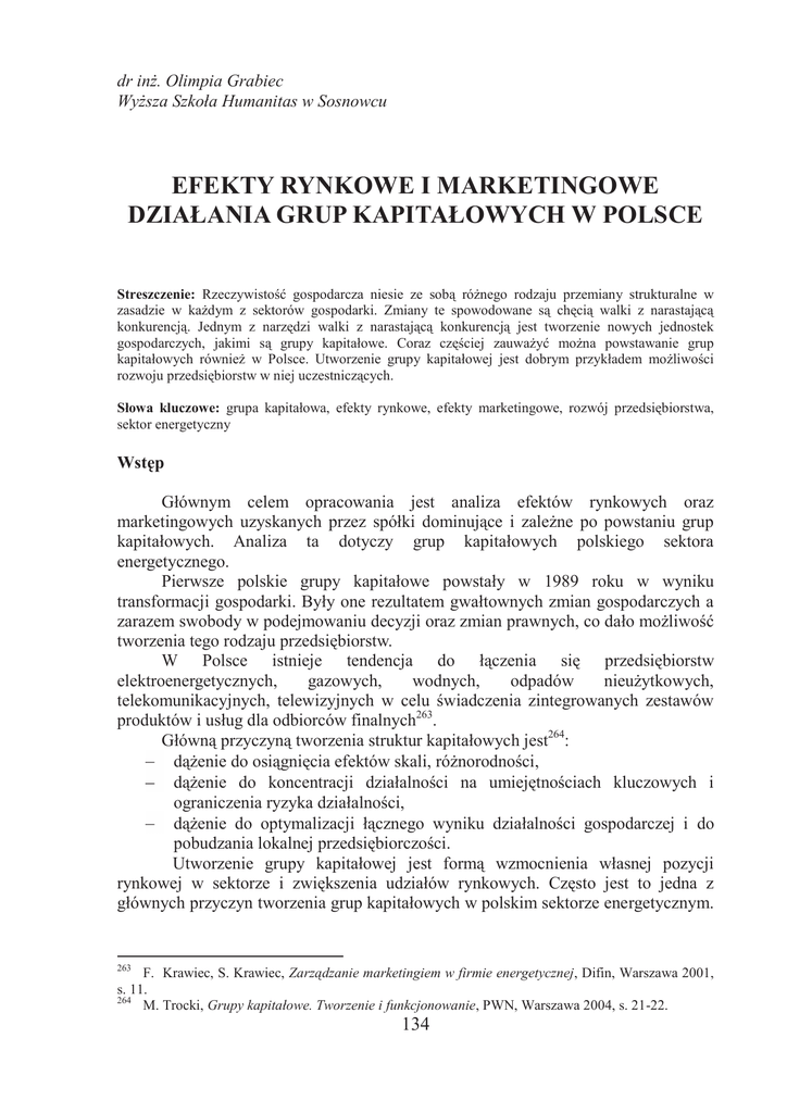 dr inż. Olimpia Grabiec Wyższa Szkoła Humanitas w Sosnowcu EFEKTY RYNKOWE I MARKETINGOWE DZIAŁANIA GRUP KAPITAŁOWYCH W POLSCE Streszczenie: Rzeczywistość gospodarcza niesie ze sobą różnego rodzaju przemiany strukturalne w zasadzie w każdym z sektorów gospodarki. Zmiany te spowodowane są chęcią walki z narastającą konkurencją. Jednym z narzędzi walki z narastającą konkurencją jest tworzenie nowych jednostek gospodarczych, jakimi są grupy kapitałowe. Coraz częściej zauważyć można powstawanie grup kapitałowych również w Polsce. Utworzenie grupy kapitałowej jest dobrym przykładem możliwości rozwoju przedsiębiorstw w niej uczestniczących. Słowa kluczowe: grupa kapitałowa, efekty rynkowe, efekty marketingowe, rozwój przedsiębiorstwa, sektor energetyczny Wstęp Głównym celem opracowania jest analiza efektów rynkowych oraz marketingowych uzyskanych przez spółki dominujące i zależne po powstaniu grup kapitałowych. Analiza ta dotyczy grup kapitałowych polskiego sektora energetycznego. Pierwsze polskie grupy kapitałowe powstały w 1989 roku w wyniku transformacji gospodarki. Były one rezultatem gwałtownych zmian gospodarczych a zarazem swobody w podejmowaniu decyzji oraz zmian prawnych, co dało możliwość tworzenia tego rodzaju przedsiębiorstw. W Polsce istnieje tendencja do łączenia się przedsiębiorstw elektroenergetycznych, gazowych, wodnych, odpadów nieużytkowych, telekomunikacyjnych, telewizyjnych w celu świadczenia zintegrowanych zestawów produktów i usług dla odbiorców finalnych263. Główną przyczyną tworzenia struktur kapitałowych jest264: dążenie do osiągnięcia efektów skali, różnorodności, dążenie do koncentracji działalności na umiejętnościach kluczowych i ograniczenia ryzyka działalności, dążenie do optymalizacji łącznego wyniku działalności gospodarczej i do pobudzania lokalnej przedsiębiorczości. Utworzenie grupy kapitałowej jest formą wzmocnienia własnej pozycji rynkowej w sektorze i zwiększenia udziałów rynkowych. Często jest to jedna z głównych przyczyn tworzenia grup kapitałowych w polskim sektorze energetycznym. 263 F. Krawiec, S. Krawiec, Zarządzanie marketingiem w firmie energetycznej, Difin, Warszawa 2001, s. 11. 264 M. Trocki, Grupy kapitałowe. Tworzenie i funkcjonowanie, PWN, Warszawa 2004, s. 21-22. 134 W ciągu ostatnich lat następuje coraz częstsze powstawanie grup kapitałowych w polskim sektorze energetycznym. Utworzenie grup kapitałowych w polskim sektorze energetycznym przynosi wiele korzyści. Ich utworzenie daje przede wszystkim możliwość wzmocnienia pozycji rynkowej przedsiębiorstw je tworzących, jak również powoduje zwiększenie udziału w rynku. 1. Transformacja polskiego sektora energetycznego Do końca lat osiemdziesiątych gospodarowanie w energetyce przemieniało się z w pełni planowanego koordynowania działalności przedsiębiorstw energetycznych (Ustawa o planowej gospodarce energetycznej – 1947 r.) poprzez kolejne modyfikacje, które oznaczały zwiększanie autonomii tych przedsiębiorstw potwierdzonej Ustawą o gospodarce energetycznej z 1984 roku265. Ostatnie lata w sektorze energetycznym to okres poważnych zmian. Przekształcenia w krajowej energetyce rozpoczęły się na początku lat 90. i miały one dostosować sektor do warunków panujących na światowych rynkach. Jednakże przełom transformacyjny lat dziewięćdziesiątych w dużym stopniu oznaczał dla energetyki kontynuację zapoczątkowanego wcześniej trendu. Przemiany strukturalne w sektorze energetycznym poszły w kierunku tworzenia nowych, strategicznych jednostek koncentrujących się na usługach dla odbiorców, masowej konsolidacji i wzrostu koncentracji. Przede wszystkim zwiększyła się samodzielność zakładów energetycznych i wielu elektrociepłowni poprzez przekształcenie ich z przedsiębiorstw państwowych w jednoosobowe spółki Skarbu Państwa. Aktualnie sektor energetyczny poddany jest regulacji na mocy Ustawy Prawo energetyczne z dnia 10 kwietnia 1997 roku z późniejszymi zmianami. W ostatnich latach to globalizacja była i jest główną przyczyną powodującą, że większość polskich przedsiębiorstw energetycznych zmierza do utworzenia grup kapitałowych. Prowadzone od początku lat dziewięćdziesiątych prace związane z sektorem energetycznym zaowocowały uchwaleniem 10 kwietnia 1997 roku przez Sejm RP ustawy Prawo energetyczne266, która to obowiązuje do dzisiaj (z późniejszymi zmianami). Ustawa ta stanowi najwyższy poziom obowiązującej regulacji tego sektora. Ustawa Prawo energetyczne reguluje działalność gospodarczą w zakresie nośników energii, jednak z wyłączeniem węgla kamiennego, który podlega regulacjom ustawy z dnia 4 lutego 1994 roku (z późniejszymi zmianami) – Prawo geologiczne i górnicze267. Zaraz po ustawie Prawo energetyczne znajdują się akty wykonawcze do ustawy wydawane przez Radę Ministrów, Prezesa Rady Ministrów i Ministra Gospodarki. Istnieją także regulacje indywidualne wykonywane przez Prezesa URE. Dnia 4 stycznia 2005 roku Rada Ministrów przyjęła dokument rządowy: Polityka energetyczna Polski do 2025 roku. W dokumencie tym zostały wyznaczone długoterminowe kierunki działań do 2025 roku, pakiet zadań wykonawczych do 2008 265 A. Dobroczyńska, L. Juchniewicz, B. Zaleski, Regulacja energetyki w Polsce, Wydawnictwo Adam Marszałek, Warszawa – Toruń 2001, s. 36. 266 Dz.U. Nr 54, poz. 348, z późn. zm. 267 Dz.U. Nr 27, poz. 96, z późn. zm. 135 roku oraz odpowiedzialni za realizację tych zadań. Jednakże zawarte tutaj zamierzenia wymagają narzędzi prawnych, instytucjonalnych i środków finansowych. Konieczne tutaj jest również kształtowanie warunków umożliwiających powstanie konkurencyjnych podmiotów na rynkach paliw i energii – procesy restrukturyzacji w tym sektorze będą zmierzać do budowy silnych podmiotów, o stabilnej kondycji ekonomicznej i technicznej, zdolnych 