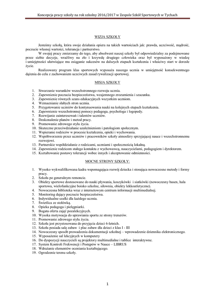 Koncepcja pracy szkoły na rok szkolny 2016/2017 w Zespole Szkół Sportowych w Tychach WIZJA SZKOŁY Jesteśmy szkołą, która swoje działania opiera na takich wartościach jak: prawda, uczciwość, mądrość, poczucie własnej wartości, tolerancja i partnerstwo. W swojej pracy zmierzamy do tego, aby absolwent naszej szkoły był odpowiedzialny za podejmowane przez siebie decyzje, wrażliwy na zło i krzywdę drugiego człowieka oraz był wyposażony w wiedzę i umiejętności ułatwiające mu osiąganie sukcesów na dalszych etapach kształcenia i właściwy start w dorosłe życie. Realizowany program klas sportowych wyposaża naszego ucznia w umiejętność konsekwentnego dążenia do celu z zachowaniem uczciwych zasad rywalizacji sportowej. MISJA SZKOŁY 1. 2. 3. 4. 5. 6. 7. 8. 9. 10. 11. 12. Stwarzanie warunków wszechstronnego rozwoju ucznia. Zapewnienie poczucia bezpieczeństwa, wzajemnego zrozumienia i szacunku. Zapewnienie równych szans edukacyjnych wszystkim uczniom. Wzmacnianie słabych stron ucznia. Przygotowanie uczniów do kontynuowania nauki na kolejnych etapach kształcenia. Zapewnienie wszechstronnej pomocy pedagoga, psychologa i logopedy. Rozwijanie zainteresowań i talentów uczniów. Doskonalenie planów i metod pracy. Promowanie zdrowego stylu życia. Skuteczne przeciwdziałanie uzależnieniom i patologiom społecznym. Wspieranie rodziców w procesie kształcenia, opieki i wychowania. Współtworzenie przez uczniów i pracowników szkoły atmosfery sprzyjającej nauce i wszechstronnemu rozwojowi. 13. Partnerskie współdziałanie z rodzicami, uczniami i społecznością lokalną. 14. Zapewnienie rodzicom stałego kontaktu z wychowawcą, nauczycielami, pedagogiem i dyrektorem. 15. Kształtowanie postawy tolerancji wobec innych i akceptowanie odmienności. MOCNE STRONY SZKOŁY: 1. 2. 3. 4. 5. 6. 7. 8. 9. 10. 11. 12. 13. 14. 15. 16. 17. 18. 19. Wysoko wykwalifikowana kadra wspomagająca rozwój dziecka i stosująca nowoczesne metody i formy pracy. Szkoła po generalnym remoncie. Obiekty sportowe dostosowane do nauki pływania, koszykówki i siatkówki (nowoczesny basen, hala sportowa, wielofunkcyjne boisko szkolne, siłownia, obiekty lekkoatletyczne). Nowoczesna biblioteka wraz z internetowym centrum informacji multimedialnej. Monitoring dający poczucie bezpieczeństwa. Indywidualne szafki dla każdego ucznia. Świetlica ze stołówką. Opieka pedagoga i pielęgniarki. Bogata oferta zajęć pozalekcyjnych. Wysoka motywacja do uprawiania sportu ze strony trenerów. Promowanie zdrowego stylu życia. Szkoła jest przystosowana do przyjęcia dzieci 6-letnich. Szkoła posiada salę zabaw i plac zabaw dla dzieci z klas I - III Nowoczesny sposób prowadzenia dokumentacji szkolnej – wprowadzenie dziennika elektronicznego. Wyposażenie sal lekcyjnych w komputery Do dyspozycji nauczycieli są projektory multimedialne i tablice interaktywne. System Kontroli Frekwencji i Postępów w Nauce – LIBRUS Wdrażanie elementów oceniania kształtującego. Ogrodzenie terenu szkoły. 1 Koncepcja pracy szkoły na rok szkolny 2016/2017 w Zespole Szkół Sportowych w Tychach I. Cel rozwojowy: Organizacja szkoły jako nowoczesnej placówki oświatowej na miarę XXI wieku. Cele szczegółowe 1. Nowoczesne planowanie i organizowanie pracy edukacyjnej i wychowawczoopiekuńczej szkoły. Procedury osiągania celów 1. Ewaluacja i wprowadzanie zmian w planach i regulaminach funkcjonujących w placówce. 2. Promocja szkoły w środowisku: rozbudowanie, uatrakcyjnienie i bieżące aktualizowanie strony internetowej, nawiązanie współpracy z prasą lokalną. Diagnozowanie takich obszarów szkoły jak: dyrektor kształcenie, opieka i wychowanie. 4. Opracowanie tematyki nadzoru pedagogicznego dyrektor i narzędzi do hospitacji diagnozującej. 5. Kontynuacja działań zmierzających do poprawy nauki i pracy w szkole poprzez: przestrzeganie zasad BHP, monitorowanie funkcjonowania szkoły, dyrektor zapewnienie bezpieczeństwa dzieciom w nauczyciele trakcie pobytu w szkole (monitoring, dyżury nauczycieli, identyfikatory),szczególne zwrócenie uwagi na bezpieczeństwo sześciolatków w szkole troska o mienie szkoły. 2. 3. 2. Doskonalenie zawodowe nauczycieli. Diagnoza potrzeb w zakresie doskonalenia zawodowego. Podnoszenie kwalifikacji przez udział w studiach podyplomowych, kursach kwalifikacyjnych, szkoleniach i warsztatach, ze szczególnym uwzględnieniem kursów i szkoleń dotyczących nowej podstawy programowej oraz pracy z dzieckiem sześcioletnim. Organizowanie WDN dostosowanego do aktualnych celów i zadań szkoły. 5. Dbałość o wzbogacenie i unowocześnienie warsztatu pracy nauczycieli. 6. Wykorzystanie w pracy edukacyjnej technologii informatycznej. 1. Stała troska o estetyczny i funkcjonalny wygląd pomieszczeń szkolnych w miarę posiadanych środków. Wyposażenie obiektów sportowych w specjalistyczny sprzęt sportowy. Zakupienie tablic interaktywnych, komputerów i rzutnika, dla umożliwienia wykorzystywania nowoczesnych technik multimedialnych 3. w ciągu całego okresu 2 Sposób kontroli analiza dokumentacji raport po I i II semestrze obserwacja raport w ciągu całego okresu Rozeznanie potrzeb kadrowych szkoły. 4. 2. Termin realizacji informatyk, zespoły przedmiotowe 3. 1. 3. Wzbogacanie bazy szkoły. Wykonawca, koordynator dyrektor, przewodniczący zespołów zadaniowych raport obserwacje rozmowa dyrektor raport dyrektor, nauczyciele sondaż na bieżąco nauczyciele, dyrektor obserwacje dyrektor w ciągu całego okresu raport Koncepcja pracy szkoły na rok szkolny 2016/2017 w Zespole Szkół Sportowych w Tychach 4. 5. 6. 7. 8. 1. 2. 2. Pozyskiwanie środków w celu tworzenia optymalnych warunków dla funkcjonowania szkoły. 3. Wyposażenie pracowni przedmiotowych w nowoczesne pomoce dydaktyczne. Wdrożenie standardów wyposażenia sal dla uczniów klas pierwszych. Doposażenie salki ,,Radosna Szkoła” Wzbogacenie zbiorów biblioteki w nowości wydawnicze, lektury szkol