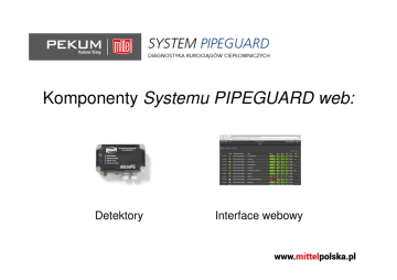 Komponenty Systemu PIPEGUARD web: Detektory Interface webowy Detektor microPG • Kontrolowane wartości: • Rezystancja izolacji, • Rezystancja pętli, • Napięcie galwaniczne, • Sekcja pomiarowa: • 2 kanały – 8000m drutu alarm. na kanał, • Komunikacja: • GSM, • Kontrola: • Interface webowy, SMS, • Alarmy: • Interface webowy, email oraz SMS. Detektor microPG • Zasilanie: • • Klasa szczelności: • • Sieć lub bateria, IP 67 z możliwością zwiększenia, Dodatkowe wejścia alarmowe: • Możliwość podłączenia 2 cyfrowych sensorów alarmowych (np. czujnik zalania komory), • Konfiguracja: • Wszystkie detektory są prekonfigurowane oraz gotowe do natychmiastowej instalacji i użytkowania. Detektor miniPG • Kontrolowane wartości: • Rezystancja izolacji, • Rezystancja pętli, • Napięcie galwaniczne, • Sekcja pomiarowa: • 4 kanały – 8000m drutu alarm. na kanał, • Komunikacja: • GSM, •Kontrola: • Interface webowy, SMS, • Alarmy: • Interface webowy, email oraz SMS. Detektor miniPG • Zasilanie: • • Klasa szczelności: • • Sieć lub bateria, IP 67 z możliwością zwiększenia, Dodatkowe wejścia alarmowe: • Możliwość podłączenia 2 cyfrowych sensorów alarmowych (np. czujnik zalania komory), • Konfiguracja: • Wszystkie detektory są prekonfigurowane oraz gotowe do natychmiastowej instalacji i użytkowania. Interface webowy - użytkowanie: • Wystarczy uruchomić przeglądarkę internetową, wpisać adres www.pgweb.pipeguard.se oraz podać własną nazwę użytkownika oraz hasło. Po wykonaniu tych czynności otrzymujemy pełny dostęp do systemu Pipeguard web. Interface webowy - funkcjonalności: • Błyskawiczna informacja o pracy wszystkich zainstalowanych detektorów oraz stanie sekcji alarmowych, na których detektory wykryły przekroczenie zadanych wartości progowych. (alarmy są widoczne już z poziomu pierwszego ekranu, ponadto system codziennie rano wysyła emaila z listą wszystkich sekcji, na których pojawiły się alarmy) Interface webowy - funkcjonalności: • Kontrola poprawności pracy wszystkich zainstalowanych detektorów. System monitoruje czas pomiędzy pomiarami, temperaturę wewn. urządzenia, napięcie zasilania (szczególnie ważne w przypadku zasilania z baterii), siłę sygnału GSM, wejścia cyfrowe dla zewn. sensorów. Dla każdego z tych parametrów zadane są wartości progowe po przekroczeniu których uaktywniony zostanie alarm. (Wszystkie wartości progowe są ustalane indywidulanie dla każdego urządzenia). Wszystkie zmiany ustawień detektorów dokonywane są zdalnie z poziomu interfaceu webowego Pipeguard web. Interface webowy - funkcjonalności: • Kontrola wartości pomiarowych (rez. izolacji, rez. pętli, nap. galwaniczne) charakteryzujących daną sekcję alarmową. System umożliwia „wejście” w każdy detektor oraz dokładną kontrolę rejestrowanych przez niego wartości (zarówno rzeczywistych jak i historycznych). Ponadto poprzez archiwizację wszystkich zbieranych danych system umożliwia wyznaczanie krzywych trendów dla rejestrowanych wartości pomiarowych. Interface webowy - funkcjonalności: • Indywidualizacja progów alarmowych danego detektora, również „w rozbiciu” na monitorowane kanały (rury) oraz możliwość ustawienia alarmów o dwóch priorytetach ważności. • Historia alarmów dla monitorowanej sekcji. • Wspieranie wielu użytkowników.