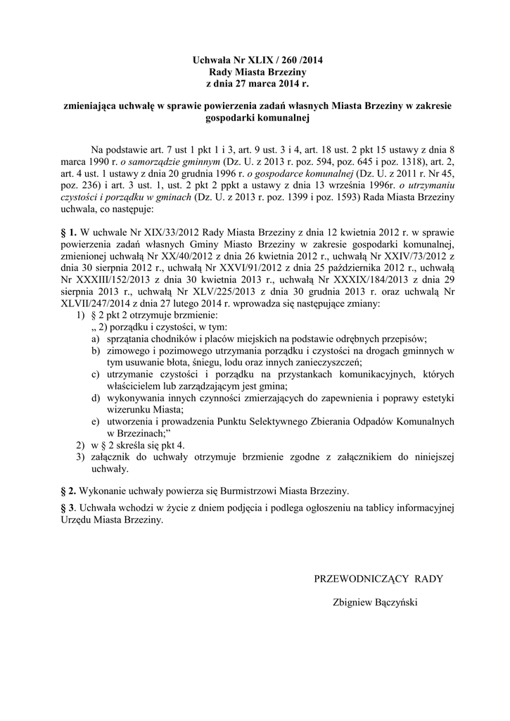 Uchwała Nr XLIX / 260 /2014 Rady Miasta Brzeziny z dnia 27 marca 2014 r. zmieniająca uchwałę w sprawie powierzenia zadań własnych Miasta Brzeziny w zakresie gospodarki komunalnej Na podstawie art. 7 ust 1 pkt 1 i 3, art. 9 ust. 3 i 4, art. 18 ust. 2 pkt 15 ustawy z dnia 8 marca 1990 r. o samorządzie gminnym (Dz. U. z 2013 r. poz. 594, poz. 645 i poz. 1318), art. 2, art. 4 ust. 1 ustawy z dnia 20 grudnia 1996 r. o gospodarce komunalnej (Dz. U. z 2011 r. Nr 45, poz. 236) i art. 3 ust. 1, ust. 2 pkt 2 ppkt a ustawy z dnia 13 września 1996r. o utrzymaniu czystości i porządku w gminach (Dz. U. z 2013 r. poz. 1399 i poz. 1593) Rada Miasta Brzeziny uchwala, co następuje: § 1. W uchwale Nr XIX/33/2012 Rady Miasta Brzeziny z dnia 12 kwietnia 2012 r. w sprawie powierzenia zadań własnych Gminy Miasto Brzeziny w zakresie gospodarki komunalnej, zmienionej uchwałą Nr XX/40/2012 z dnia 26 kwietnia 2012 r., uchwałą Nr XXIV/73/2012 z dnia 30 sierpnia 2012 r., uchwałą Nr XXVI/91/2012 z dnia 25 października 2012 r., uchwałą Nr XXXIII/152/2013 z dnia 30 kwietnia 2013 r., uchwałą Nr XXXIX/184/2013 z dnia 29 sierpnia 2013 r., uchwałą Nr XLV/225/2013 z dnia 30 grudnia 2013 r. oraz uchwalą Nr XLVII/247/2014 z dnia 27 lutego 2014 r. wprowadza się następujące zmiany: 1) § 2 pkt 2 otrzymuje brzmienie: „ 2) porządku i czystości, w tym: a) sprzątania chodników i placów miejskich na podstawie odrębnych przepisów; b) zimowego i pozimowego utrzymania porządku i czystości na drogach gminnych w tym usuwanie błota, śniegu, lodu oraz innych zanieczyszczeń; c) utrzymanie czystości i porządku na przystankach komunikacyjnych, których właścicielem lub zarządzającym jest gmina; d) wykonywania innych czynności zmierzających do zapewnienia i poprawy estetyki wizerunku Miasta; e) utworzenia i prowadzenia Punktu Selektywnego Zbierania Odpadów Komunalnych w Brzezinach;” 2) w § 2 skreśla się pkt 4. 3) załącznik do uchwały otrzymuje brzmienie zgodne z załącznikiem do niniejszej uchwały. § 2. Wykonanie uchwały powierza się Burmistrzowi Miasta Brzeziny. § 3. Uchwała wchodzi w życie z dniem podjęcia i podlega ogłoszeniu na tablicy informacyjnej Urzędu Miasta Brzeziny. PRZEWODNICZĄCY RADY Zbigniew Bączyński Załącznik do uchwały Nr XLIX/260/2014 Rady Miasta Brzeziny z dnia 27 marca 2014 r. Wykaz środków trwałych Lp. Nazwa środka trwałego Wartość początkowa Nr inwentarzowy 1. zamiatarka drogowa Johnston CN200 109.470,00 zł 5/58/582-3/4 2. 3. ciągnik Zetor Proxima 90 kosiarka samojezdna – traktorek PARTNER Mini Traktor KUBOTA typ B3NO z osprzętem - posypywarką 135.820,00 zł 6.999,00 zł 7/74/746/4 5/59/592/3 39.237,00 zł 3.161,10 zł 7/74/746/3 RI 2/2012 5.124,00 zł 5/58/582-0/2 6. 7. 8. 9. 10. 11. 12. 13. Zagęszczarka gruntu ZG-120 z gumą E.P.U. kosa STIHL typ FS 350 kosa STIHL typ FS 350 kosa STHIL typ FS 200 kosa STHIL typ FS 250 Kosa STHIL dmuchawa spalinowa BBX7600 nożyce do żywopłotu nożyce do żywopłotu marki STIHL 2399,00 zł 2399,00 zł 1999,00 zł 1999,00 zł 499,00 zł 1900,00 zł 670,00 zł 1349,00 zł GK 12/09 GK 12/09 A 1/08 GK 3/09 RG 3/07 RI 3/2012 A 3/08 GK 13/09 14. Opryskiwacz Kwazar Orion – 3 szt. 417,00 zł GK 10/09 15. 16. 17. Pilarka STHIL – 2 szt. Palnik do papy Pojemniki do selektywnej zbiórki odpadów – 10 szt. Linia sortownicza do sortowania odpadów z przesiewaczem bębnowym i przenośnikami Belownica STRAUTMANN MK 1100 przyczepa ciężarowa rolnicza PMJ04 Kompaktor Hanomag CD66 Koparko-ładowarka typ CAT 428c, nr seryjny 2CR21349 5.638,00 zł 480,00 zł 7.808,00 zł GK 11/09 RI 4/2012 GK 1/09 702.822,00 zł 2/29/291/220 33 210,00 zł 12 915,00 zł 195.200,00 zł 72.570,00 zł 5/50/503/5 7/74/748/5 5/59/599/1 5/58/580/6 4. 5. 18. 19. 20. 21. 22.