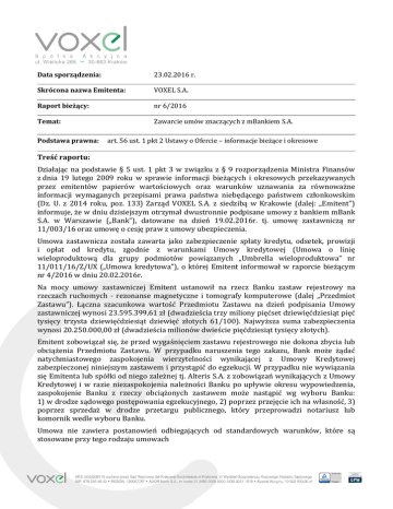 Data sporządzenia: 23.02.2016 r. Skrócona nazwa Emitenta: VOXEL S.A. Raport bieżący: nr 6/2016 Temat: Zawarcie umów znaczących z mBankiem S.A. Podstawa prawna: art. 56 ust. 1 pkt 2 Ustawy o Ofercie – informacje bieżące i okresowe Treść raportu: Działając na podstawie § 5 ust. 1 pkt 3 w związku z § 9 rozporządzenia Ministra Finansów z dnia 19 lutego 2009 roku w sprawie informacji bieżących i okresowych przekazywanych przez emitentów papierów wartościowych oraz warunków uznawania za równoważne informacji wymaganych przepisami prawa państwa niebędącego państwem członkowskim (Dz. U. z 2014 roku, poz. 133) Zarząd VOXEL S.A. z siedzibą w Krakowie (dalej: „Emitent”) informuje, że w dniu dzisiejszym otrzymał dwustronnie podpisane umowy z bankiem mBank S.A. w Warszawie („Bank”), datowane na dzień 19.02.2016r. tj. umowę zastawniczą nr 11/003/16 oraz umowę o cesję praw z umowy ubezpieczenia. Umowa zastawnicza została zawarta jako zabezpieczenie spłaty kredytu, odsetek, prowizji i opłat od kredytu, zgodnie z warunkami Umowy kredytowej (Umowa o linię wieloproduktową dla grupy podmiotów powiązanych „Umbrella wieloproduktowa” nr 11/011/16/Z/UX („Umowa kredytowa”), o której Emitent informował w raporcie bieżącym nr 4/2016 w dniu 20.02.2016r. Na mocy umowy zastawniczej Emitent ustanowił na rzecz Banku zastaw rejestrowy na rzeczach ruchomych - rezonanse magnetyczne i tomografy komputerowe (dalej „Przedmiot Zastawu”). Łączna szacunkowa wartość Przedmiotu Zastawu na dzień podpisania Umowy zastawniczej wynosi 23.595.399,61 zł (dwadzieścia trzy miliony pięćset dziewięćdziesiąt pięć tysięcy trzysta dziewięćdziesiąt dziewięć złotych 61/100). Najwyższa suma zabezpieczenia wynosi 20.250.000,00 zł (dwadzieścia milionów dwieście pięćdziesiąt tysięcy złotych). Emitent zobowiązał się, że przed wygaśnięciem zastawu rejestrowego nie dokona zbycia lub obciążenia Przedmiotu Zastawu. W przypadku naruszenia tego zakazu, Bank może żądać natychmiastowego zaspokojenia wierzytelności wynikającej z Umowy Kredytowej zabezpieczonej niniejszym zastawem i przystąpić do egzekucji. W przypadku nie wywiązania się Emitenta lub spółki od niego zależnej tj. Alteris S.A. z zobowiązań wynikających z Umowy Kredytowej i w razie niezaspokojenia należności Banku po upływie okresu wypowiedzenia, zaspokojenie Banku z rzeczy obciążonych zastawem może nastąpić wg wyboru Banku: 1) w drodze sądowego postępowania egzekucyjnego, 2) poprzez przejęcie ich na własność, 3) poprzez sprzedaż w drodze przetargu publicznego, który przeprowadzi notariusz lub komornik wedle wyboru Banku. Umowa nie zawiera postanowień odbiegających od standardowych warunków, które są stosowane przy tego rodzaju umowach W związku z zawarciem Umowy Kredytowej oraz Umowy zastawniczej, Emitent na mocy umowy o cesję i praw z umowy ubezpieczenia, przelał na rzecz Banku przysługujące mu prawa do całości odszkodowań z tytułu umowy ubezpieczenia rzeczy ruchomych objętych ww. Umową Zastawniczą, zawartą na podstawie Ogólnych warunków ubezpieczenia mienia od wszystkich ryzyk oraz Ogólnych warunków ubezpieczenia sprzętu elektronicznego z InterRisk Towarzystwo Ubezpieczeń SA Vienna Insurance Group II Oddział Katowice, zwanym dalej Ubezpieczycielem na kwotę 107.998.097,39 zł (słownie: sto siedem milionów dziewięćset dziewięćdziesiąt osiem tysięcy dziewięćdziesiąt siedem złotych 39/100) oraz prawa do odszkodowań wynikające z zawartych w przyszłości umów ubezpieczenia, stanowiących kontynuację powyższej umowy, potwierdzonych polisami ubezpieczeniowymi wystawionymi przez wymienionego Ubezpieczyciela. Emitent stanie się ponownie wierzycielem z tytułu praw będących przedmiotem cesji z chwilą stwierdzenia przez Bank na piśmie, że wierzytelności z tytułu Umowy Kredytowej zostały całkowicie zaspokojone. Emitent ani osoby zarządzające i nadzorujące Emitenta nie są powiązane w inny sposób z zastawnikami ani osobami z nimi zarządzającymi. Umowy zostały uznane za znaczące, ze względu na przekroczenie 10% wartości kapitałów własnych, zgodnie z §2 ust. 1 pkt. 44 lit. a. rozporządzenia Ministra Finansów z dnia 19 lutego 2009 r. w sprawie informacji bieżących i okresowych przekazywanych przez emitentów papierów wartościowych. Kapitały własne VOXEL S.A. będące podstawą kryterium wynosiły 102.968.979,12zł według stanu na dzień 30 września 2015 roku, wynikającego z ostatniego opublikowanego raportu kwartalnego. Osoby reprezentujące spółkę: Jacek Liszka – Prezes Zarządu Marek Pilch – Kowalczyk - Prokurent
