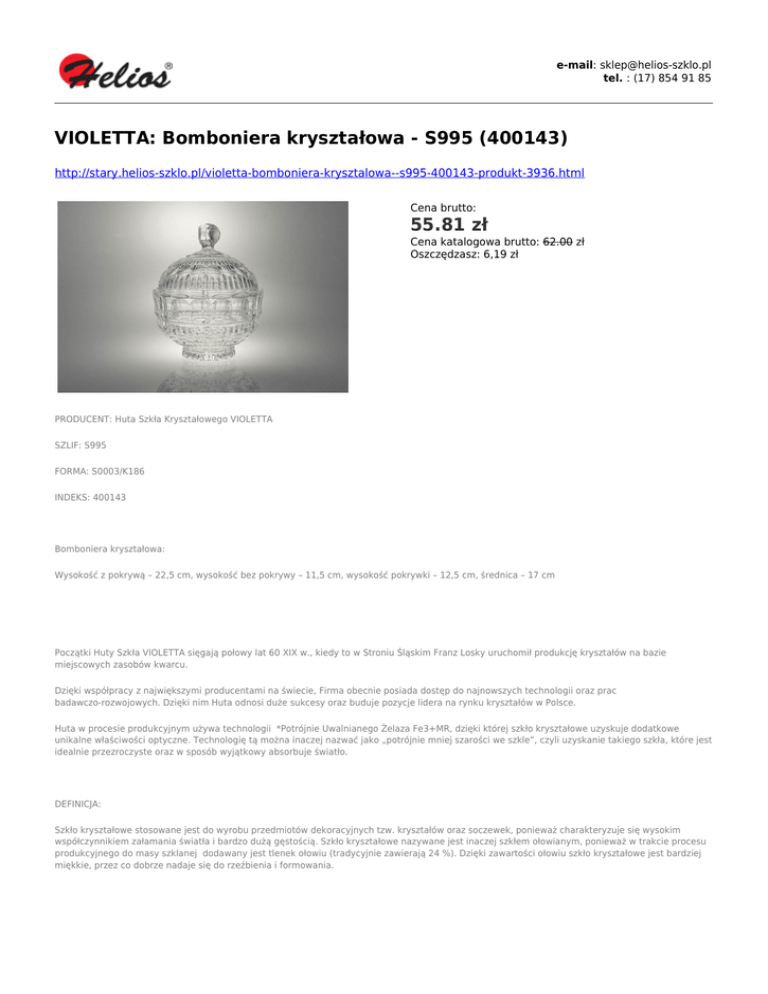 e-mail: [email protected] tel. : (17) 854 91 85 VIOLETTA: Bomboniera kryształowa - S995 (400143) http://stary.helios-szklo.pl/violetta-bomboniera-krysztalowa--s995-400143-produkt-3936.html Cena brutto: 55.81 zł Cena katalogowa brutto: 62.00 zł Oszczędzasz: 6,19 zł PRODUCENT: Huta Szkła Kryształowego VIOLETTA SZLIF: S995 FORMA: S0003/K186 INDEKS: 400143 Bomboniera kryształowa: Wysokość z pokrywą – 22,5 cm, wysokość bez pokrywy – 11,5 cm, wysokość pokrywki – 12,5 cm, średnica – 17 cm Początki Huty Szkła VIOLETTA sięgają połowy lat 60 XIX w., kiedy to w Stroniu Śląskim Franz Losky uruchomił produkcję kryształów na bazie miejscowych zasobów kwarcu. Dzięki współpracy z największymi producentami na świecie, Firma obecnie posiada dostęp do najnowszych technologii oraz prac badawczo-rozwojowych. Dzięki nim Huta odnosi duże sukcesy oraz buduje pozycje lidera na rynku kryształów w Polsce. Huta w procesie produkcyjnym używa technologii *Potrójnie Uwalnianego Żelaza Fe3+MR, dzięki której szkło kryształowe uzyskuje dodatkowe unikalne właściwości optyczne. Technologię tą można inaczej nazwać jako „potrójnie mniej szarości we szkle”, czyli uzyskanie takiego szkła, które jest idealnie przezroczyste oraz w sposób wyjątkowy absorbuje światło. DEFINICJA: Szkło kryształowe stosowane jest do wyrobu przedmiotów dekoracyjnych tzw. kryształów oraz soczewek, ponieważ charakteryzuje się wysokim współczynnikiem załamania światła i bardzo dużą gęstością. Szkło kryształowe nazywane jest inaczej szkłem ołowianym, ponieważ w trakcie procesu produkcyjnego do masy szklanej dodawany jest tlenek ołowiu (tradycyjnie zawierają 24 %). Dzięki zawartości ołowiu szkło kryształowe jest bardziej miękkie, przez co dobrze nadaje się do rzeźbienia i formowania. *Ze względu na to, że w większości wyroby kryształowe są wykonane ręcznie, podane parametry mogą się różnić od tych rzeczywistych. Jednak różnica ta, nie powinna być większa niż 1 cm