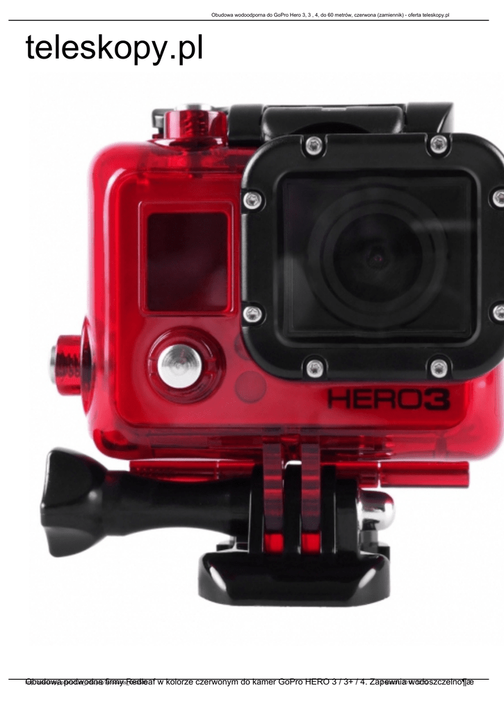 Obudowa wodoodporna do GoPro Hero 3, 3 , 4, do 60 metrów, czerwona (zamiennik) - oferta teleskopy.pl teleskopy.pl 7 March, 2017, 12:12 Obudowa podwodna firmy Redleaf w kolorze czerwonym do kamer GoPro HERO 3 / 3+ / 4. Zapewnia wodoszczelno¶æ http://teleskopy.pl/product_info.php?products_id=3545 Obudowa wodoodporna do GoPro Hero 3, 3 , 4, do 60 metrów, czerwona (zamiennik) - oferta teleskopy.pl do 60 m, pe³n± ochronê przed kurzem i zabrudzeniami, dodatkowo zabezpiecza kamerê przed uszkodzeniami mechanicznymi. Produkt zosta³ wykonany z najwy¿szej jako¶ci materia³ów, spe³nia wszystkie normy i specyfikacje. Zapewnia wysoki komfort u¿ytkowania kamery GoPro HERO. Obudowa jest pe³nowarto¶ciowym zamiennikiem oryginalnej obudowy GoPro Waterproof Housing Case. W zestawie znajduje siê szybkoz³±czka oraz ¶ruba monta¿owa. Parametry • masa: 100 g • wodoszczelno¶æ: do 60 metrów • kompatybilno¶æ: GoPro Hero 3, 3+, 4 • mocowanie filtru: jak do Hero 3 Gwarancja 24 miesi±ce W NASZEJ OFERCIE POSIADAMY KAMERY GOPRO: najnowsz± Hero4 Sessionk, Hero 4 Black i Silver oraz bogaty wybór akcesoriów do GoPro - zachêcamy do kontaktu. Jeste¶my Autoryzowanym Sprzedawc± Detalicznym GoPro - oferowane przez nas kamery i akcesoria GoPro pochodz± z oficjalnej polskiej dystrybucji i posiadaj± 2-letni±, realizowan± w Polsce gwarancjê dystrybutora. http://teleskopy.pl/product_info.php?products_id=3545 7 March, 2017, 12:12 Obudowa wodoodporna do GoPro Hero 3, 3 , 4, do 60 metrów, czerwona (zamiennik) - oferta teleskopy.pl http://teleskopy.pl/product_info.php?products_id=3545 7 March, 2017, 12:12