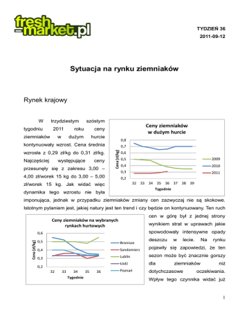 TYDZIEŃ 36 2011-09-12 Sytuacja na rynku ziemniaków Rynek krajowy W tygodniu trzydziestym 2011 ziemniaków w szóstym roku ceny dużym hurcie Ceny ziemniaków w dużym hurcie 0,8 kontynuowały wzrost. Cena średnia Najczęściej występujące ceny przesunęły się z zakresu 3,00 – Cena [zł/kg] wzrosła z 0,29 zł/kg do 0,31 zł/kg. 0,7 4,00 zł/worek 15 kg do 3,00 – 5,00 0,6 0,5 2009 0,4 2010 0,3 2011 0,2 32 33 34 35 36 37 38 39 zł/worek 15 kg. Jak widać więc Tygodnie dynamika tego wzrostu nie była imponująca, jednak w przypadku ziemniaków zmiany cen zazwyczaj nie są skokowe. Istotnym pytaniem jest, jakiej natury jest ten trend i czy będzie on kontynuowany. Ten ruch cen w górę był z jednej strony Ceny ziemniaków na wybranych rynkach hurtowych wynikiem strat w uprawach jakie spowodowały intensywne opady Cena [zł/kg] 0,6 deszczu w lecie. Na rynku 0,5 Bronisze 0,4 Sandomierz pojawiły się zapowiedzi, że ten 0,3 Lublin sezon może być znacznie gorszy Łódź dla Poznań dotychczasowe 0,2 32 33 34 35 Tygodnie 36 ziemniaków niż oczekiwania. Wpływ tego czynnika widać już 1 TYDZIEŃ 36 2011-09-12 Ceny ziemniaków w wybranych supermarketach w Warszawie drugiej strony poparty był trend tym, zwyżkowy że zbiory ziemniaków nabierają tempa i wielu 1,5 Cena [zł/kg] było w tygodniu poprzednim. Z producentów zajmując się głównie 1 wykopkami ograniczyło sprzedaż. Jednak 0,5 pewne najbliższym 0 Auchan Carrefour Tesco Biedronka ziemniaków jest, okresie na polskim że w podaż rynku pozostanie wysoka. Nie wszystkie tereny ucierpiały bardzo od opadów. Sporo jest upraw o rekordowo wysokich plonach. O ile w tygodniu trzydziestym piątym sporo było pesymizmu w opiniach przyszłej podaży ziemniaków, tak w tygodniu trzydziestym szóstym większość przewidywań wskazuje na to, że podaż pozostanie wysoka a ceny będą niskie. Jeśli chodzi o lokalne rynki hurtowe to w omawianym okresie widać było wyhamowanie tendencji spadkowych, tak wyraźnych w poprzednich tygodniach. Na dwóch z pięciu monitorowanych rynków odnotowano wzrost ceny średniej ziemniaków. Na dwóch ceny pozostały stabilne a tylko na jednym zanotowano minimalny spadek. Ten spadek ceny średniej miał miejsce w Broniszach Cena średnia spadła tam z 0,36 zł/kg do 0,35 zł/kg. Wzrost cen miał miejsce w Sandomierzu z 0,30 zł/kg do 0,33 zł/kg i w Lublinie z 0,48 zł/kg do 0,55 zł/kg. Stabilne były ceny w Łodzi, - 0,33 zł/kg i w Poznaniu 0,34 zł/kg. W omawianym okresie tylko jeden z obserwowanych warszawskich hipermarketów zmienił cenę sprzedawanych ziemniaków. W Tesco cena spadła z 1,19 zł/kg na 0,97 zł/kg. Stabilne pozostały ceny w: Auchan 1,15 zł/kg, Carrefour 0,79 zł/kg i Biedronce 1,19 zł/kg. Import i eksport W trzydziestym szóstym tygodniu 2011 roku sytuacja w eksporcie ziemniaków pozostawała niezmienna i niekorzystna dla polskich producentów i eksporterów. Tak w 2 TYDZIEŃ 36 2011-09-12 Rosji, jak i w Europie ziemniaków było pod dostatkiem. W Rosji podaż ziemniaków rośnie, a ich ceny szybko spadają. W Hiszpanii protestowali producenci ziemniaków. Niezła pogoda sprawiła, że duże zbiory zapowiadane są również w Belgii, Francji i w Niemczech. Ceny sprzedażowe polskich ziemniaków w omawianym okresie pozostawały na niskim poziomie 0,09 euro/kg (kaliber 45+). Na rynku holenderskim ceny ziemniaków w omawianym okresie były na poziomie 0,14 – 0,16 euro/kg. 3