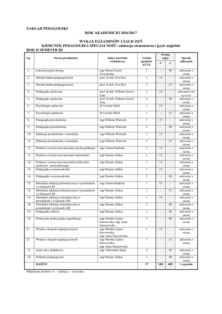 ZAKŁAD PEDAGOGIKI ROK AKADEMICKI 2016/2017 WYKAZ EGZAMINÓW I ZALICZEŃ KIERUNEK PEDAGOGIKA SPECJALNOŚĆ: edukacja elementarna i język angielski ROK II SEMESTR III Lp. Nazwa przedmiotu Imię i nazwisko wykładowcy Forma zajęć Liczba punktów ECTS w ć 2 - 30 1 15 - Sposób zaliczenia 1. Lektorat języka obcego 2. Metody badań pedagogicznych mgr Selena Pecolt Nowotarska prof. dr hab. Ewa Ryś 3. Metody badań pedagogicznych prof. dr hab. Ewa Ryś 1 - 15 4. Pedagogika społeczna 1 15 - 5. Pedagogika społeczna 2 - 30 6. Psychologia społeczna prof. dr hab. Elżbieta Gaweł Luty prof. dr hab. Elżbieta Gaweł Luty dr Urszula Sokal 1 15 - 7. Psychologia społeczna dr Urszula Sokal 1 - 15 8. Pedagogika przedszkolna mgr Elżbieta Walczak 1 15 - 9. Pedagogika przedszkolna mgr Elżbieta Walczak 2 - 30 10. Edukacja przedszkolna z metodyką mgr Elżbieta Walczak 1 15 - 11. Edukacja przedszkolna z metodyką mgr Elżbieta Walczak 1 - 15 12. Podstawy teoretyczne nauczania języka polskiego mgr Joanna Rudecka 1 15 - 13. Podstawy teoretyczne nauczania matematyki mgr Danuta Aleksa 1 15 - 14. mgr Danuta Aleksa 1 15 - 15. Podstawy teoretyczne nauczania środowiska społeczno - przyrodniczego Pedagogika wczesnoszkolna mgr Danuta Aleksa 1 15 - 16. Pedagogika wczesnoszkolna mgr Danuta Aleksa 2 - 30 17. mgr Joanna Rudecka 1 15 - mgr Danuta Aleksa 1 - 15 mgr Danuta Aleksa 1 15 - mgr Danuta Aleksa 2 - 30 21. Metodyka edukacji polonistycznej w przedszkolu i w klasach I-III Metodyka edukacji polonistycznej w przedszkolu i w klasach I-III Metodyka edukacji matematycznej w przedszkolu i w klasach I-III Metodyka edukacji matematycznej w przedszkolu i w klasach I-III Pedagogika zabawy mgr Danuta Aleksa 2 - 30 22. Praktyczna nauka języka angielskiego 5 - 90 1 15 - zaliczenie z oceną 1 - 15 zaliczenie z oceną 2 - 30 1 - 30 37 180 405 zaliczenie z oceną zaliczenie z oceną 1 egzamin 18. 19. 20. 23. Język obcy dodatkowy mgr Monika Lipiec Karwowska; mgr Anna Szarszewska mgr Monika Lipiec Karwowska; mgr Anna Szarszewska mgr Monika Lipiec Karwowska; mgr Anna Szarszewska mgr Aleksandra Sajek 24. Praktyka pedagogiczna mgr Danuta Aleksa 21. Wiedza o krajach anglojęzycznych 22. Wiedza o krajach anglojęzycznych RAZEM Objaśnienia skrótów: w – wykład, ć - ćwiczenia zaliczenie z oceną zaliczenie z oceną zaliczenie z oceną zaliczenie (w) egzamin zaliczenie z oceną zaliczenie z oceną zaliczenie z oceną zaliczenie z oceną zaliczenie z oceną zaliczenie z oceną zaliczenie z oceną zaliczenie z oceną zaliczenie z oceną zaliczenie z oceną zaliczenie z oceną zaliczenie z oceną zaliczenie z oceną zaliczenie z oceną zaliczenie z oceną zaliczenie z oceną zaliczenie z oceną zaliczenie z oceną