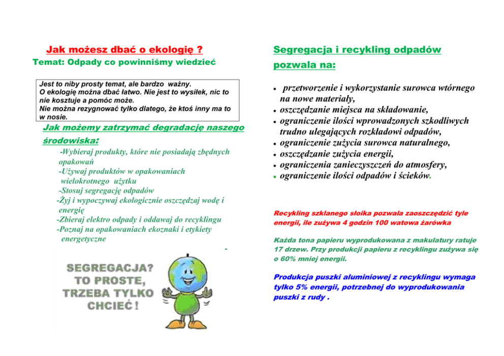 Jak możesz dbać o ekologię ? Segregacja i recykling odpadów Temat: Odpady co powinniśmy wiedzieć pozwala na: Jest to niby prosty temat, ale bardzo ważny. O ekologię można dbać łatwo. Nie jest to wysiłek, nic to nie kosztuje a pomóc może. Nie można rezygnować tylko dlatego, że ktoś inny ma to w nosie. Jak możemy zatrzymać degradację naszego środowiska: -Wybieraj produkty, które nie posiadają zbędnych opakowań -Używaj produktów w opakowaniach wielokrotnego użytku -Stosuj segregację odpadów -Żyj i wypoczywaj ekologicznie oszczędzaj wodę i energię -Zbieraj elektro odpady i oddawaj do recyklingu -Poznaj na opakowaniach ekoznaki i etykiety energetyczne przetworzenie i wykorzystanie surowca wtórnego na nowe materiały, oszczędzanie miejsca na składowanie, ograniczenie ilości wprowadzonych szkodliwych trudno ulegających rozkładowi odpadów, ograniczenie zużycia surowca naturalnego, oszczędzanie zużycia energii, ograniczenia zanieczyszczeń do atmosfery, ograniczenie ilości odpadów i ścieków. Recykling szklanego słoika pozwala zaoszczędzić tyle energii, ile zużywa 4 godzin 100 watowa żarówka - Każda tona papieru wyprodukowana z makulatury ratuje 17 drzew. Przy produkcji papieru z recyklingu zużywa się o 60% mniej energii. Produkcja puszki aluminiowej z recyklingu wymaga tylko 5% energii, potrzebnej do wyprodukowania puszki z rudy . POJEMNIKI NA SZKŁO należy wrzucać tylko opakowania szklane bez zawartości butelki po winie, piwie, alkoholach, butelki po sokach i napojach, słoiki po dżemach i przetworach, opakowania szklane po pokarmach dla dzieci, słoiki bez pokrywek, butelki bez korków, nakrętek i kapsli, opakowania z kolorowego i bezbarwnego szkła Zabrania się umieszczania w pojemnikach opakowań z zawartością luster, szyb okiennych, szyb samochodowych, szkła zbrojonego, szklanek, kieliszków, szkła kryształowego, naczyń żaroodpornych, żarówek i świetlówek, kineskopów, wyrobów z porcelany i fajansu, płytek i innych wyrobów ceramicznych, doniczek, zniczy, szklanych opakowań po lekach oraz szkła gospodarczego (misek, szklanych talerzy, figurek) POJEMNIKI NA OPAKOWANIA Z TWORZYW SZTUCZNYCH Do wnętrza pojemnika należy wrzucać tylko czyste, niezabrudzone opakowania bez zawartości: butelki typu PET (politereftalan etylenu), butelki po chemii gospodarczej (typu PE-LD i PE-HD - polietylen), opakowania po kefirach i jogurtach (typu PP polipropylen), opakowania z polistyrenu (PS), torebki foliowe, kawałki folii opakowaniowej. Zabrania się umieszczania w pojemnikach oraz pozostawiania w ich pobliżu odpadów zawierających polichlorek winylu (PVC), wszelkich odpadów komunalnych, budowlanych (w tym folii budowlanej i ogrodniczej), przemysłowych, niebezpiecznych, poeksploatacyjnych z samochodów, sprzętu RTV i AGD oraz jego elementów. NIEBIESKIE POJEMNIKI NA MAKULATURĘ należy wrzucać: czysty, niezatłuszczony papier i tekturę, gazety, katalogi, magazyny, prospekty reklamowe, zeszyty, książki, torebki papierowe, papier pakowy, rozdarte pudełka i kartony, tekturę falistą, papier i tekturę bez domieszek plastiku. Zabrania się umieszczania w pojemnikach: kartonów powlekanych folią, kartonów po mleku, napojach i sokach, papieru tłustego lub zabrudzonego, pergaminu, zdjęć, kalek, celafonu, papierów higienicznych, pampersów, pieluch, podpasek, papierowych worków z odkurzaczy, tapet, worków po klejach budowlanych, cemencie i wapnie. To firma , która -właściwie unieszkodliwi domowe odpady - pomaga w gospodarczym wykorzystaniu odpadów -doradzi i pomoże pozbyć się starych mebli, sprzętu AGD i RTV W ulotce wykorzystano informacje podane na stronie Eko region Skierniewice