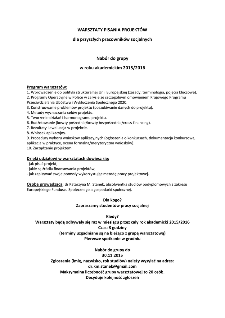 WARSZTATY PISANIA PROJEKTÓW dla przyszłych pracowników socjalnych Nabór do grupy w roku akademickim 2015/2016 Program warsztatów: 1. Wprowadzenie do polityki strukturalnej Unii Europejskiej (zasady, terminologia, pojęcia kluczowe). 2. Programy Operacyjne w Polsce w zarysie ze szczególnym omówieniem Krajowego Programu Przeciwdziałania Ubóstwu i Wykluczenia Społecznego 2020. 3. Konstruowanie problemów projektu (poszukiwanie danych do projektu). 4. Metody wyznaczania celów projektu. 5. Tworzenie działań i harmonogramu projektu. 6. Budżetowanie (koszty pośrednie/koszty bezpośrednie/cross-financing). 7. Rezultaty i ewaluacja w projekcie. 8. Wniosek aplikacyjny. 9. Procedury wyboru wniosków aplikacyjnych (ogłoszenia o konkursach, dokumentacja konkursowa, aplikacja w praktyce, ocena formalna/merytoryczna wniosków). 10. Zarządzanie projektem. Dzięki udziałowi w warsztatach dowiesz się: - jak pisać projekt, - jakie są źródła finansowania projektów, - jak zapisywać swoje pomysły wykorzystując metodę pracy projektowej. Osoba prowadząca: dr Katarzyna M. Stanek, absolwentka studiów podyplomowych z zakresu Europejskiego Funduszu Społecznego a gospodarki społecznej. Dla kogo? Zapraszamy studentów pracy socjalnej Kiedy? Warsztaty będą odbywały się raz w miesiącu przez cały rok akademicki 2015/2016 Czas: 3 godziny (terminy uzgadniane są na bieżąco z grupą warsztatową) Pierwsze spotkanie w grudniu Nabór do grupy do 30.11.2015 Zgłoszenia (imię, nazwisko, rok studiów) należy wysyłać na adres: [email protected] Maksymalna liczebność grupy warsztatowej to 20 osób. Decyduje kolejność zgłoszeń