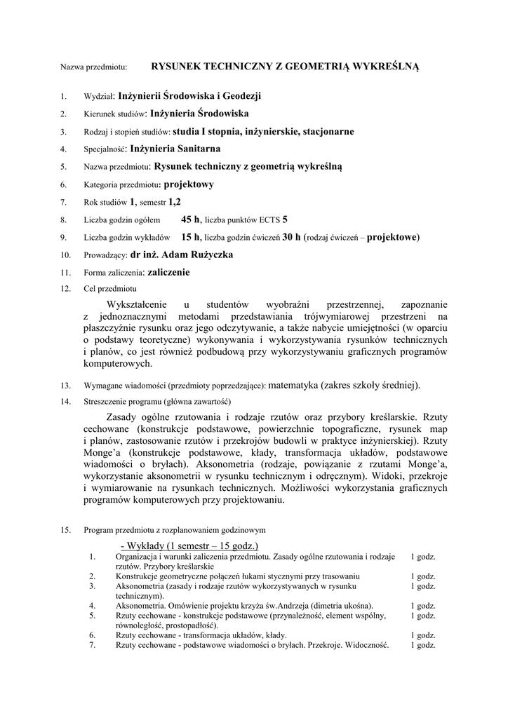 RYSUNEK TECHNICZNY Z GEOMETRIĄ WYKREŚLNĄ Nazwa przedmiotu: 1. Wydział: Inżynierii Środowiska i Geodezji 2. Kierunek studiów: 3. Rodzaj i stopień studiów: studia I 4. Specjalność: 5. Nazwa przedmiotu: 6. Kategoria przedmiotu: 7. Rok studiów 1, semestr 1,2 8. Liczba godzin ogółem 45 h, liczba punktów ECTS 5 9. Liczba godzin wykładów 15 h, liczba godzin ćwiczeń 30 h (rodzaj ćwiczeń – projektowe) 10. Prowadzący: 11. Forma zaliczenia: 12. Cel przedmiotu Inżynieria Środowiska stopnia, inżynierskie, stacjonarne Inżynieria Sanitarna Rysunek techniczny z geometrią wykreślną projektowy dr inż. Adam Rużyczka zaliczenie Wykształcenie u studentów wyobraźni przestrzennej, zapoznanie z jednoznacznymi metodami przedstawiania trójwymiarowej przestrzeni na płaszczyźnie rysunku oraz jego odczytywanie, a także nabycie umiejętności (w oparciu o podstawy teoretyczne) wykonywania i wykorzystywania rysunków technicznych i planów, co jest również podbudową przy wykorzystywaniu graficznych programów komputerowych. 13. Wymagane wiadomości (przedmioty poprzedzające): matematyka 14. Streszczenie programu (główna zawartość) (zakres szkoły średniej). Zasady ogólne rzutowania i rodzaje rzutów oraz przybory kreślarskie. Rzuty cechowane (konstrukcje podstawowe, powierzchnie topograficzne, rysunek map i planów, zastosowanie rzutów i przekrojów budowli w praktyce inżynierskiej). Rzuty Monge’a (konstrukcje podstawowe, kłady, transformacja układów, podstawowe wiadomości o bryłach). Aksonometria (rodzaje, powiązanie z rzutami Monge’a, wykorzystanie aksonometrii w rysunku technicznym i odręcznym). Widoki, przekroje i wymiarowanie na rysunkach technicznych. Możliwości wykorzystania graficznych programów komputerowych przy projektowaniu. 15. Program przedmiotu z rozplanowaniem godzinowym - Wykłady (1 semestr – 15 godz.) 1. 2. 3. 4. 5. 6. 7. Organizacja i warunki zaliczenia przedmiotu. Zasady ogólne rzutowania i rodzaje rzutów. Przybory kreślarskie Konstrukcje geometryczne połączeń łukami stycznymi przy trasowaniu Aksonometria (zasady i rodzaje rzutów wykorzystywanych w rysunku technicznym). Aksonometria. Omówienie projektu krzyża św.Andrzeja (dimetria ukośna). Rzuty cechowane - konstrukcje podstawowe (przynależność, element wspólny, równoległość, prostopadłość). Rzuty cechowane - transformacja układów, kłady. Rzuty cechowane - podstawowe wiadomości o bryłach. Przekroje. Widoczność. 1 godz. 1 godz. 1 godz. 1 godz. 1 godz. 1 godz. 1 godz. 8. 9. 10. 11. 12. 13. 14. 15. Siatki brył. Powierzchnie topograficzne. Zastosowanie rzutów cechowanych w rysunku map i praktyce inżynierskiej. Zastosowanie rzutów cechowanych w rysunku map i praktyce inżynierskiej. Omówienie projektu geometrycznego zbiornika z drogą dojazdową (plan sytuacyjno-wysokościowy i przekroje) Rzuty Monge’a - konstrukcje podstawowe (przynależność, element wspólny, równoległość, prostopadłość). Rzuty Monge’a Transformacja układów. Podstawowe wiadomości o bryłach. Wykorzystanie rzutów Monge’a w rysunku technicznym maszynowym – rzuty (widoki), przekroje, półwidoki-półprzekroje. Wymiarowanie. Wykorzystanie rzutów Monge’a w rysunku technicznym budowlanym i architektoniczno-budowlanym – rzuty (widoki) i przekroje budowli wodnych i melioracyjnych. Wymiarowanie. Rysunek techniczny architektoniczno-budowlany – rzuty (widoki) i przekroje projektu budynku mieszkalnego. Wymiarowanie. Możliwości wykorzystania graficznych programów komputerowych przy projektowaniu. 1 godz. 1 godz. 1 godz. 1 godz. 1 godz. 1 godz. 1 godz. 1 godz. - Ćwiczenia (1 semestr – 15 godz.) 1. 2. 3. 4. 5. 6. 7. 8. 9. 10. 11. 12. 13. 14. 15. Zasady wykonywania arkuszy, przybory kreślarskie, techniki kreślenia. Konstrukcje podstawowe (wybrane geometryczne), omówienie arkusza nr 1 do wykonania w domu. Konstrukcje geometryczne połączeń łukami stycznymi w trasowaniu - omówienie arkusza nr 2 (trasa rowerowa) do wykonania w domu. Konstrukcje podstawowe – połączenia łukami przy projektowaniu trasy rowerowej, wykonanie na ćwiczeniach arkusza kolokwialnego nr 1 Aksonometria. Zasady wykonywania oraz analizowania rzutów izometrycznych i dimetrycznych. Rysunki przykładowe. Aksonometria (dimetria ukośna). Wykonanie projektu krzyża św. Andrzeja (arkusz kolokwialny nr 2) –słupek i podpórki Aksonometria (dimetria ukośna). Wykonanie projektu krzyża św. Andrzeja (arkusz kolokwialny nr 2 -cd) – ramiona i widoczność Rzuty cechowane. Konstrukcje podstawowe Rozwinięcie tematyki wykładów oraz sprawdzenie osiągnięć poprzez odpytywanie. Rzuty cechowane. Kłady i transformacja układów Rozwinięcie tematyki wykładów oraz sprawdzenie osiągnięć poprzez odpytywanie. Przekrój bryły metodą transformacji – jej widoczność (rzuty cechowane), wykonanie na ćwiczeniach arkusza kolokwialnego nr 3 Przekrój bryły metodą transformacji – siatka bryły (rzuty cechowane), wykonanie na ćwiczeniach arkusza kolokwialnego nr 3 cd Kolokwium z rzutów cechowanych Rzuty Monge’a. Konstrukcje podstawowe Rozwinięcie tematyki wykładów oraz sprawdzenie osiągnięć poprzez odpytywanie. Rzuty Monge’a Kłady i transformacja układów Rozwinięcie tematyki wykładów oraz sprawdzenie osiągnięć poprzez odpytywanie. Kolokwium z rzutów Monge’a 1 godz. 1 godz. 1 godz. 1 godz. 1 godz. 1 godz. 1 godz. 1 godz. 1 godz. 1 godz. 1 godz. 1 godz. 1 godz. 1 godz. 1 godz. - Ćwiczenia (2 semestr – 15 godz.) 1. 2. 3. Trzy rzuty prostokątne (rzuty Monge’a) układu brył na podstawie rzutu aksonometrycznego (powiązanie rzutów) i wymiarowanie, omówienie arkusza nr 3 do wykonania w domu. Układ rzutów prostokątnych i przekrojów (rzuty Monge’a) bryły z przenikającymi się otworami, na podstawie rzutu aksonometrycznego (powiązanie rzutów), wykonanie na ćwiczeniach arkusza kolokwialnego nr 4. Układ rzutów prostokątnych i przekrojów (rzuty Monge’a