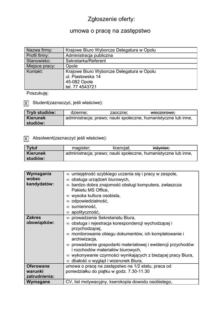 Zgłoszenie oferty: umowa o pracę na zastępstwo
