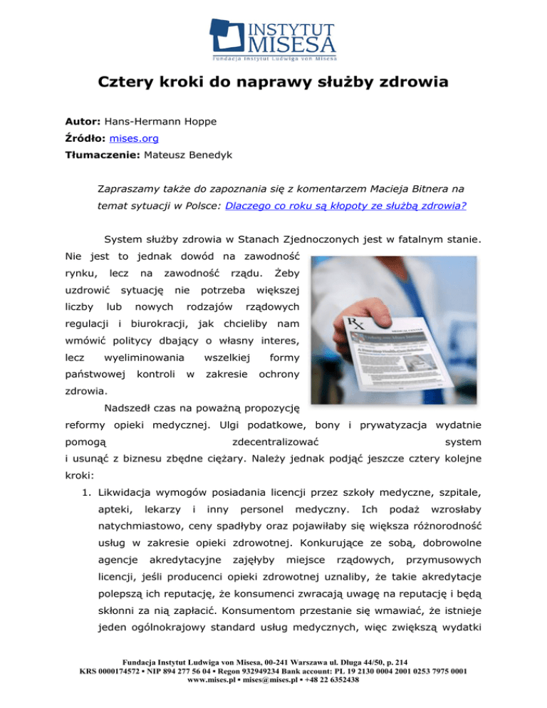 Cztery kroki do naprawy służby zdrowia Autor: Hans-Hermann Hoppe Źródło: mises.org Tłumaczenie: Mateusz Benedyk Zapraszamy także do zapoznania się z komentarzem Macieja Bitnera na temat sytuacji w Polsce: Dlaczego co roku są kłopoty ze służbą zdrowia? System służby zdrowia w Stanach Zjednoczonych jest w fatalnym stanie. Nie jest to jednak dowód na zawodność rynku, lecz uzdrowić liczby na zawodność sytuację lub nie nowych rządu. potrzeba rodzajów Żeby większej rządowych regulacji i biurokracji, jak chcieliby nam wmówić politycy dbający o własny interes, lecz wyeliminowania państwowej kontroli w wszelkiej formy zakresie ochrony zdrowia. Nadszedł czas na poważną propozycję reformy opieki medycznej. Ulgi podatkowe, bony i prywatyzacja wydatnie pomogą zdecentralizować system i usunąć z biznesu zbędne ciężary. Należy jednak podjąć jeszcze cztery kolejne kroki: 1. Likwidacja wymogów posiadania licencji przez szkoły medyczne, szpitale, apteki, lekarzy i inny personel medyczny. Ich podaż wzrosłaby natychmiastowo, ceny spadłyby oraz pojawiłaby się większa różnorodność usług w zakresie opieki zdrowotnej. Konkurujące ze sobą, dobrowolne agencje akredytacyjne zajęłyby miejsce rządowych, przymusowych licencji, jeśli producenci opieki zdrowotnej uznaliby, że takie akredytacje polepszą ich reputację, że konsumenci zwracają uwagę na reputację i będą skłonni za nią zapłacić. Konsumentom przestanie się wmawiać, że istnieje jeden ogólnokrajowy standard usług medycznych, więc zwiększą wydatki Fundacja Instytut Ludwiga von Misesa, 00-241 Warszawa ul. Długa 44/50, p. 214 KRS 0000174572 ▪ NIP 894 277 56 04 ▪ Regon 932949234 Bank account: PL 19 2130 0004 2001 0253 7975 0001 www.mises.pl ▪ [email protected] ▪ +48 22 6352438 na poszukiwanie informacji i będą dokonywać bardziej dyskryminujących wyborów dostawców tych usług. 2. Eliminacja wszelkich rządowych restrykcji na produkcję i sprzedaż produktów farmaceutycznych i sprzętu medycznego. Oznacza to likwidację Food and Drug Administration, która obecnie wstrzymuje innowacje i zwiększa koszty. Koszty i ceny spadłyby a na rynku wcześniej pojawiałyby się lepsze produkty o większej różnorodności. Rynek zmusiłby konsumentów do działania według własnej, a nie rządowej oceny ryzyka. Konkurujący ze sobą producenci i sprzedawcy leków i wyposażenia wprowadziliby lepsze instrukcje i gwarancje, by zabezpieczyć się przed pozwami i przyciągnąć klientów. 3. Deregulacja branży ubezpieczeń na zdrowie. Prywatny przedsiębiorca może zaoferować ubezpieczenie na wypadek zdarzeń, nad którymi ubezpieczony nie posiada kontroli. Nie można ubezpieczyć się od samobójstwa lub bankructwa, ponieważ od samego ubezpieczonego zależy, czy dane wypadki nastąpią. Ponieważ zdrowie lub jego brak są w znacznej mierze pod kontrolą jednostki, wiele, jeśli nie większość, ryzyk zdrowotnych jest nieubezpieczalna. „Ubezpieczenie” od ryzyk, których prawdopodobieństwo zależy w znacznej mierze od jednostki, zawiera się w odpowiedzialności za własne dobro. Każde ubezpieczenie polega na połączeniu wielu indywidualnych ryzyk. Wynika z tego, że ubezpieczyciel jednym płaci więcej a innym mniej. Nie wiadomo jednak z wyprzedzeniem, kto będzie „zwycięzcą” a kto „przegranym”. Ich wybór jest losowy a wynik redystrybucji dochodów jest niesystematyczny. Jeśli można by przewidywać w sposób systematyczny „zwycięzców” i „przegranych”, „przegrani” nie chcieliby łączyć swoich ryzyk ze „zwycięzcami”, lecz raczej z „przegranymi”, to bowiem obniżyłoby ich koszty ubezpieczeń. Nie chciałbym łączyć moich ryzyk osobistych wypadków z zawodowymi futbolistami. Wolałbym raczej łączyć je z ludźmi o sytuacji życiowej podobnej do mojej, po niższym koszcie. Z powodu obecnych przepisów ubezpieczyciele nie mogą odmówić ubezpieczenia — uznać pewnych indywidualnych ryzyk Fundacja Instytut Ludwiga von Misesa, 00-241 Warszawa ul. Długa 44/50, p. 214 KRS 0000174572 ▪ NIP 894 277 56 04 ▪ Regon 932949234 Bank account: PL 19 2130 0004 2001 0253 7975 0001 www.mises.pl ▪ [email protected] ▪ +48 22 6352438 za nieubezpieczalne. Tym samym obecny system tylko częściowo polega na ubezpieczaniu. Firmy nie mogą swobodnie dyskryminować pomiędzy ryzykami różnych grup. Obecnie ubezpieczyciele pokrywają wiele nieubezpieczalnych ryzyk, połączonych z ubezpieczalnymi ryzykami. Nie dyskryminują grup ludzi pomimo znaczących różnic w ich ryzykach. Branża prowadzi zatem system redystrybucji dochodu — poprawiając sytuację nieodpowiedzialnych jednostek i grup o wysokim ryzyku kosztem ludzi odpowiedzialnych i grup o niskim ryzyku. Dlatego też ceny usług są wysokie i szybko rosną. Deregulacja branży ubezpieczeń zdrowotnych to przywrócenie bezwzględnej wolności umów: ubezpieczyciel będzie mógł przedstawić dowolną umowę, ubezpieczać tylko wybrane ryzyka i dyskryminować różne grupy jednostek. Nieubezpieczalne ryzyka przestałyby być przedmiotem kontraktów, różnorodność polityk ubezpieczeniowych względem pozostałych ryzyk znacznie by wzrosła a różnice cenowe odzwierciedlałyby rzeczywiste ryzyka. Przeciętnie ceny drastycznie by spadły. Ta reforma przywróciłaby także miejsce osobistej odpowiedzialności w systemie ochrony zdrowia. 4. Likwidacja wszelkich subsydiów dla chorych. Subsydia kreują większą ilość subsydiowanego przedmiotu. Subsydia dla chorych promują nieostrożność, ubóstwo i zależność. Jeśli wyeliminujemy subsydia, wzmocnimy chęć do prowadzenia zdrowego życia i zarabiania na własne utrzymanie. W pierwszym przypadku oznacza to koniec Medicare i Medicaid. Tylko te cztery kroki, choć drastyczne, przywrócą prawdziwie wolny rynek w usługach medycznych. Dopóki ich nie wprowadzimy, branża będzie narażona na poważne problemy, które dotkną także nas, kon
