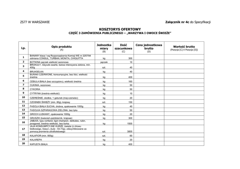 ZS77 W WARSZAWIE Załącznik nr 4c do Specyfikacji KOSZTORYS OFERTOWY CZĘŚĆ 3 ZAMÓWIENIA PUBLICZNEGO – „WARZYWA I OWOCE ŚWIEŻE” Opis produktu Lp. 1 2 3 (A) BANANY klasa I wg Rozporządzenia Komisji WE nr 2257/94 odmiana CONSUL, TURBAN, MONITA, CHIQUITTA BOTWINA pęczek wielkość sezonowa BROKUŁY, różyczki zwarte, barwa intensywna zielona, min. 400g Jednostka miary Ilość szacunkowa Cena jednostkowa brutto (B) (C) (D) kg 300 pęczek 10 szt. 40 BRUKSELKA BURAKI CZERWONE, konsumpcyjne, bez liści, wielkość średnia kg 40 kg 400 6 CEBULA BIAŁA (bez szczypioru), wielkość średnia kg 160 7 CUKINIA, sezonowo kg 50 8 CYKORIA kg 50 9 CYTRYNA (średnia wielkość) kg 10 4 5 10 CZEREŚNIE, słodkie, 1 gatunek (maj-czerwiec) kg 20 11 CZOSNEK ŚWIEŻY (min. 80g), krajowy szt. 150 12 FASOLA BIAŁA SUCHA, drobna, opakowanie 1000g kg 40 13 FASOLKA SZPARAGOWA ZIELONA, bez łyka kg 50 14 GROCH ŁUSKANY, opakowanie 1000g kg 20 15 GRUSZKI (kwiecień-październik, krajowe) JABŁKA, typu cortland, ligol champion, delikates, rubin, jonagored, średnia wielkość, bez korka JAJA KONSUMPCYJNE KURZE, świeże (z chowu klatkowego, klasa L duże - 63-73g), zdezynfekowane za pomocą promienia ultrafioletowego kg 300 kg 1500 szt. 3800 18 KALAFIOR (min. 800g) szt. 60 19 KALAREPA kg 20 20 KAPUSTA BIAŁA kg 400 16 17 Wartość brutto (Pozycja [C] X Pozycja [D]) 21 KAPUSTA CZERWONA, KAPUSTA KISZONA BIAŁA, nie przekwaszona, opakowanie wiaderko plastikowe 5000g kg 350 kg 350 23 KAPUSTA MŁODA, główka min. 800g (maj-czerwiec) szt. 10 24 KAPUSTA PEKIŃSKA (foliowana) kg 300 25 KAPUSTA WŁOSKA, główka 1800-2200g kg 10 26 KIWI (sztuka 15-20g, dostawa na palecie) szt. 400 27 KOPEREK (natka), pęczek, wielkość sezonowa pęczek 100 28 MALINY, suche, (czerwiec-wrzesień) kg 40 29 MANDARYNKA, bezpestkowa kg 300 30 MARCHEW KAROTKA, wielkość średnia, bez naci kg 400 31 NATKA PIETRUSZKI, pęczki o wadze sezonowej OGÓREK KISZONY w naturalnym kwasie z koprem i solą (wiaderko, pojemność 3000-6000g) OGÓREK ZIELONY SZKLARNIOWY ŚWIEŻY (kwiecieńpaździernik) OGÓREK ZIELONY SZKLARNIOWY ŚWIEŻY (listopadmarzec) pęczek 500 kg 350 kg 150 kg 100 50 22 32 33 34 35 PAPRYKA CZERWONA (kwiecień-październik) kg 36 PAPRYKA CZERWONA (listopad-marzec) kg 50 37 PIECZARKI kg 120 38 PIETRUSZKA kg 100 39 POMARAŃCZE TYPU NOWELINA, cienka skórka kg 150 40 POMIDORY CZERWONE (kwiecień-październik) kg 300 41 42 POMIDORY CZERWONE (listopad-marzec) POR kg kg 100 50 43 PORZECZKA CZARNA, świeża, krajowa kg 35 44 RODZYNKI SUŁTAŃSKIE kg 10 45 RZODKIEW BIAŁA, wielkość sezonowa kg 150 46 RZODKIEWKA, okrągła, pęczki 180-250g SAŁATA LODOWA (pakowana każda główka osobno), waga jednej sztuki min. 350g pęczek 200 47 szt. 300 48 SELER KORZENIOWY kg 100 49 SELER NACIOWY (min. 300g) szt. 80 50 SZCZYPIOREK ŚWIEŻY, pęczek, wielkość sezonowa szt. 80 ŚLIWKA SUSZONA, krajowa bez pestek kg 20 52 ŚLIWKI DESEROWE TYPU WĘGIERKA/PREZYDENT,dojrzałość konsumpcyjna, odchodzące od pestek (wrzesień-grudzień, krajowa) kg 200 53 TRUSKAWKA, krajowa, odmiana konsumpcyjna, w całości wybarwiona, dostawa w łubiankach, ( maj-czerwiec ) kg 100 54 WŁOSZCZYZNA (wrzesień-kwiecień) min. 700g szt. 650 55 WŁOSZCZYZNA MŁODA (maj-czerwiec) min. 700g szt. 100 56 ZIEMNIAKI OBIERANE, typu Irga, konsumpcyjne, umyte kg 7000 57 ŻURAWINA ŚWIEŻA kg 80 51 RAZEM WARTOŚĆ BRUTTO ZA CZĘŚĆ: ……………………………………………………………………….. Data i podpis osób/y upoważnionej do reprezentowania wykonawcy