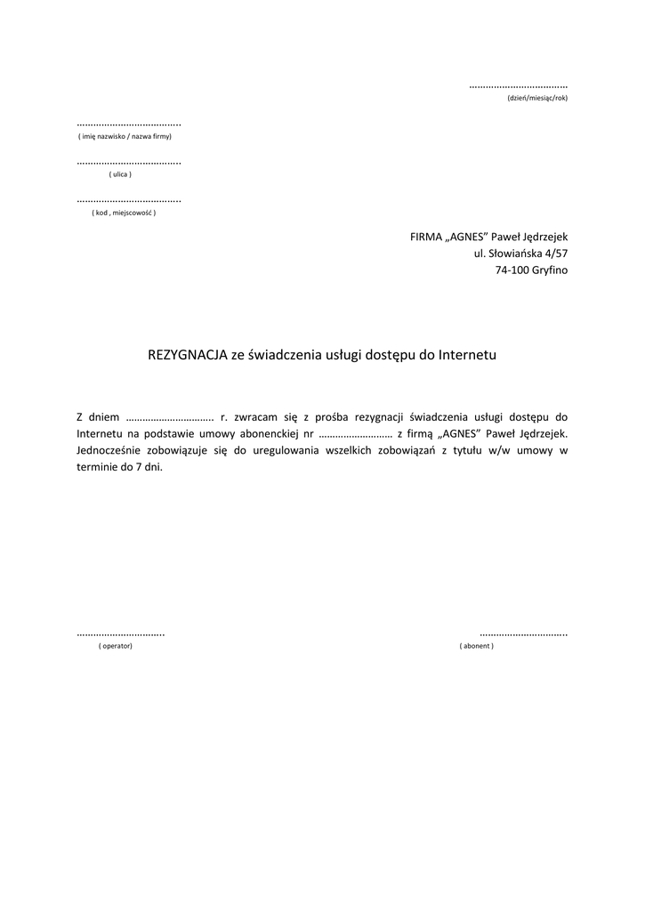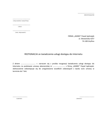 ……………………………… (dzieo/miesiąc/rok) ……………………………….. ( imię nazwisko / nazwa firmy) ……………………………….. ( ulica ) ……………………………….. ( kod , miejscowośd ) FIRMA „AGNES” Paweł Jędrzejek ul. Słowiaoska 4/57 74-100 Gryfino REZYGNACJA ze świadczenia usługi dostępu do Internetu Z dniem ………………………….. r. zwracam się z prośba rezygnacji świadczenia usługi dostępu do Internetu na podstawie umowy abonenckiej nr ……………………… z firmą „AGNES” Paweł Jędrzejek. Jednocześnie zobowiązuje się do uregulowania wszelkich zobowiązao z tytułu w/w umowy w terminie do 7 dni. ………………………….. ( operator) ………………………….. ( abonent )