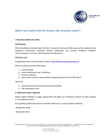 Gdzie i jak wysłać pliki do analizy i jak otrzymać raport? I. Wysyłanie plików do analizy Anonimizacja Pliki komunikatów rozliczeniowych dla NFZ w otwartym formacie (XML) powinny byd poddane przed wysłaniem anonimizacji (usunięciu danych osobowych) przy pomocy programu CONVERT zamieszczonego na stronie, z której pobrano ten dokument. Wysłanie maila Przygotowane dane należy przesład na adres [email protected] Mail ma zawierad poniższe informacje: 1. 2. 3. 4. nazwa szpitala osoba kontaktowa wraz z telefonem miesiąc rozliczany adres email, na który należy odesład przygotowany przez firmę CGM raport Załączniki: Zanonimizowany skompresowany plik komunikatu Plik umowy(ów) z NFZ II. Odebranie maila z raportem Raport będzie odesłany w ciągu maksymalnie 48 godzin po otrzymaniu danych na adres podany w mailu zgłoszeniowym. W przypadku problemów prosimy o kontakt telefoniczny z naszym działem HelpDesk: +48 (81) 441 69 00 +48 (81) 441 69 01 CompuGroup Medical Polska Sp. z o.o. (dawniej UHC Sp. z o.o.), ul. Do Dysa 9, 20-149 Lublin, T +48 81 444 20 15 , F +48 81 444 20 18, www.compugroup.pl SR Lublin-Wschód VI WG KRS 0000136033 KZ 810.000,00 PLN, REGON: 430585884 NIP: 712-10-76-075