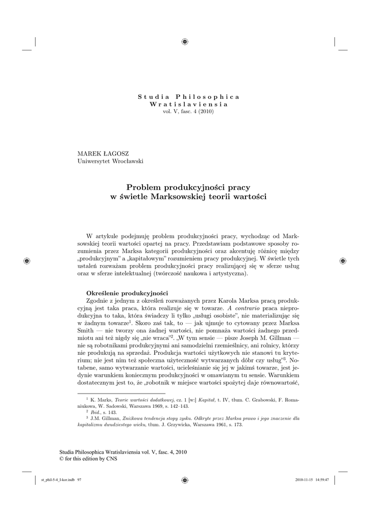 Studia Philosophica Wr a t i s l av i e n s i a vol. V, fasc. 4 (2010) MAREK ŁAGOSZ Uniwersytet Wrocławski Problem produkcyjności pracy w świetle Marksowskiej teorii wartości W artykule podejmuję problem produkcyjności pracy, wychodząc od Marksowskiej teorii wartości opartej na pracy. Przedstawiam podstawowe sposoby rozumienia przez Marksa kategorii produkcyjności oraz akcentuję różnicę między „produkcyjnym” a „kapitałowym” rozumieniem pracy produkcyjnej. W świetle tych ustaleń rozważam problem produkcyjności pracy realizującej się w sferze usług oraz w sferze intelektualnej (twórczość naukowa i artystyczna). Określenie produkcyjności Zgodnie z jednym z określeń rozważanych przez Karola Marksa pracą produkcyjną jest taka praca, która realizuje się w towarze. A contrario praca nieprodukcyjna to taka, która świadczy li tylko „usługi osobiste”, nie materializując się w żadnym towarze1. Skoro zaś tak, to — jak ujmuje to cytowany przez Marksa Smith — nie tworzy ona żadnej wartości, nie pomnaża wartości żadnego przedmiotu ani też nigdy się „nie wraca”2. „W tym sensie — pisze Joseph M. Gillman — nie są robotnikami produkcyjnymi ani samodzielni rzemieślnicy, ani rolnicy, którzy nie produkują na sprzedaż. Produkcja wartości użytkowych nie stanowi tu kryterium; nie jest nim też społeczna użyteczność wytwarzanych dóbr czy usług”3. Notabene, samo wytwarzanie wartości, ucieleśnianie się jej w jakimś towarze, jest jedynie warunkiem koniecznym produkcyjności w omawianym tu sensie. Warunkiem dostatecznym jest to, że „robotnik w miejsce wartości spożytej daje równowartość, 1 K. Marks, Teorie wartości dodatkowej, cz. 1 [w:] Kapitał, t. IV, tłum. C. Grabowski, F. Romaniukowa, W. Sadowski, Warszawa 1969, s. 142–143. 2 Ibid., s. 143. 3 J.M. Gillman, Zniżkowa tendencja stopy zysku. Odkryte przez Marksa prawo i jego znaczenie dla kapitalizmu dwudziestego wieku, tłum. J. Grzywicka, Warszawa 1961, s. 173. Studia Philosophica Wratislaviensia vol. V, fasc. 4, 2010 © for this edition by CNS st_phil-5-4_I-kor.indb 97 2010-11-15 14:59:47 M. Łagosz, Problem produkcyjności pracy 98 dodając swą pracą do jakiegokolwiek materiału taką samą ilość wartości, jaką zawierała jego płaca robocza”4. „produkcyjny — pisze Marks — jest ten pracownik, którego praca wytwarza towary i który przy tym spożywa towarów nie więcej, niż sam wytwarza, niż kosztuje jego praca. Praca jego utrwala się i przybiera postać jakiegoś przedmiotu, który nadaje się do sprzedaży i wymiany, towaru, a więc tak, że można ją sprzedać i na tej drodze odtworzyć wartość ich utrzymania i wynagrodzenia [...]”5. Powyższe określenie produkcyjności pracy nie zawiera wytwarzania wartości dodatkowej jako warunku koniecznego. Inne jeszcze uwzględniane przez Marksa za klasyczną ekonomią, a zarazem podstawowe według niego, rozumienie produkcyjności jest następujące: „tylko ta praca najemna jest produkcyjna, która tworzy więcej wartości, niż sama kosztuje”6. Warunkiem dostatecznym produkcyjności jest tu więc tworzenie wartości dodatkowej. „produkcyjność kapitału — pisze Marks — polega przede wszystkim na przymuszaniu do pracy dodatkowej, czyli do pracy ponad bezpośrednią potrzebę”7. W tym znaczeniu produkcyjność można utożsamić z wyzyskiem. Wynika stąd, że z kolei „siła robocza jest produkcyjna na skutek różnicy między jej wartością a wartością powstającą w wyniku jej zastosowania”8. Produkcyjną nazywa Marks taką pracę, która przekształca towar lub pieniądz na kapitał, czyli „utrzymuje i pomnaża wartość pracy uprzedmiotowionej, oddzielonej od siły roboczej i jej przeciwstawionej. Produkcyjność siły roboczej oznacza sposób jej występowania w kapitalistycznym sposobie produkcji”9. Produkcyjna jest praca wytwarzająca wartość dodatkową dla tego, kto ją zatrudnia, a tym samym, „która obiektywne warunki pracy przekształca na kapitał, a jej posiadacza — na kapitalistę”10. Jeszcze inaczej można powiedzieć za Marksem, że produkcyjna jest ta praca, „która się wymienia bezpośrednio na kapitał ”11; praca ta sprawia, że „produkcyjne warunki pracy i wartość w ogóle, pieniądz lub towary, przekształcają się dopiero w kapitał”12. W przeciwieństwie do pracy produkcyjnej praca nieprodukcyjna wymienia się „bezpośrednio na dochód”13, tj. na płacę roboczą lub zysk, a także na rozmaite procenty i renty uczestniczące w uzyskiwanej przez kapitał wartości dodatkowej. Można też powiedzieć, że za pracę produkcyjną płaci kapitał, a za nieprodukcyjną dochód. Praca produkcyjna jest tu określona z punktu widzenia produkcji kapitalistycznej. W tym poszerzonym, „kapitalistycznym” rozumieniu nieprodukcyjne będą nie tylko takie prace, które nie wytwarzają żadnej wartości, ale też takie, które wytwarzają mniej wartości, niż spożywają. 4 5 6 7 8 9 10 11 12 13 K. Marks, Teorie, cz. 1, s. 144. Ibid., s. 146. Ibid., s. 135. Ibid., s. 409. Ibid., s. 412. Ibid., s. 415–416. Ibid., s. 416. Ibid., s. 138. Ibid., s. 138–139. Ibid., s. 139. Studia Philosophica Wratislaviensia vol. V, fasc. 4, 2010 © for this edition by CNS st_phil-5-4_I-kor.indb 98 2010-11-15 14:59:47 Studia Philosophica Wratislaviensia V, 4 (2010) 99 Problem produkcyjności usług Zgodnie z pierwszym z podanych wyżej określeń produkcyjności pracę wytwarzającą określone produkty przeciwstawia się — jako produkcyjną — nieprodukcyjnej pracy polegającej na świadczeniu usług. Przyjrzyjmy się jednak, jak dalece taki „sztywny” podział daje się utrzymać. Przede wszystkim zauważmy, że wszelkie usługi „okołoprodukcyjne”, tj. stanowiące „niematerialną” pracę personelu współpracującego z robotnikami bezpośrednio wytwarzającymi produkty, jak: praca inżyniera, nadzorcy, subiekta handlowego czy strażnika