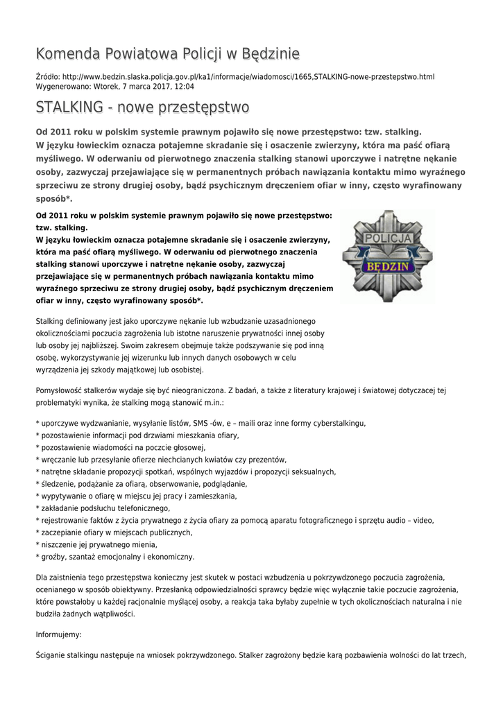 Komenda Powiatowa Policji w Będzinie Źródło: http://www.bedzin.slaska.policja.gov.pl/ka1/informacje/wiadomosci/1665,STALKING-nowe-przestepstwo.html Wygenerowano: Wtorek, 7 marca 2017, 12:04 STALKING - nowe przestępstwo Od 2011 roku w polskim systemie prawnym pojawiło się nowe przestępstwo: tzw. stalking. W języku łowieckim oznacza potajemne skradanie się i osaczenie zwierzyny, która ma paść ofiarą myśliwego. W oderwaniu od pierwotnego znaczenia stalking stanowi uporczywe i natrętne nękanie osoby, zazwyczaj przejawiające się w permanentnych próbach nawiązania kontaktu mimo wyraźnego sprzeciwu ze strony drugiej osoby, bądź psychicznym dręczeniem ofiar w inny, często wyrafinowany sposób*. Od 2011 roku w polskim systemie prawnym pojawiło się nowe przestępstwo: tzw. stalking. W języku łowieckim oznacza potajemne skradanie się i osaczenie zwierzyny, która ma paść ofiarą myśliwego. W oderwaniu od pierwotnego znaczenia stalking stanowi uporczywe i natrętne nękanie osoby, zazwyczaj przejawiające się w permanentnych próbach nawiązania kontaktu mimo wyraźnego sprzeciwu ze strony drugiej osoby, bądź psychicznym dręczeniem ofiar w inny, często wyrafinowany sposób*. Stalking definiowany jest jako uporczywe nękanie lub wzbudzanie uzasadnionego okolicznościami poczucia zagrożenia lub istotne naruszenie prywatności innej osoby lub osoby jej najbliższej. Swoim zakresem obejmuje także podszywanie się pod inną osobę, wykorzystywanie jej wizerunku lub innych danych osobowych w celu wyrządzenia jej szkody majątkowej lub osobistej. Pomysłowość stalkerów wydaje się być nieograniczona. Z badań, a także z literatury krajowej i światowej dotyczacej tej problematyki wynika, że stalking mogą stanowić m.in.: * uporczywe wydzwanianie, wysyłanie listów, SMS -ów, e – maili oraz inne formy cyberstalkingu, * pozostawienie informacji pod drzwiami mieszkania ofiary, * pozostawienie wiadomości na poczcie głosowej, * wręczanie lub przesyłanie ofierze niechcianych kwiatów czy prezentów, * natrętne składanie propozycji spotkań, wspólnych wyjazdów i propozycji seksualnych, * śledzenie, podążanie za ofiarą, obserwowanie, podglądanie, * wypytywanie o ofiarę w miejscu jej pracy i zamieszkania, * zakładanie podsłuchu telefonicznego, * rejestrowanie faktów z życia prywatnego z życia ofiary za pomocą aparatu fotograficznego i sprzętu audio – video, * zaczepianie ofiary w miejscach publicznych, * niszczenie jej prywatnego mienia, * groźby, szantaż emocjonalny i ekonomiczny. Dla zaistnienia tego przestępstwa konieczny jest skutek w postaci wzbudzenia u pokrzywdzonego poczucia zagrożenia, ocenianego w sposób obiektywny. Przesłanką odpowiedzialności sprawcy będzie więc wyłącznie takie poczucie zagrożenia, które powstałoby u każdej racjonalnie myślącej osoby, a reakcja taka byłaby zupełnie w tych okolicznościach naturalna i nie budziła żadnych wątpliwości. Informujemy: Ściganie stalkingu następuje na wniosek pokrzywdzonego. Stalker zagrożony będzie karą pozbawienia wolności do lat trzech, chyba że w wyniku tego przestępstwa pokrzywdzony targnie się na własne życie. W takiej sytuacji przestępstwo to będzie zagrożone karą pozbawienia wolności od roku do dziesięciu lat. Źródło: Policja nr 6(75) czerwiec 2011 r. *Chlebowska A., Nalewajko P. „Stalking - zarys problemu oraz analiza rozwiązań ustawodawcy niemieckiego, austriackiego i polskiego” W: Prokurator 4 (44) 2010/1 (45)-2011 Ocena: 0/5 (0) Tweetnij