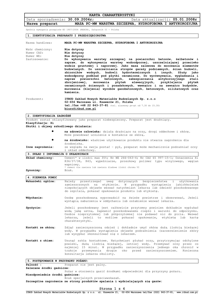 KARTA CHARAKTERYSTYKI Data sporządzenia: 30.09.2004r; Data aktualizacji: 05.01.2008r Nazwa preparat MASA PC-MW WARSTWA SZCZEPNA, HYDROFOBOWA I ANTYKOROZYJNA Spełnia wymagania przepisów EC 1907/2006 (REACH), Załącznik II – Polska 1. IDENTYFIKACJA PREPARATU I PRZEDSIĘBIORSTWA Nazwa handlowa: MASA PC-MW WARSTWA SZCZEPNA, HYDROFOBOWA I ANTYKOROZYJNA Wzór chemiczny: Numer CAS: Numer WE: Zastosowanie: Nie dotyczy Nie dotyczy Nie dotyczy Do wykonywania warstwy szczepnej na powierzchni betonów, żelbetonów i zapraw, do wykonywania warstwy wodoodpornej, uszczelniającej przeciwko wodzie gruntowej i naporowej. Jako masa zalewowa do mocowania elementów budowlanych. Do uszczelniania stropów garaży podziemnych, ścian budowli, zbiorników wodnych, budowli hydrotermicznych i innych. Służy jako wodoodporny podkład pod płytki ceramiczne. Do wyrównywania, wygładzania i napraw powierzchni betonowych, zabezpieczania antykorozyjnego stali zbrojeniowej, mocowania płytek elewacyjnych, przyklejania płytek ceramicznych ściennych i posadzkowych, wewnątrz i na zewnątrz budynków, murowania (klejenia) wyrobów gazobetonowych, betonowych, silikatowych oraz kamienia. Producent: ITBUD Zakład Nowych Materiałów Budowlanych Sp. z.o.o 02-656 Warszawa ul. Ksawerów 21, Polska tel./fax +48 22 843-37-81 (tel. alarmowy pn-pt od 7.30 do 15.30) [email protected] 2. IDENTYFIKACJA ZAGROŻEŃ Produkt został sklasyfikowany jako preparat niebezpieczny. Preparat jest drażniący. Klasyfikacja: Xi Skutki i objawy szkodliwego działania: na zdrowie człowieka: działa drażniąco na oczy, drogi oddechowe i skórę. Może powodować uczulenie w kontakcie ze skórą. na środowisko: właściwe użytkowanie produktu nie stwarza zagrożenia dla środowiska. Inne zagrożenia: ze względu na swoja postać – pył, preparat może mechanicznie podrażniać oczy i układ oddechowy. 3. SKŁAD I INFORMACJA O SKŁADNIKACH Skład chemiczny: Cement* w ilości max 35%; Nr WE 266-043-4; Nr CAS 65 997–15-1; Oznaczenia Xi R36/37/38, R43, wypełniacze, proszkowy polimer typu winylowego, węglan wapniowy. * cement nie zawiera lub zawiera śladowe ilości chromu VI Synonimy: 4. PIERWSZA POMOC Wskazówki ogólne: Brak. Należy przestrzegać uwag dotyczących bezpieczeństwa i użytkowania zamieszczonych na etykiecie. W przypadku wystąpienia jakichkolwiek niepokojących objawów wezwać natychmiast lekarza lub odwieźć poszkodowanego do szpitala, pokazać opakowanie produktu lub etykietę. Wdychanie: Osobę poszkodowaną wyprowadzić na świeże powietrze i obserwować, wystąpią zaburzenia w oddychaniu lub osłabienie wezwać lekarza. Jeżeli Spożycie: Jeżeli poszkodowany jest całkowicie przytomny powinien dokładnie wypłukać wodą jamę ustną. Zapewnić poszkodowanemu ciepło i warunki do odpoczynku. Osobie nieprzytomnej lub półprzytomnej nie podawać nic do picia. Wezwać lekarza, jeżeli to możliwe pokazać opakowanie, etykietę lub kartę charakterystyki. Kontakt ze skórą: Zdjąć zanieczyszczoną odzież i dokładnie umyć skórę dużą ilością bieżącej wody. W przypadku wystąpienia objawów podrażnienia (zaczerwienienie skóry lub wysypka) skonsultować się z lekarzem. Kontakt z okiem: Usunąć szkła kontaktowe. Natychmiast płukać oczy, przytrzymując powieki, dużą ilością bieżącej, letniej wody. Przemywać oczy najmniej 15 minut. W przypadku zanieczyszczenia jednego oka trakcie przemywania drugie oko przed zanieczyszczeniem. konsultacja lekarza okulisty. odchylone przez co chronić w Konieczna 5. POSTĘPOWANIE W PRZYPADKU POŻARU: Palność : Preparat nie jest palny. Zalecane środki gaśnicze: Pożar w otoczeniu gasić środkami odpowiednimi dla przyczyny pożaru. Nieodpowiednie środki gaśnicze: Brak specjalnych przeciwwskazań. Szczególne zagrożenie ze strony produktów spalania i wydzielających się gazów: Strona 1 z 4 ITBUD Zakład Nowych Materiałów Budowlanych Sp. z o.o. ul. Ksawerów 21, 02-656 Warszawa tel/fax (022) 843-37-81, www.itbud.com.pl KARTA CHARAKTERYSTYKI Data sporządzenia: 30.09.2004r; Data aktualizacji: 05.01.2008r Nazwa preparat MASA PC-MW WARSTWA SZCZEPNA, HYDROFOBOWA I ANTYKOROZYJNA Spełnia wymagania przepisów EC 1907/2006 (REACH), Załącznik II – Polska Nie istnieje żadne szczególne zagrożenie związane z właściwościami samego preparatu, produktów spalania lub powstających gazów. Specjalne wyposażenie ochronne strażaków: Dostosowane do przyczyny pożaru. 6. POSTĘPOWANIE W PRZYPADKU NIEZAMIERZONEGO UWOLNIENIA DO ŚRODOWISKA Indywidualne środki ostrożności: Unikać wdychania pyłu, kontaktu ze skórą i oczami. Środki ostrożności w zakresie ochrony środowiska: Nie należy dopuścić do przedostania się dużych ilości produktu do kanalizacji, wód gruntowych lub powierzchniowych oraz gleby. Metody oczyszczania/usuwania: Odkurzyć powierzchnie lub zamieść nie wzbijając pyłów. Duże ilości odpadów usuwać zgodnie z obowiązującymi przepisami. Stwardniały pod wpływem wilgoci produkt można traktować jako gruz budowlany. 7. POSTĘPOWANIE Z SUBSTANCJĄ I JEJ MAGAZYNOWANIE Postępowanie z preparatem: Podczas przenoszenia unikać wzbijania pyłu. Magazynowanie: Przechowywać w zamkniętych oryginalnych opakowaniach w suchych pomieszczeniach, najlepiej na paletach. Chronić przed wilgocią – produkt pod wpływem wilgoci ulega stwardnieniu. Specyficzne zastosowania: Brak. 8. KONTROLA NARAŻENIA I ŚRODKI OCHRONY INDYWIDUALNEJ Rozporządzenie Ministra Pracy i Polityki Społecznej z dnia 29 listopada 2002 roku w sprawie najwyższych dopuszczalnych stężeń i natężeń czynników szkodliwych dla zdrowia w środowisku pracy (Dz.U. nr 217 z 2002 r., poz. 1833): NDS i NDSCh: pyły cementu portlandzkiego i hutniczego: - pył całkowity NDS – 6 mg/m3 - pył respirabilny NDS mg/m3 Normy biologiczne (DSB): Brak Kontrola narażenia w miejscu pracy: Zapewnić właściwą wentylację pomieszczenia podczas pracy z preparatem oraz środki 
