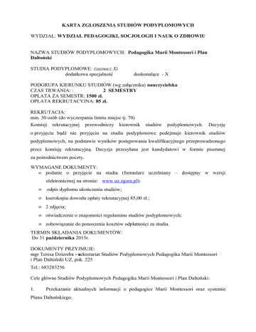 KARTA ZGŁOSZENIA STUDIÓW PODYPLOMOWYCH WYDZIAŁ: WYDZIAŁ PEDAGOGIKI, SOCJOLOGII I NAUK O ZDROWIU NAZWA STUDIÓW PODYPLOMOWYCH: Pedagogika Marii Montessori i Plan Daltoński STUDIA PODYPLOMOWE: (zaznacz X) dodatkowa specjalność doskonalące - X PODGRUPA KIERUNKU STUDIÓW (wg załącznika) nauczycielska CZAS TRWANIA: : 2 SEMESTRY OPŁATA ZA SEMESTR: 1500 zł. OPŁATA REKRUTACYJNA: 85 zł. REKRUTACJA: min. 30 osób (do wyczerpania limitu miejsc tj. 70) Komisji rekrutacyjnej przewodniczy kierownik studiów podyplomowych. Decyzję o przyjęciu bądź nie przyjęciu na studia podyplomowe podejmuje kierownik studiów podyplomowych, na podstawie wyników postępowania kwalifikacyjnego przeprowadzonego przez komisję rekrutacyjną. Decyzja przesyłana jest kandydatowi w formie pisemnej za pośrednictwem poczty. WYMAGANE DOKUMENTY: • podanie o przyjęcie na studia (formularz uczelniany – dostępny w wersji elektronicznej na stronie: www.uz.zgora.pl); • odpis dyplomu ukończenia studiów; • kserokopia dowodu opłaty rekrutacyjnej 85,00 zł.; • 2 zdjęcia; • oświadczenie o znajomości regulaminu studiów podyplomowych; • zobowiązanie do ponoszenia kosztów odpłatności za studia. TERMIN SKŁADANIA DOKUMENTÓW: Do 31 października 2015r. DOKUMENTY PRZYJMUJE: mgr Teresa Dzierzba - sekretariat Studiów Podyplomowych Pedagogika Marii Montessori i Plan Daltoński UZ, pok. 225 Tel.: 683283256 Cele główne Studiów Podyplomowych Pedagogika Marii Montessori i Plan Daltoński: 1. Przekazanie aktualnych informacji o pedagogice Marii Montessori oraz systemie Planu Daltońskiego. 2. Wyposażenie w umiejętność posługiwania się pomocami dydaktycznymi stosowanymi w systemie montessoriańskim oraz w Planie Daltońskim. 3. Wyposażenie w umiejętność samodzielnego projektowania i wykonywania trwałych pomocy dydaktycznych, uwzględniając w ich konstrukcji zasadę samokontroli, wolności, odpowiedzialności i współpracy. 4. Ułatwienie dokonania samodzielnego wyboru pomiędzy tradycyjnymi i alternatywnymi rozwiązaniami metodycznymi i organizacyjnymi pracy przedszkola i szkoły ze wskazaniem na możliwości korzystania z elementów Pedagogiki Montessori i Planu Daltońskiego. 5. Umożliwienie stosowania licznych rozwiązań metodycznych z zakresu systemu montessoriańskiego i Planu Daltońskiego przy prowadzeniu nauczania zindywidualizowanego. - do kogo adresowane: Absolwenci studiów licencjackich lub magisterskich posiadający kwalifikacje pedagogiczne. Osoby pracujące z dziećmi w placówkach oświatowo – wychowawczych, opiekuńczych i terapeutycznych oraz z dziećmi na poziomie edukacji przedszkolnej i wczesnoszkolnej a także do innych osób, które są zainteresowane indywidualizacją w procesie edukacji dziecka. - kwalifikacje po ukończeniu studiów: Po ukończeniu studiów absolwenci otrzymują świadectwo ukończenia Studiów Podyplomowych Pedagogika Marii Montessori i Plan Daltoński. Studia przygotowują do samodzielnego prowadzenia zajęć edukacyjnych metodami Montessori oraz Planu Daltońskiego w placówkach opiekuńczych i terapeutycznych, w przedszkolach i klasach 1-3 szkoły podstawowej oraz w innych sytuacjach pedagogicznych, uwzględniających indywidualne potrzeby rozwojowe dziecka (nauczanie domowe). INFORMACJE DODATKOWE: Studia Podyplomowe Pedagogika Marii Montessori i Plan Daltoński funkcjonują na Wydziale Pedagogiki, Socjologii i Nauk o Zdrowiu Uniwersytetu Zielonogórskiego. Studia realizowane są w trybie niestacjonarnym, w formie zjazdów według ustalonego dla realizowanej edycji harmonogramu (co 2 tygodnie, w soboty i niedziele). Zajęcia dydaktyczne prowadzone są w formie wykładów i ćwiczeń (przeważają zajęcia o charakterze ćwiczeniowym i praktycznym) i odbywają się w budynku dydaktycznym UZ przy al. Wojska Polskiego 69, w którym zabezpieczono adekwatną do ich potrzeb bazę dydaktyczno-techniczną. W planie studiów przewidziane są także praktyki hospitacyjne (30 godzin). KIEROWNIK STUDIÓW: dr Mirosława Nyczaj-Drąg