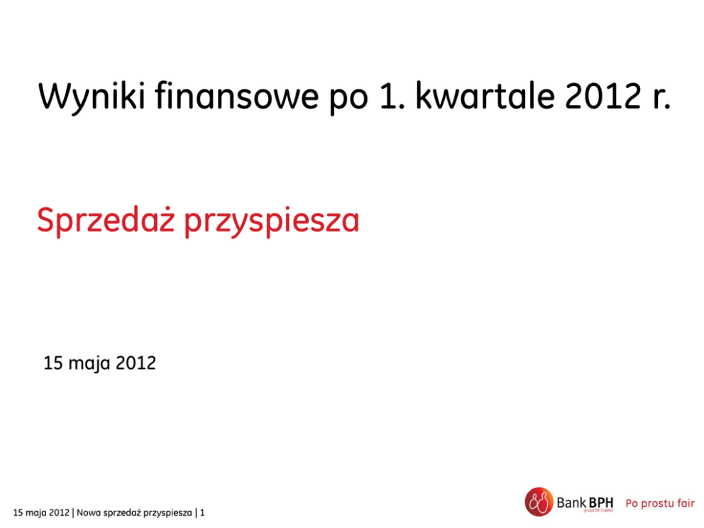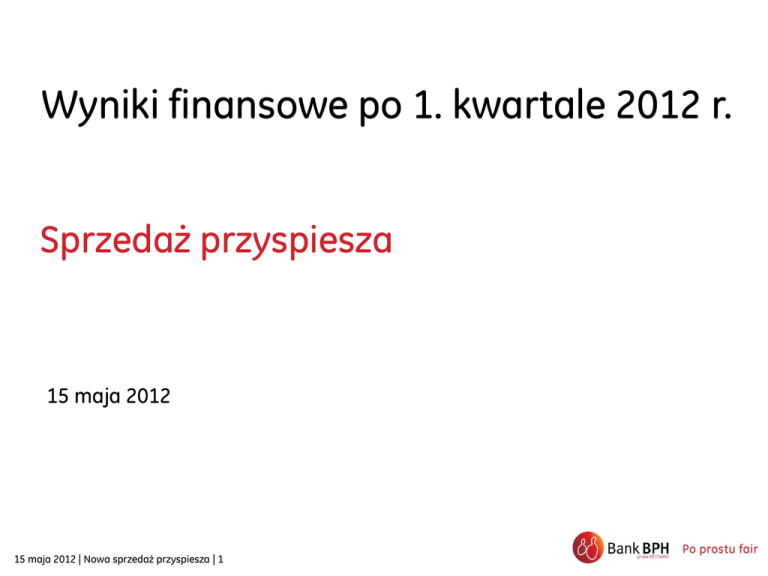 Wyniki finansowe po 1. kwartale 2012 r. Sprzedaż przyspiesza 15 maja 2012 15 maja 2012 | Nowa sprzedaż przyspiesza | 1 Zastrzeżenie Niniejsza prezentacja nie jest częścią jakiejkolwiek oferty, zaproszenia, zachęty lub formy nakłaniania do sprzedaży lub składania zapisów na papiery wartościowe. Niniejsza prezentacja nie zawiera wszystkich informacji, które mogą być wymagane przez przyszłego inwestora. Niniejsza prezentacja, jej część, jak również okoliczności jej dystrybucji nie stanowią podstawy dla jakiejkolwiek umowy nabycia lub składania zapisów na papiery wartościowe. Prognozy oraz przewidywania zawarte w prezentacji opierają się na szeregu założeń i szacunków, uznanych przez nas za racjonalne, jednakże w sposób oczywisty podlegają wpływowi istotnych przyszłych i niepewnych zdarzeń biznesowych, operacyjnych, gospodarczych i konkurencyjnych, z których wiele pozostaje poza naszą kontrolą. Ponadto opierają się one na założeniach dotyczących przyszłych decyzji biznesowych, które mogą ulec zmianie. Rzeczywiste wyniki mogą znacząco odbiegać od zakładanych. Niektóre dane liczbowe i procentowe przedstawione w niniejszej prezentacji mogą się nie sumować z uwagi na dokonane zaokrąglenia. 15 maja 2012 | Nowa sprzedaż przyspiesza | 2 Agenda 1 Najważniejsze informacje 2 Wyniki finansowe 3 Podsumowanie 15 maja 2012 | Nowa sprzedaż przyspiesza | 3 Najważniejsze informacje 15 maja 2012 | Nowa sprzedaż przyspiesza | 4 Najważniejsze informacje Zyskowność • Zysk netto 61 mln zł w 1 kw… wzrost o 28,5% r/r Wyniki • 77% wzrost nowo udzielanych kredytów gotówkowych r/r … 52% wzrost kredytów korporacyjnych r/r Marka • Znacząca poprawa wskaźników rozpoznawalności marki Koszty • Dalsza optymalizacja kosztów ogłoszona… docelowy wskaźnik koszty/dochody poniżej 60% do 2015 r. Odpisy na utratę wartości • 74% spadek odpisów na utratę wartości kredytów r/r… poprawa jakości portfela detalicznego i MSP… pozytywne trendy w jakości „starego” portfela Bezpieczeństwo • Adekwatny poziom kapitału… współczynnik wypłacalności 15,1% 15 maja 2012 | Nowa sprzedaż przyspiesza | 5 Aktualne wyniki pozycjonowania marki Wdrożone projekty i inicjatywy wspierające nowe pozycjonowanie fair play • • Nowa, wyróżniająca się platforma komunikacyjna Koncentracja na filozofii fair play i zaufania wsparta dowodami potwierdzającymi pozycjonowanie oraz przejrzystą komunikacją opartą na faktach • Kampanie produktowe Nowa platforma komunikacyjna produktów (kredyty gotówkowe, konta osobiste, faktoring, MSP) 21 dni na rezygnację z kredytu bez ponoszenia kosztów • • • Komunikacja marketingowa 2012 Konta osobiste… bez ukrytych kosztów Asystent Finansowy SMS-owy system monitorowania zapytań i reklamacji Klientów • Forum Klientów Banku BPH i Rada Klientów Biznesowych Efekt – kluczowe wskaźniki rozpoznawalności i wizerunku marki znacząco wzrosły Pierwszy wymieniony bank Cel 5% w 2012 r. przekroczony! „Bank, który gra fair” Cel #1 w 2012 r. osiągnięty! „Bank odpowiedzialny społecznie” #5 7% #2 4% 102 Mar'11 Mar'12 */ Brand Tracking Study, Ipsos, 2012 15 maja 2012 | Nowa sprzedaż przyspiesza | 6 #2 #1 #8 Mar'11 123 #3 121 110 Mar'12 „Bank, któremu ufam” Mar'11 #5 #5 104 95 Mar'12 Mar'11 Mar'12 Działalność Banku Bankowość komercyjna Bankowość detaliczna Nowy wolumen kredytów gotówkowych (mln zł) +77% • Najwyższa sprzedaż od fuzji… Nowy wolumen kredytów korporacyjnych 167 mln zł w marcu (mln zł) • Wskaźnik kredytów z utratą 444 wartości powyżej 30 dni spadł z 7,9% do 5,5% r/r 251 +52% • Zdobywanie Klientów o 612 wysokim poziomie wiarygodności 402 • 421 mln zł kredytów udzielonych MSP (stabilnie r/r) 1kw.11 1kw.12 1Q'11 1kw.11 1Q'12 1kw.12 • Nowy wygląd bankowości internetowej oraz Asystent Finansowy wdrożone Nowe podejście do MSP • Poprawa użyteczności serwisu Gotówka online (strony internetowej, za pomocą • Wielocelowe linie kredytowe i której możliwe jest złożenie aplikacji kredyty inwestycyjne z kredytu gotówkowego) poręczeniem EFI • 3 nowe oddziały, uruchomienie obsługi • Skrócenie oczekiwania na gotówkowej w 10 oddziałach oraz decyzję kredytową do 24h dla modernizacja 22 oddziałów produktów scoringowych 15 maja 2012 | Nowa sprzedaż przyspiesza | 7 Program optymalizacji kosztów – 3 kluczowe obszary Uproszczenie struktury organizacyjnej • Restrukturyzacja do 600 pracowników… negocjacje ze związkami zawodowymi zakończone • Koncentracja na back-office… minimalny wpływ na siłę sprzedażową • Oszczędności ~60 mln zł rocznie od 2013 r. • Koszty restrukturyzacji zaksięgowane w ciężar 2 kw.12 • Realizacja w dużej mierze do lipca ’12 … zakończenie w listopadzie ’12 Infrastruktura IT • Konsolidacja systemów IT • Standaryzacja procesów obsługi Klientów i produktów • Inwestowanie w efektywne systemy sprzedażowe Centrala i oddziały • Inwestowanie w sieć… nowe oddziały, pełna obsługa gotówkowa, odnawianie oraz modernizacja • Jedna lokalizacja centrali w Krakowie w 1kw.13 • Jedna lokalizacja centrali w Gdańsku do 4kw.13 Wskaźnik koszty/dochody (%) -13 pp. 73 1kw.12 60 2015 Konkretne działania w celu redukcji kosztów… wskaźnik koszty/dochody <60% do 2015 r. 15 maja 2012 | Nowa sprzedaż przyspiesza | 8 Wyniki finansowe 15 maja 2012 | Nowa sprzedaż przyspiesza | 9 Kluczowe dane finansowe 1kw.12 mln zł zmiana/kw. zmiana/r. (%) (%) Wynik odsetkowy 320 -6,1% -4,2% Wynik z tytułu opłat i prowizji 139 +1,1% -15,2% Wynik na działalności bankowej* 468 -3,1% -6,8% Odpisy na utratę wartości -30 -65,6% -73,9% Przychody netto po odpisach** 438 +10,9% +13,4% Koszty -352 +8,5% +10,3% -336 stabilne stabilne Zysk brutto 81 stabilny +23,5% Zysk netto 61 +1,6% +28,5% Z wył. restrukturyzacji i jednorazowych pozycji Wyniki lepsze od planu */ wynik na działalności