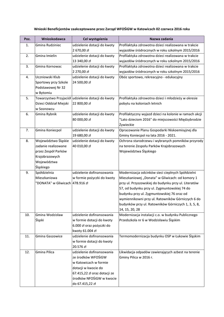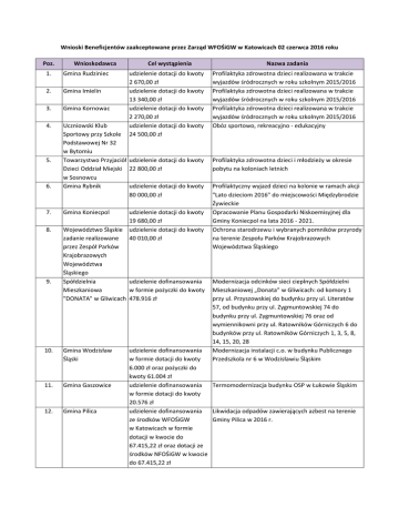 Wnioski Beneficjentów zaakceptowane przez Zarząd WFOŚiGW w Katowicach 02 czerwca 2016 roku Poz. Wnioskodawca Cel wystąpienia 1. Gmina Rudziniec 2. Gmina Imielin 3. Gmina Kornowac 4. Uczniowski Klub Sportowy przy Szkole Podstawowej Nr 32 w Bytomiu Towarzystwo Przyjaciół udzielenie dotacji do kwoty Dzieci Oddział Miejski 22 800,00 zł w Sosnowcu Gmina Rybnik udzielenie dotacji do kwoty 80 000,00 zł 5. 6. 7. 8. 9. Gmina Koniecpol udzielenie dotacji do kwoty 2 670,00 zł udzielenie dotacji do kwoty 13 340,00 zł udzielenie dotacji do kwoty 2 270,00 zł udzielenie dotacji do kwoty 24 500,00 zł udzielenie dotacji do kwoty 19 680,00 zł Województwo Śląskie udzielenie dotacji do kwoty 40 010,00 zł zadanie realizowane przez Zespół Parków Krajobrazowych Województwa Śląskiego Spółdzielnia udzielenie dofinansowania Mieszkaniowa w formie pożyczki do kwoty "DONATA" w Gliwicach 478.916 zł 10. Gmina Wodzisław Śląski 11. Gmina Gaszowice 12. Gmina Pilica Nazwa zadania Profilaktyka zdrowotna dzieci realizowana w trakcie wyjazdów śródrocznych w roku szkolnym 2015/2016 Profilaktyka zdrowotna dzieci realizowana w trakcie wyjazdów śródrocznych w roku szkolnym 2015/2016 Profilaktyka zdrowotna dzieci realizowana w trakcie wyjazdów śródrocznych w roku szkolnym 2015/2016 Obóz sportowo, rekreacyjno - edukacyjny Profilaktyka zdrowotna dzieci i młodzieży w okresie pobytu na koloniach letnich Profilaktyczny wyjazd dzieci na kolonie w ramach akcji "Lato dzieciom 2016" do miejscowości Międzybrodzie Żywieckie Opracowanie Planu Gospodarki Niskoemisyjnej dla Gminy Koniecpol na lata 2016 - 2021. Ochrona starodrzewu i wybranych pomników przyrody na terenie Zespołu Parków Krajobrazowych Województwa Śląskiego Modernizacja odcinków sieci cieplnych Spółdzielni Mieszkaniowej „Donata” w Gliwicach: od komory 1 przy ul. Przyszowskiej do budynku przy ul. Literatów 57, od budynku przy ul. Zygmuntowskiej 74 do budynku przy ul. Zygmuntowskiej 76 oraz od wymiennikowni przy ul. Ratowników Górniczych 6 do budynków przy ul. Ratowników Górniczych 1, 3, 5, 8, 14, 15, 20, 28 Modernizacja instalacji c.o. w budynku Publicznego Przedszkola nr 6 w Wodzisławiu Śląskim udzielenie dofinansowania w formie dotacji do kwoty 6.000 zł oraz pożyczki do kwoty 61.004 zł udzielenie dofinansowania Termomodernizacja budynku OSP w Łukowie Śląskim w formie dotacji do kwoty 20.576 zł udzielenie dofinansowania Likwidacja odpadów zawierających azbest na terenie Gminy Pilica w 2016 r. ze środków WFOŚiGW w Katowicach w formie dotacji w kwocie do 67.415,22 zł oraz dotacji ze środków NFOŚiGW w kwocie do 67.415,22 zł Poz. Wnioskodawca 13. Gmina Kroczyce 14. Gmina Lelów 15. Gmina Koszarawa 16. Gmina Panki 17. Gmina Rajcza 18. Gmina Przystajń Cel wystąpienia Nazwa zadania udzielenie dofinansowania ze środków WFOŚiGW w Katowicach w formie dotacji w kwocie do 18.936,91 zł oraz dotacji ze środków NFOŚiGW w kwocie do 18.936,91 zł udzielenie dofinansowania ze środków WFOŚiGW w Katowicach w formie dotacji w kwocie do 36.898 zł oraz dotacji ze środków NFOŚiGW w kwocie do 36.898 zł udzielenie dofinansowania ze środków WFOŚiGW w Katowicach w formie dotacji w kwocie do 12.485 zł oraz dotacji ze środków NFOŚiGW w kwocie do 12.485 zł udzielenie dofinansowania ze środków WFOŚiGW w Katowicach w formie dotacji w kwocie do 13.081 zł oraz dotacji ze środków NFOŚiGW w kwocie do 13.081 zł udzielenie dofinansowania ze środków WFOŚiGW w Katowicach w formie dotacji w kwocie do 53.000 zł oraz dotacji ze środków NFOŚiGW w kwocie do 53.000 zł udzielenie dofinansowania ze środków WFOŚiGW w Katowicach w formie dotacji w kwocie do 116.860 zł i pożyczki w kwocie do 33.410 zł oraz dotacji ze środków NFOŚiGW w kwocie do 116.860 zł Usuwanie wyrobów zawierających azbest z budynków prywatnych na terenie Gminy Kroczyce w roku 2016 Demontaż, transport i unieszkodliwienie odpadów zawierających azbest z budynków stanowiących własność osób fizycznych z terenu Gminy Lelów - 2016 r. Zebranie, transport i unieszkodliwienie odpadów zawierających azbest pochodzących z budynków zlokalizowanych na terenie Gminy Koszarawa Usuwanie wyrobów zawierających azbest z nieruchomości położonych na terenie Gminy Panki w roku 2016 Usuwanie wyrobów zawierających azbest z terenu Gminy Rajcza Usuwanie wyrobów zawierających azbest z nieruchomości położonych na terenie Gminy Przystajń w roku 2016 Poz. 19. Wnioskodawca Gmina Krzanowice Cel wystąpienia udzielenie dofinansowania ze środków WFOŚiGW w Katowicach w formie dotacji w kwocie do 12.958 zł oraz dotacji ze środków NFOŚiGW w kwocie do 12.958 zł Nazwa zadania Usuwanie wyrobów zawierających azbest z obiektów budownictwa indywidualnego z terenu Gminy Krzanowice w 2016 r. w ramach "Programu usuwania azbestu i wyrobów zawierających azbest z terenu Gminy Krzanowice"
