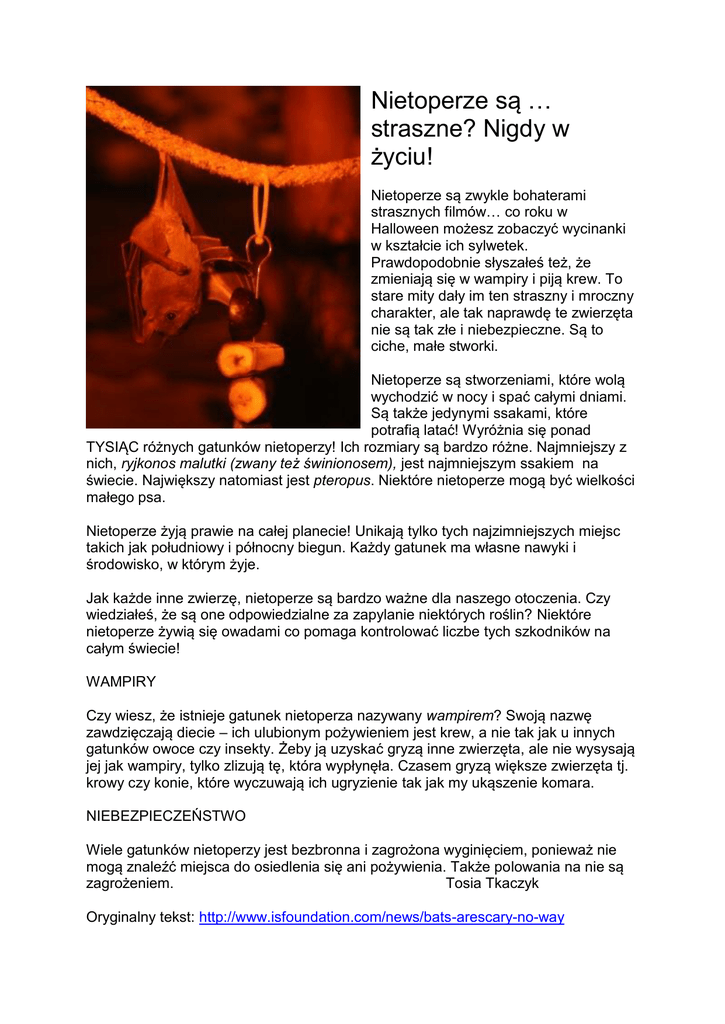 Nietoperze są … straszne? Nigdy w życiu! Nietoperze są zwykle bohaterami strasznych filmów… co roku w Halloween możesz zobaczyć wycinanki w kształcie ich sylwetek. Prawdopodobnie słyszałeś też, że zmieniają się w wampiry i piją krew. To stare mity dały im ten straszny i mroczny charakter, ale tak naprawdę te zwierzęta nie są tak złe i niebezpieczne. Są to ciche, małe stworki. Nietoperze są stworzeniami, które wolą wychodzić w nocy i spać całymi dniami. Są także jedynymi ssakami, które potrafią latać! Wyróżnia się ponad TYSIĄC różnych gatunków nietoperzy! Ich rozmiary są bardzo różne. Najmniejszy z nich, ryjkonos malutki (zwany też świnionosem), jest najmniejszym ssakiem na świecie. Największy natomiast jest pteropus. Niektóre nietoperze mogą być wielkości małego psa. Nietoperze żyją prawie na całej planecie! Unikają tylko tych najzimniejszych miejsc takich jak południowy i północny biegun. Każdy gatunek ma własne nawyki i środowisko, w którym żyje. Jak każde inne zwierzę, nietoperze są bardzo ważne dla naszego otoczenia. Czy wiedziałeś, że są one odpowiedzialne za zapylanie niektórych roślin? Niektóre nietoperze żywią się owadami co pomaga kontrolować liczbe tych szkodników na całym świecie! WAMPIRY Czy wiesz, że istnieje gatunek nietoperza nazywany wampirem? Swoją nazwę zawdzięczają diecie – ich ulubionym pożywieniem jest krew, a nie tak jak u innych gatunków owoce czy insekty. Żeby ją uzyskać gryzą inne zwierzęta, ale nie wysysają jej jak wampiry, tylko zlizują tę, która wypłynęła. Czasem gryzą większe zwierzęta tj. krowy czy konie, które wyczuwają ich ugryzienie tak jak my ukąszenie komara. NIEBEZPIECZEŃSTWO Wiele gatunków nietoperzy jest bezbronna i zagrożona wyginięciem, ponieważ nie mogą znaleźć miejsca do osiedlenia się ani pożywienia. Także polowania na nie są zagrożeniem. Tosia Tkaczyk Oryginalny tekst: http://www.isfoundation.com/news/bats-arescary-no-way