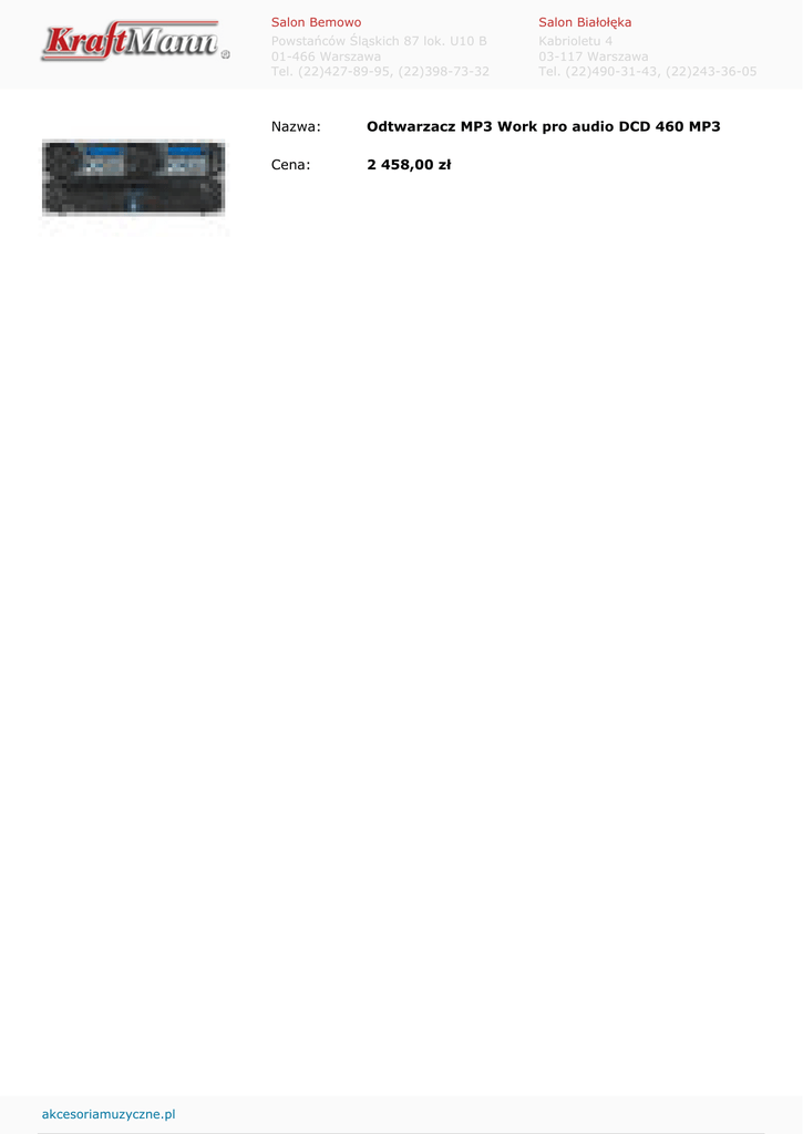 akcesoriamuzyczne.pl Salon Bemowo Salon Białołęka Powstańców Śląskich 87 lok. U10 B 01-466 Warszawa Tel. (22)427-89-95, (22)398-73-32 Kabrioletu 4 03-117 Warszawa Tel. (22)490-31-43, (22)243-36-05 Nazwa: Odtwarzacz MP3 Work pro audio DCD 460 MP3 Cena: 2 458,00 zł