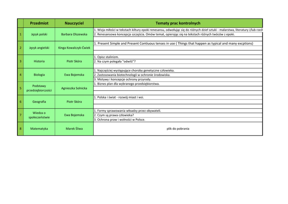 Przedmiot Nauczyciel 1 Język polski Barbara Olszewska 2 Język angielski Kinga Kowalczyk-Ćwiek 3 Historia Piotr Skóra 4 Biologia Ewa Bojemska 5 Podstawy przedsiębiorczości Agnieszka Solnicka Tematy prac kontrolnych 1. Wizja miłości w tekstach kiltury epoki renesansu, odwołując się do róźnych dzieł sztuki - malarstwa, literatury i/lub rzeźby. 2. Renesansowa koncepcja szczęścia. Omów temat, opierając się na tekstach róźnych twóców z epoki. 1. Present Simple and Present Contiuous tenses in use ( Things that happen as typical and many excptions) 1. Opisz stalinizm. 2. Na czym polegała "odwilż"? 1. Najczęściej występujące choroby genetyczne człowieka. 2. Zastosowania biotechnologii w ochronie środowiska. 3. Motywy i koncepcje ochrony przyrody. 1. Biznes plan dla wybranego przedsiębiorstwa. 1. Polska i świat - rozwój miast i wsi. 6 Geografia Piotr Skóra 7 Wiedza o społeczeństwie Ewa Bojemska 8 Matematyka Marek Śliwa 1. Formy sprawowania włoadzy przez obywateli. 2. Czym są prawa człowieka? 3. Ochrona praw i wolności w Polsce. plik do pobrania