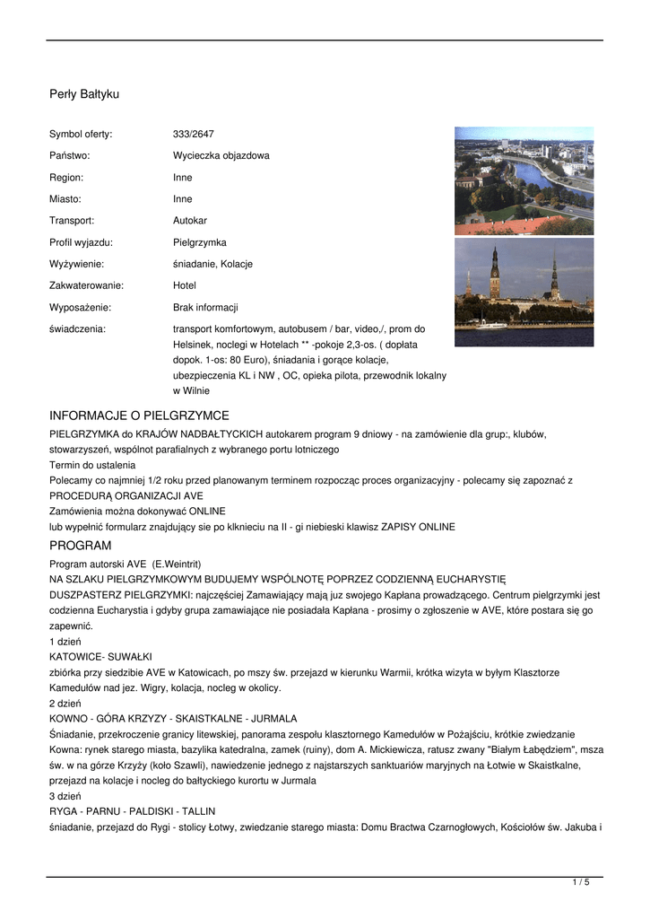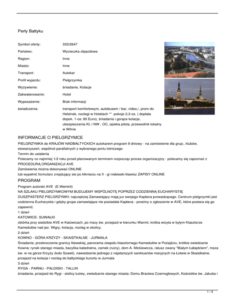 PIELGRZYMKA do KRAJÓW NADBAŁTYCKICH autokarem program 9 dniowy - na zamówienie dla grup:, klubów,