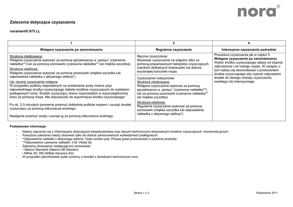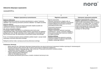 Zalecenia dotyczące czyszczenia norament® 975 LL 1 2 4 Wstępne czyszczenie po zamontowaniu Regularne czyszczenie Intensywne czyszczenie pośrednie Ręczne czyszczenie: Stosować czyszczenie na wilgotno albo za pomocą preparowanych tekstyliów czyszczących (cienkich delikatnych ściereczek) lub dobrze wyciśniętej końcówki mopa. Procedura czyszczenia jak w części 1. Wstępne czyszczenie po zamontowaniu. Wybór środka czyszczącego zależy od stopnia zabrudzenia i od rodzaju osadu. W związku z tym należy się skonsultować z producentem środka czyszczącego aby wybrać odpowiedni środek do danego rodzaju czyszczenia, zwykłego lub intensywnego. Struktura młotkowana: Wstępne czyszczenia wykonać za pomocą spryskiwacza w „sprayu” (czerwona nakładka**) lub za pomocą szorowarki (czerwona nakładka** lub miękka szczotka). Struktura reliefowa: Wstępne czyszczenia wykonać za pomocą szorowarki (miękka szczotka lub odpowiednia nakładka z aktywnego włókna*) lub: ręczne czyszczenie wstępne W przypadku podłoży niepodatnych na wchłanianie wody można użyć odpowiedniego środka czyszczącego (tabela środków czyszczących do wykładzin podłogowych nora). Środek czyszczący równo rozprowadzić w wyszczególnionej ilości za pomocą mopa. Nie dopuszczać do wyschnięcia środka czyczczącego! Po ok. 2-3 minutach ponownie przemyć dokładnie podłoże mopem i usunąć środek czyszczący za pomocą odkurzacza wodnego. Następnie przemyć wodą i usunąć ją za pomocą odkurzacza wodnego. Czyszczenie maszynowe: Struktura młotkowana: Wstępne czyszczenia wykonać za pomocą spryskiwacza w „sprayu” (czerwona nakładka**) lub za pomocą szorowarki (czerwona nakładka** lub miękka szczotka). Struktura reliefowa: Regularne czyszczenia wykonać za pomocą szorowarki (miękka szczotka lub odpowiednia nakładka z aktywnego włókna*) Podstawowe informacje: - - Należy zapoznać się z informacjami dotyczącymi bezpieczeństwa oraz danymi technicznymi stosowanych środków czyszczących i konserwacyjnych. Powyższe zalecenia należy stosować tylko do dobrze zamocowanych wykładzinach podłogowych. *Odpowiednie nakładki z aktywnego włókna: Taski contact pad. Proszę pytać producentów o podobne produkty. **Odpowiednie czerwone nakładki: 3 M, Vileda itd. Zalecamy stosowanie następujących szorowarek: • Qleeno Standard (Qleeno AB Sweden) • Nilfisk SC 350 (Nilfisk-Advance AG) W przypadku jakichkolwiek pytań prosimy o kontakt z doradcami technicznymi nora. Strona 1 z 2 Październik 2011 Zalecenia dotyczące czyszczenia Norament® 975 LL Środki czyszczące i konserwacyjne Środki czyszczące i konserwacyjne podane w tabeli poniżej są zalecane przez producentów środków czyszczących na rynku niemieckim. W zależności od rodzaju projektu, może być właściwe zastosowanie produktów i metod odbiegających od standardowych. W takich przypadkach należy zapoznać się z zaleceniami producentów środków czyszczących. Produkty czyszczące i konserwacyjne należy stosować ściśle według zaleceń ich producentów. Inne środki czyszczące nie wymienione w poniższej tabeli mogą warunkowo być również stosowane, zgodnie z ich zaleceniami. Dostawca Wstępne czyszczenie Ręczne regularne czyszczenie za pomocą mopa (dwufazowe) Diversey GmbH D-68219 Mannheim Tel. +49 (0)621 / 8757 – 0 Dr. Schnell Chemie GmbH D-80807 München Tel. +49 (0)89 / 350 608 – 0 Ecolab Deutschland GmbH D-40589 Düsseldorf Tel. +49 (0)211 / 9893 – 0 Johannes Kiehl KG D-85235 Odelzhausen Tel. +49 (0)8134 / 9305 – 0 Taski forward ok. 5 % Taski tensol na przemian z Taski 300 Rozcieńczać zgodnie z zaleceniami producenta. FLOOR TOP na przemian z unic magic Rozcieńczać zgodnie z zaleceniami producenta. Tana-Chemie GmbH D-55120 Mainz Tel. +49 (0)6131 / 964 -03 GR 10 ok. 5 % SCHIROCCO CLEAN ok. 5 % Magic maxx ok. 5 % Torvan ok. 5 % Strona 2 z 2 Indur maxx na przemian z Magic maxx Rozcieńczać zgodnie z zaleceniami producenta. PROCUR Concentrate na przemian z Veriprop Rozcieńczać zgodnie z zaleceniami producenta. TAWIP na przemian z CLEAN extrem Rozcieńczać zgodnie z zaleceniami producenta. Październik 2011