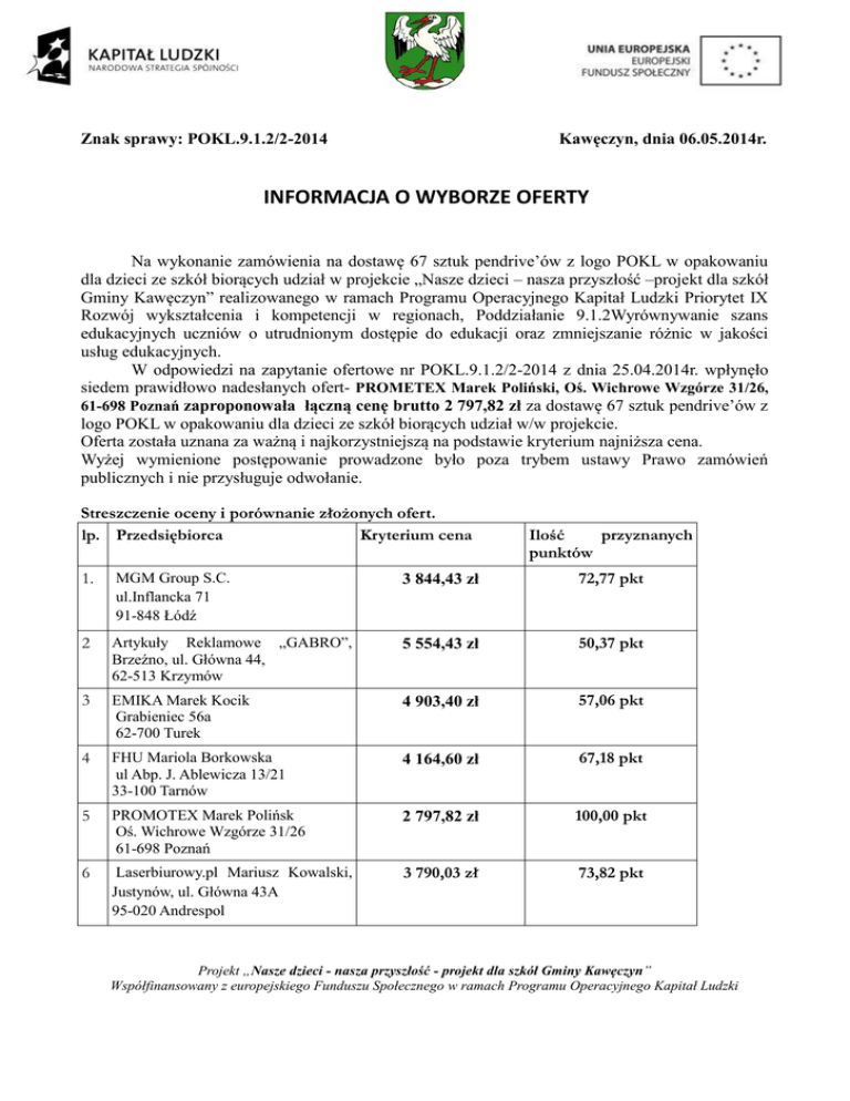Kawęczyn, dnia 06.05.2014r. Znak sprawy: POKL.9.1.2/2-2014 INFORMACJA O WYBORZE OFERTY Na wykonanie zamówienia na dostawę 67 sztuk pendrive’ów z logo POKL w opakowaniu dla dzieci ze szkół biorących udział w projekcie „Nasze dzieci – nasza przyszłość –projekt dla szkół Gminy Kawęczyn” realizowanego w ramach Programu Operacyjnego Kapitał Ludzki Priorytet IX Rozwój wykształcenia i kompetencji w regionach, Poddziałanie 9.1.2Wyrównywanie szans edukacyjnych uczniów o utrudnionym dostępie do edukacji oraz zmniejszanie różnic w jakości usług edukacyjnych. W odpowiedzi na zapytanie ofertowe nr POKL.9.1.2/2-2014 z dnia 25.04.2014r. wpłynęło siedem prawidłowo nadesłanych ofert- PROMETEX Marek Poliński, Oś. Wichrowe Wzgórze 31/26, 61-698 Poznań zaproponowała łączną cenę brutto 2 797,82 zł za dostawę 67 sztuk pendrive’ów z logo POKL w opakowaniu dla dzieci ze szkół biorących udział w/w projekcie. Oferta została uznana za ważną i najkorzystniejszą na podstawie kryterium najniższa cena. Wyżej wymienione postępowanie prowadzone było poza trybem ustawy Prawo zamówień publicznych i nie przysługuje odwołanie. Streszczenie oceny i porównanie złożonych ofert. lp. Przedsiębiorca Kryterium cena Ilość przyznanych punktów 1. MGM Group S.C. ul.Inflancka 71 91-848 Łódź 3 844,43 zł 72,77 pkt 2 Artykuły Reklamowe „GABRO”, Brzeźno, ul. Główna 44, 62-513 Krzymów 5 554,43 zł 50,37 pkt 3 EMIKA Marek Kocik Grabieniec 56a 62-700 Turek 4 903,40 zł 57,06 pkt 4 FHU Mariola Borkowska ul Abp. J. Ablewicza 13/21 33-100 Tarnów 4 164,60 zł 67,18 pkt 5 PROMOTEX Marek Polińsk Oś. Wichrowe Wzgórze 31/26 61-698 Poznań 2 797,82 zł 100,00 pkt 6 Laserbiurowy.pl Mariusz Kowalski, Justynów, ul. Główna 43A 95-020 Andrespol 3 790,03 zł 73,82 pkt Projekt „Nasze dzieci - nasza przyszłość - projekt dla szkół Gminy Kawęczyn” Współfinansowany z europejskiego Funduszu Społecznego w ramach Programu Operacyjnego Kapitał Ludzki 7 ARIANPOL Sp. Łopuszańska 38 02-232 Warszawa z o.o, ul. 3 292,28 zł 84,98 pkt /-/ Jolanta Agata Bryzgalska Kierownik Projektu Projekt „Nasze dzieci - nasza przyszłość - projekt dla szkół Gminy Kawęczyn” Współfinansowany z europejskiego Funduszu Społecznego w ramach Programu Operacyjnego Kapitał Ludzki