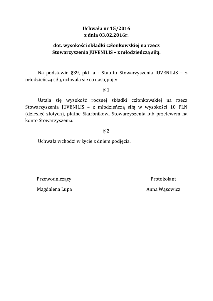 Uchwała nr 15/2016 z dnia 03.02.2016r. dot. wysokości składki członkowskiej na rzecz Stowarzyszenia JUVENILIS – z młodzieńczą siłą. Na podstawie §39, pkt. a - Statutu Stowarzyszenia JUVENILIS – z młodzieńczą siłą, uchwala się co następuje: §1 Ustala się wysokość rocznej składki członkowskiej na rzecz Stowarzyszenia JUVENILIS – z młodzieńczą siłą w wysokości 10 PLN (dziesięć złotych), płatne Skarbnikowi Stowarzyszenia lub przelewem na konto Stowarzyszenia. §2 Uchwała wchodzi w życie z dniem podjęcia. Przewodniczący Protokolant Magdalena Lupa Anna Wąsowicz