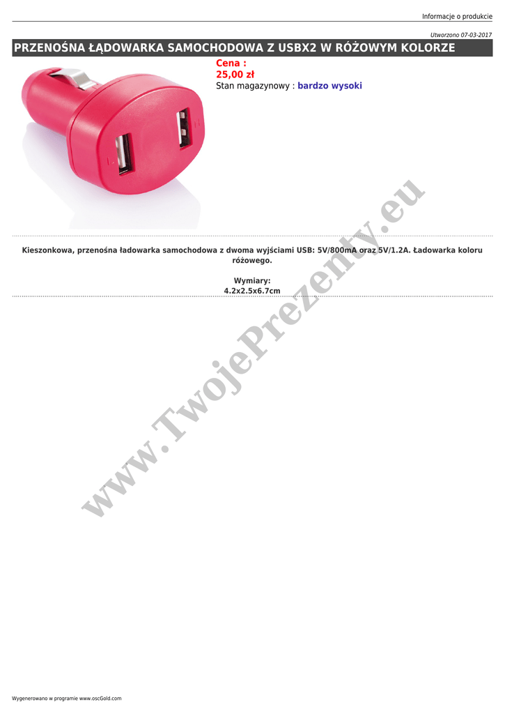 Informacje o produkcie Utworzono 07-03-2017 PRZENOŚNA ŁĄDOWARKA SAMOCHODOWA Z USBX2 W RÓŻOWYM KOLORZE Cena : 25,00 zł y. e u Stan magazynowy : bardzo wysoki eP re ze nt Kieszonkowa, przenośna ładowarka samochodowa z dwoma wyjściami USB: 5V/800mA oraz 5V/1.2A. Ładowarka koloru różowego. w w w .T w oj Wymiary: 4.2x2.5x6.7cm Wygenerowano w programie www.oscGold.com