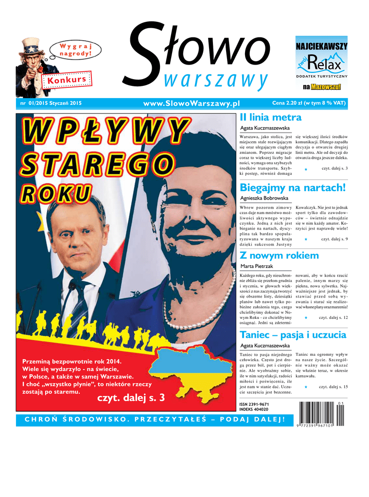 Słowo numeru str 1 NAJCIEKAWSZY Konkurs nr 01/2015 Styczeń 2015 D o dat e k T u ry s t yc z n y na Mazowszu! www.SlowoWarszawy.pl Cena 2.20 zł (w tym 8 % VAT) II linia metra Agata Kuczmaszewska Warszawa, jako stolica, jest miejscem stale rozwijającym się oraz ulegającym ciągłym zmianom. Poprzez migracje coraz to większej liczby ludności, wymaga ona szybszych środków transportu. Szybki postęp, również domaga się większej ilości środków komunikacji. Dlatego zapadła decyzja o otwarciu drugiej linii metra. Ale od decyzji do otwarcia droga jeszcze daleka. czyt. dalej s. 3 Biegajmy na nartach! Agnieszka Bobrowska Wbrew pozorom zimowy czas daje nam mnóstwo możliwości aktywnego wypoczynku. Jedną z nich jest bieganie na nartach, dyscyplina tak bardzo spopularyzowana w naszym kraju dzięki sukcesom Justyny Kowalczyk. Nie jest to jednak sport tylko dla zawodowców – świetnie odnajdzie się w nim każdy amator. Korzyści jest naprawdę wiele! czyt. dalej s. 9 Z nowym rokiem Marta Pietrzak Każdego roku, gdy nieuchronnie zbliża się przełom grudnia i stycznia, w głowach większości z nas zaczynają tworzyć się obszerne listy, dziesiątki planów lub nawet tylko pobieżne założenia tego, czego chcielibyśmy dokonać w Nowym Roku - co chcielibyśmy osiągnąć. Jedni są zdetermi- nowani, aby w końcu rzucić palenie, innym marzy się piękna, nowa sylwetka. Najważniejsze jest jednak, by stawiać przed sobą wyzwania i starać się realizować własne plany oraz marzenia! czyt. dalej s. 12 Taniec – pasja i uczucia Agata Kuczmaszewska Przeminą bezpowrotnie rok 2014. Wiele się wydarzyło - na świecie, w Polsce, a także w samej Warszawie. I choć „wszystko płynie”, to niektóre rzeczy zostają po staremu. czyt. dalej s. 3 Taniec to pasja niejednego człowieka. Często jest drogą przez ból, pot i cierpienie. Ale wyobraźmy sobie, ile w nim satysfakcji, radości miłości i poświęcenia, ile jest nam w stanie dać. Uczucie szczęścia jest bezcenne. czyt. dalej s. 15 ISSN 2391-9671 INDEKS 404020 C H R O Ń Ś R O D OW I S KO. P R Z E C Z Y TA Ł E Ś – P O DA J DA L E J ! Słowo Krakowa Gazeta lokalna Taniec ma ogromny wpływ na nasze życie. Szczególnie ważny może okazać się właśnie teraz, w okresie karnawału. czwartek, 24 marca 2011 Wstępniak Spis treści Temat numeru Tomasz Drozd – Majdan, Tusk i HGW - s. 2 Co się działo W Warszawie – s. 4 W Polsce – s. 5 W Gospodarce – s.5 str 2 Styczeń Majdan, Tusk i HGW Tomasz Drozd Rok 2014 już za nami. Tak on, jak i każdy jego poprzednik, miał swoje wzloty i upadki – plusy oraz minusy. Działo się sporo, zarówno na świecie, jak i w kraju, a także – rzecz jasna – w naszym pięknym mieście. Koniec roku to tradycyjny czas podsumowań, więc i ja postanowiłem pokrótce dokonać swojego. Miasto Agata Kuczmaszewska – II linia metra – s. 3 Budżet Agata Kuczmaszewska – Kasy fiskalne w 2015 – s. 6 Każde podsumowanie tego typu niesie z sobą oczywiście silne piętno subiektywizmu i nie inaczej jest w tym przypadku. Postanowiłem przedstawić jednak Państwu po jednym wybranym wydarzeniu, które moim skromnym zdaniem było najważniejszym z tych, które miały miejsce w roku 2014 – w Polsce, jej stolicy oraz na płaszczyźnie globalnej. Możecie się Państwo zgodzić lub nie – tak czy inaczej: oto one. Ukraina na Majdanie Już przełom roku 2013 i 2014 Twój Relax Agata Kuczmaszewska – Miejsce, gdzie marzenia stają się realne – s. 8 Tomasz Bieńkowski – Zimą bajkowo na Podhalu – s. 8 Agnieszka Bobrowska – Biegajmy na nartach – s. 9 Marta Pietrzak – Perła renesansu – s. 10 Marta Pietrzak – Szklarska Poręba zimowego czasu – s. 10 Słowo dla seniora Ida Gajewska – Aktywna zima dla seniorów – s. 11 Styl Życia Marta Pietrzak – Z nowym rokiem – nowym krokiem – s. 12 Agata Kuczmaszewska – Weselne szczęście – s. 13 Agnieszka Bobrowska – Atak ślubnych trendów – s. 13 Nowy początek trum i na zachodzie. Inaczej jednak stało się na wschodzie naddnieprzańskiego państwa, najczęściej rosyjskojęzycznym, gdzie poparcie dla Partii Regionów było zdecydowanie najsilniejsze, podobnie jak tradycyjne nastawienie prorosyjskie. Z polskiej perspektywy patrzy się na wydarzenia na Ukrainie w sposób dwojaki i w każdej z tych wizji jest nieco racji. Część opinii publicznej, która pozytywnie ustosunkowuje się do przemian na wschodzie, wskazuje właśnie na antyrosyjski (a REKLAMA Będzie się działo Styczeń - s. 14 - 15 przyniósł gorące dni na kijowskim Majdanie, choć jak wszyscy wiemy, był to jedynie przedsmak tego, co przyniosły kolejne miesiące. Ranni i zabici. Ulice ukraińskiej stolicy we krwi. Berkut strzelający do manifestantów. Barykady, płonące opony, dym i głośne okrzyki. Oczy całego świata zwróciły się ku naszemu wschodniemu sąsiadowi. Rewolucja obaliła rząd Janukowycza – eskalacja nastąpiła w lutym. Poszczególne „majdany” pojawiły się na terenie wielu ukraińskich miast, przede wszystkim w cen- Mikołaj Kamiński Numer „Słowa Warszawy”, który trzymają państwo w rękach jest kontynuacją projektu „Słowa Wrocławian”, gdzie już od pięciu lat wychodzi ambitna i niezależna gazeta o zasięgu lokalnym, a także naszych kolejnych przedsięwzięć ukazujących się od roku poprzedniego, jakimi są „Słowo Krakowa” oraz „Słowo Poznania”, a od tego roku także „Słowo Trójmiasta”. We wszystkich tych miejscach staramy się docierać z interesującym przekazem do wszystkich tych, którzy w dostępnej prasie i mediach nie znajdują dość satysfakcjonujących treści, a jednocześnie stworzyć nową jakościowo platformę reklamową dla odbiorców komercyjnych. Szesnaście stron na początek stanowi przystępną dawkę informacji o mieście i jego mieszkańcach. Z czasem miesięcznik będzie się rozrastał o kolejne działy i dodatki. Póki co taka jeszcze formuła esencjonaln