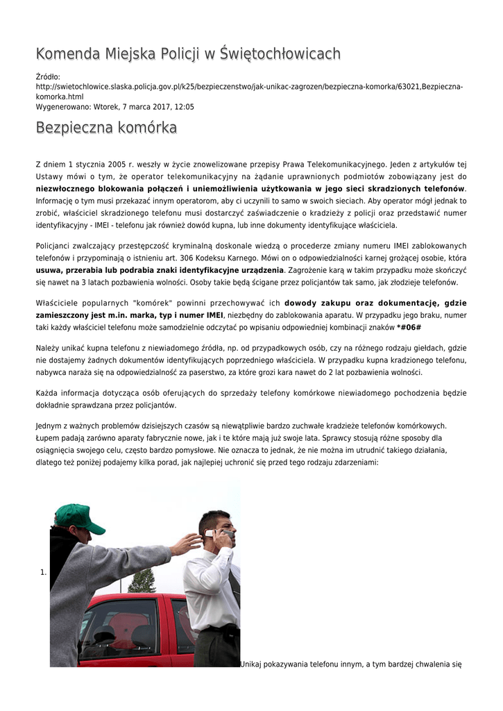 Komenda Miejska Policji w Świętochłowicach Źródło: http://swietochlowice.slaska.policja.gov.pl/k25/bezpieczenstwo/jak-unikac-zagrozen/bezpieczna-komorka/63021,Bezpiecznakomorka.html Wygenerowano: Wtorek, 7 marca 2017, 12:05 Bezpieczna komórka Z dniem 1 stycznia 2005 r. weszły w życie znowelizowane przepisy Prawa Telekomunikacyjnego. Jeden z artykułów tej Ustawy mówi o tym, że operator telekomunikacyjny na żądanie uprawnionych podmiotów zobowiązany jest do niezwłocznego blokowania połączeń i uniemożliwienia użytkowania w jego sieci skradzionych telefonów. Informację o tym musi przekazać innym operatorom, aby ci uczynili to samo w swoich sieciach. Aby operator mógł jednak to zrobić, właściciel skradzionego telefonu musi dostarczyć zaświadczenie o kradzieży z policji oraz przedstawić numer identyfikacyjny - IMEI - telefonu jak również dowód kupna, lub inne dokumenty identyfikujące właściciela. Policjanci zwalczający przestępczość kryminalną doskonale wiedzą o procederze zmiany numeru IMEI zablokowanych telefonów i przypominają o istnieniu art. 306 Kodeksu Karnego. Mówi on o odpowiedzialności karnej grożącej osobie, która usuwa, przerabia lub podrabia znaki identyfikacyjne urządzenia. Zagrożenie karą w takim przypadku może skończyć się nawet na 3 latach pozbawienia wolności. Osoby takie będą ścigane przez policjantów tak samo, jak złodzieje telefonów. Właściciele popularnych "komórek" powinni przechowywać ich dowody zakupu oraz dokumentację, gdzie zamieszczony jest m.in. marka, typ i numer IMEI, niezbędny do zablokowania aparatu. W przypadku jego braku, numer taki każdy właściciel telefonu może samodzielnie odczytać po wpisaniu odpowiedniej kombinacji znaków *#06# Należy unikać kupna telefonu z niewiadomego źródła, np. od przypadkowych osób, czy na różnego rodzaju giełdach, gdzie nie dostajemy żadnych dokumentów identyfikujących poprzedniego właściciela. W przypadku kupna kradzionego telefonu, nabywca naraża się na odpowiedzialność za paserstwo, za które grozi kara nawet do 2 lat pozbawienia wolności. Każda informacja dotycząca osób oferujących do sprzedaży telefony komórkowe niewiadomego pochodzenia będzie dokładnie sprawdzana przez policjantów. Jednym z ważnych problemów dzisiejszych czasów są niewątpliwie bardzo zuchwałe kradzieże telefonów komórkowych. Łupem padają zarówno aparaty fabrycznie nowe, jak i te które mają już swoje lata. Sprawcy stosują różne sposoby dla osiągnięcia swojego celu, często bardzo pomysłowe. Nie oznacza to jednak, że nie można im utrudnić takiego działania, dlatego też poniżej podajemy kilka porad, jak najlepiej uchronić się przed tego rodzaju zdarzeniami: 1. Unikaj pokazywania telefonu innym, a tym bardzej chwalenia się nim, szczegolnie gdy jest nowy i ma wiele atrakcyjnych funkcji. Nie baw się też jego opcjami na ulicy czy w autobusie, tramwaju, pociągu - odwraca to Twoją uwagę od otoczenia i usypia czujność. 2. Staraj się nosić telefon w miejscu trudnodostępnym lub małowidocznym dla osób trzecich, ale przy sobie np. w kieszeni koszuli, wewnętrznej kieszeni kurtki czy marynarki, w przedniej kieszeni spodni. Możesz nosić go na szyi pod swetrem. Natomiast nie wkładaj telefonu do tylnej kieszeni spodni, torebki czy plecaka. To zachęca złodziei do jego kradzieży. 3. Jeśli musisz skorzystać z telefonu na ulicy, to staraj się to robić w miejscu, gdzie jest dużo ludzi - spowoduje to, że złodziej będzie się czuł mniej pewnie. Pamietaj chowając go po rozmowie wskazujesz potencjalnemu złodziejowi, gdzie on jest. 4. Jeśli udajesz się w miejsce, gdzie telefonu nie będziesz mógł mieć ciągle przy sobie, jak np. basen, siłownia, fitness klub, szpital, zabiegi rehablitacyjne, specjalistyczne badania lekarsie, itp. ustal wcześniej czy będzie tam możliwość skorzystania ze schowka lub jest inne zabezpieczenie szatni. Jeśli nie, to rozważ czy telefon będzie Ci niezbędny. 5. Nie pozostawiaj telefonu bez nadzoru: w samochodzie w miejscu widocznym (sam przyciągasz włamywacza do swojego auta), na stoliku w pubie, biurku lub torebce w pracy czy w kurtce w szatni. Jeśli masz takie zwyczaje rozważ zastosowanie opcji odblokowywania klawiatury kodem. 6. Zastanów się czy telefon komórkowy jest istotnym wyposażeniam ucznia idącego do szkoły !!! 7. Noś przy sobie, spisany na kartce, numer identyfikacyjny twojego telefonu tzw. IMEI. 8. Jeśli masz taką możliwość oznakuj swój telefon, umożliwi to jego szybsze odzyskanie. 9. Po stwierdzeniu kradzieży, natychmiast powiadom o niej operatora. Zablokuje on twoje konto. 10. Pamiętaj! Kupując telefon komórkowy pochodzący z przestępstwa sam popełniasz przestępstwo. Dlatego też, staraj się zrobić wszystko, aby potwierdzić legalność posiadania telefonu przez sprzedającego - nich dostarczy oryginalne pudełko i akcesoria oraz dokumenty i rachunek zakupu. Na pudełku powinna być naklejka z numerem IMEI telefonu, który jest Ci sprzedawany - porównaj go z numerem wyświetlonym przez aparat po wprowadzeniu kodu *#06#, taki sam powinien być na naklejce od środka. Poproś też o wystawienie Ci rachunku potwierdzającego sprzedaż. 11. Bądź szczególnie ostrożny przy zakupach na targowisku czy przez internet, a także przy ofertach bardzo korzystnych i przy telefonach, które mają uszkodzoną lub zdartą naklejkę z numerem IMEI. 12. Posiadając telefon pochodzący z kradzieży musisz się liczyć też z tym, że zostanie Ci on przez Policję zabrany! Jeśli chciałbyś uzyskać więcej porad, lub jeśli masz uwagi do tego materiału zadzwoń na infolinię 0 - 800 - 222 - 315, czynna jest ona od poniedziałku do piątku w godzinach 8:00 do 20:00. Ocena: 0/5 (0) Tweetnij