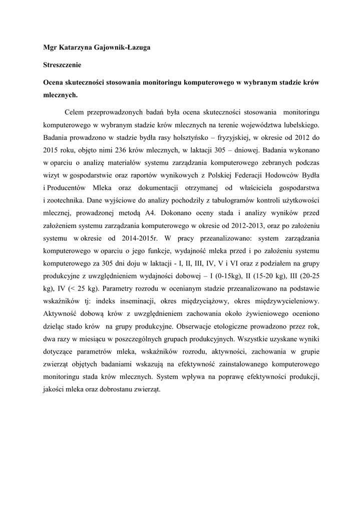 Mgr Katarzyna Gajownik-Łazuga Streszczenie Ocena skuteczności stosowania monitoringu komputerowego w wybranym stadzie krów mlecznych. Celem przeprowadzonych badań była ocena skuteczności stosowania monitoringu komputerowego w wybranym stadzie krów mlecznych na terenie województwa lubelskiego. Badania prowadzono w stadzie bydła rasy holsztyńsko – fryzyjskiej, w okresie od 2012 do 2015 roku, objęto nimi 236 krów mlecznych, w laktacji 305 – dniowej. Badania wykonano w oparciu o analizę materiałów systemu zarządzania komputerowego zebranych podczas wizyt w gospodarstwie oraz raportów wynikowych z Polskiej Federacji Hodowców Bydła i Producentów Mleka oraz dokumentacji otrzymanej od właściciela gospodarstwa i zootechnika. Dane wyjściowe do analizy pochodziły z tabulogramów kontroli użytkowości mlecznej, prowadzonej metodą A4. Dokonano oceny stada i analizy wyników przed założeniem systemu zarządzania komputerowego w okresie od 2012-2013, oraz po założeniu systemu w okresie od 2014-2015r. W pracy przeanalizowano: system zarządzania komputerowego w oparciu o jego funkcje, wydajność mleka przed i po założeniu systemu komputerowego za 305 dni doju w laktacji - I, II, III, IV, V i VI oraz z podziałem na grupy produkcyjne z uwzględnieniem wydajności dobowej – I (0-15kg), II (15-20 kg), III (20-25 kg), IV (< 25 kg). Parametry rozrodu w ocenianym stadzie przeanalizowano na podstawie wskaźników tj: indeks inseminacji, okres międzyciążowy, okres międzywycieleniowy. Aktywność dobową krów z uwzględnieniem zachowania około żywieniowego oceniono dzieląc stado krów na grupy produkcyjne. Obserwacje etologiczne prowadzono przez rok, dwa razy w miesiącu w poszczególnych grupach produkcyjnych. Wszystkie uzyskane wyniki dotyczące parametrów mleka, wskaźników rozrodu, aktywności, zachowania w grupie zwierząt objętych badaniami wskazują na efektywność zainstalowanego komputerowego monitoringu stada krów mlecznych. System wpływa na poprawę efektywności produkcji, jakości mleka oraz dobrostanu zwierząt. Summary Assess the efficacy of computer monitoring in selected herd of dairy cows. The aim of the study was to assess the efficacy of computer monitoring in selected herd of dairy cows in the Lublin province. The study was conducted in a herd of cattle Holstein - Friesian, in the period from 2012 until 2015, it included 236 dairy cows in lactation 305 - day. The study was performed based on the analysis of materials management system computer collected during visits to the farm and reports resulting from the Polish Federation of Cattle Breeders and Dairy Farmers and documentation received from the owner of the farm and zootechny. Output data for the analysis came from the program listings out milk utility, run by A4. The stock assessment and analysis of the results was made before the foundation of the computer management system in the period from 2012-2013, and after the founding of the system in the period from 2014-2015r. The study examined: system management computer based on its functions, milk yield actual before and after the founding of the computer system for 305 days of milking and lactation full of I, II, III, IV and more, and divided into groups of production: I, II, III , IV. Reproductive parameters evaluated in the herd were analyzed on the basis of such indicators: the index of insemination period between pregnancy period between calving. Activity of daily cows taking into account the behavior of some nutritional rated by dividing a herd of cows on the production groups. Ethological observations were carried out for a year, two times a month in various production teams. All obtained indicators of milk parameters, indicators of reproductive activity, group behavior of animals covered by the study indicate the effectiveness of the installed computer monitoring of the dairy herd. The system improves the efficiency of production and milk quality and animal welfare.