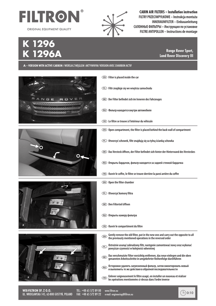CABIN AIR FILTERS – Installation instruction FILTRY PRZECIWPYŁKOWE – Instrukcja montażu INNERAUMFILTER – Einbauanleitung САЛОННЫЕ ФИЛЬТРЫ – Инструкция по установке FILTRE ANTIPOLLEN – Instructions de montage K 1296 K 1296A Range Rover Sport, Land Rover Discovery III A – VERSION WITH ACTIVE CARBON / WERSJA Z WĘGLEM AKTYWNYM/ VERSION AVEC CHARBON ACTIF Filter is placed inside the car Filtr znajduje się we wnętrzu samochodu Der Filter befindet sich im Inneren des Fahrzeuges Фильтр находится внутри автомобиля Le filtre se trouve à l’intérieur du véhicule Open compartment, the filter is placed behind the back wall of compartment Otworzyć schowek, filtr znajdują się za tylną ścianką schowka Das Versteck öffnen, der Filter befindet sich hinter der Hinterwand des Versteckes Открыть бардачок, фильтр находится за задней стенкой бардачка Ouvrir le coffre, le filtre se trouve derrière la paroi arrière du coffre Open the filter chamber Otworzyć komorę filtra Den Filterteil öffnen Открыть камеру фильтра Ouvrir le compartiment du filtre Gently remove the old filter, put in the new one and carry out the opposite to all the previously mentioned operations in the reversed order Ostrożnie usunąć zabrudzony filtr, następnie zamontować nowy oraz wykonać powyższe czynności w kolejności odwrotnej Das verschmutzte Filter vorsichtig entfernen, das neue einlegen und die oben genannten Arbeitsschritte in umgekehrter Reihenfolge durchführen Осторожно удалить загрязненный фильтр, затем вмонтировать новый и выполнить те же действия в обратной последовательности Enlever soigneusement le filtre usagé, en installer un nouveau et réaliser les opérations mentionnées ci-dessus dans l’ordre inverse WIX-FILTRON SP. Z O.O. TEL.:+48 65 572 89 00 www.filtron.eu UL. WROCŁAWSKA 145, 63-800 GOSTYŃ, POLAND FAX: +48 65 572 89 22 e-mail: [email protected] 0:10