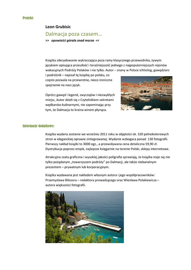 Projekt: Leon Grubisic Dalmacja poza czasem… >> opowieści górala znad morza << Książka zdecydowanie wykraczająca poza ramy klasycznego przewodnika, żywym językiem opisująca przeszłość i teraźniejszość jednego z najpopularniejszych rejonów wakacyjnych Podróży Polaków i nie tylko. Autor – znany w Polsce ichtiolog, gawędziarz i podróżnik – napisał tę książkę po polsku, co często pozwala na przewrotne, nieco ironiczne spojrzenie na nasz język. Oprócz gawęd i legend, zwyczajów i niezwykłych miejsc, Autor dzieli się z Czytelnikiem sekretami wędkarsko-kulinarnymi, nie zapominając przy tym, że Dalmacja to kraina winem płynąca. Informacje dodatkowe: Książka wydana zostanie we wrześniu 2011 roku w objętości ok. 320 pełnokolorowych stron w eleganckiej oprawie zintegrowanej. Wydanie wzbogaca ponad 130 fotografii. Pierwszy nakład książki to 3000 egz., a przewidywana cena detaliczna 59,90 zł. Dystrybucja poprzez empik, najlepsze księgarnie na terenie Polski, sklepy internetowe. Atrakcyjna szata graficzna i wysokiej jakości poligrafia sprawiają, że książka staje się nie tylko pożądanym „towarzyszem podróży” po Dalmacji, ale także niebanalnym prezentem – prywatnym lub korporacyjnym. Książka wydawana jest nakładem własnym autora i jego współpracowników: Przemysława Biłozora – redaktora prowadzącego oraz Wiesława Polakiewicza – autora większości fotografii. Recenzja: Projekt zyskał przychylność Roberta Makłowicza. Poniżej kilka ciepłych słów Jego autorstwa: Dalmacji nie trzeba znać dobrze, by się w niej zakochać. Wystarczy pierwszy impuls: widok na jadrański lazur spod zboczy Velebitu, tuzin ostryg w Małym Stonie, dźwięk cykad i powietrze przesycone zapachem rozmarynu, lawendy i pinii, rozgrzanych miejscowym słońcem. Gdy jednak już dopadnie nas gorące uczucie, chcemy jak najlepiej poznać jego obiekt. Zatem wracamy nad dalmatyńskie wybrzeże, gdy tylko możemy i chłoniemy ten bajeczny kraj wszystkimi zmysłami, ucząc się go pilnie. W tej nauce niezwykle pomocna będzie książka, którą właśnie trzymają Państwo w rękach. Też zrodzona z miłości do ziemi figi, oliwki i lawendy, lecz miłości pierwotnej, gdyż jej autor, pan Leon Grubišić, właśnie z Dalmacji pochodzi. To nie jest zwykły przewodnik (choć doskonale się w tej roli sprawdza), lecz raczej rodzaj autorskiej, swobodnej gawędy, przybliżającej nam chorwackie wybrzeże od wyspy Pag do półwyspu Prevlaka, granicy z Czarnogórą. Gawędy prowadzonej z niezwykłym znawstwem i czułością, gawędy prowadzonej tak, jak zwykło się najbliższym opowiadać o cudach, których jeszcze nie znają, a chce się bardzo, by również ich udziałem się stały. Panu Leonowi szczególnie zależy na tym, by właśnie Polacy zachwycili się Dalmacją, gdyż z naszym krajem łączą go szczególne związki. To staranie widać doskonale, dzięki lekturze tej książki mogłem po raz kolejny zachwycać się Dalmacją. Robert Makłowicz