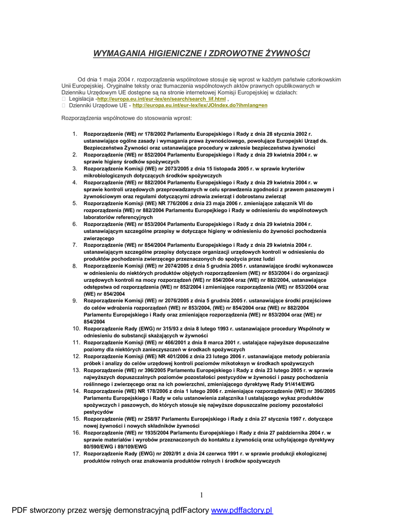 WYMAGANIA HIGIENICZNE I ZDROWOTNE ŻYWNOŚCI Od dnia 1 maja 2004 r. rozporządzenia wspólnotowe stosuje się wprost w każdym państwie członkowskim Unii Europejskiej. Oryginalne teksty oraz tłumaczenia wspólnotowych aktów prawnych opublikowanych w Dzienniku Urzędowym UE dostępne są na stronie internetowej Komisji Europejskiej w działach: Legislacja -http://europa.eu.int/eur-lex/en/search/search_lif.html , Dzienniki Urzędowe UE - http://europa.eu.int/eur-lex/lex/JOIndex.do?ihmlang=en Rozporządzenia wspólnotowe do stosowania wprost: 1. 2. 3. 4. 5. 6. 7. 8. 9. 10. 11. 12. 13. 14. 15. 16. 17. Rozporządzenie (WE) nr 178/2002 Parlamentu Europejskiego i Rady z dnia 28 stycznia 2002 r. ustanawiające ogólne zasady i wymagania prawa żywnościowego, powołujące Europejski Urząd ds. Bezpieczeństwa Żywności oraz ustanawiające procedury w zakresie bezpieczeństwa żywności Rozporządzenie (WE) nr 852/2004 Parlamentu Europejskiego i Rady z dnia 29 kwietnia 2004 r. w sprawie higieny środków spożywczych Rozporządzenie Komisji (WE) nr 2073/2005 z dnia 15 listopada 2005 r. w sprawie kryteriów mikrobiologicznych dotyczących środków spożywczych Rozporządzenie (WE) nr 882/2004 Parlamentu Europejskiego i Rady z dnia 29 kwietnia 2004 r. w sprawie kontroli urzędowych przeprowadzanych w celu sprawdzenia zgodności z prawem paszowym i żywnościowym oraz regułami dotyczącymi zdrowia zwierząt i dobrostanu zwierząt Rozporządzenie Komisji (WE) NR 776/2006 z dnia 23 maja 2006 r. zmieniające załącznik VII do rozporządzenia (WE) nr 882/2004 Parlamentu Europejkiego i Rady w odniesieniu do wspólnotowych laboratoriów referencyjnych Rozporządzenie (WE) nr 853/2004 Parlamentu Europejskiego i Rady z dnia 29 kwietnia 2004 r. ustanawiającym szczególne przepisy w dotyczące higieny w odniesieniu do żywności pochodzenia zwierzęcego Rozporządzenie (WE) nr 854/2004 Parlamentu Europejskiego i Rady z dnia 29 kwietnia 2004 r. ustanawiającym szczególne przepisy dotyczące organizacji urzędowych kontroli w odniesieniu do produktów pochodzenia zwierzęcego przeznaczonych do spożycia przez ludzi Rozporządzenie Komisji (WE) nr 2074/2005 z dnia 5 grudnia 2005 r. ustanawiające środki wykonawcze w odniesieniu do niektórych produktów objętych rozporządzeniem (WE) nr 853/2004 i do organizacji urzędowych kontroli na mocy rozporządzeń (WE) nr 854/2004 oraz (WE) nr 882/2004, ustanawiające odstępstwa od rozporządzenia (WE) nr 852/2004 i zmieniające rozporządzenia (WE) nr 853/2004 oraz (WE) nr 854/2004 Rozporządzenie Komisji (WE) nr 2076/2005 z dnia 5 grudnia 2005 r. ustanawiające środki przejściowe do celów wdrożenia rozporządzeń (WE) nr 853/2004, (WE) nr 854/2004 oraz (WE) nr 882/2004 Parlamentu Europejskiego i Rady oraz zmieniające rozporządzenia (WE) nr 853/2004 oraz (WE) nr 854/2004 Rozporządzenie Rady (EWG) nr 315/93 z dnia 8 lutego 1993 r. ustanawiające procedury Wspólnoty w odniesieniu do substancji skażających w żywności Rozporządzenie Komisji (WE) nr 466/2001 z dnia 8 marca 2001 r. ustalające najwyższe dopuszczalne poziomy dla niektórych zanieczyszczeń w środkach spożywczych Rozporządzenie Komisji (WE) NR 401/2006 z dnia 23 lutego 2006 r. ustanawiające metody pobierania próbek i analizy do celów urzędowej kontroli poziomów mikotoksyn w środkach spożywczych Rozporządzenie (WE) nr 396/2005 Parlamentu Europejskiego i Rady z dnia 23 lutego 2005 r. w sprawie najwyższych dopuszczalnych poziomów pozostałości pestycydów w żywności i paszy pochodzenia roślinnego i zwierzęcego oraz na ich powierzchni, zmieniającego dyrektywę Rady 91/414/EWG Rozporządzenie (WE) NR 178/2006 z dnia 1 lutego 2006 r. zmieniające rozporządzenie (WE) nr 396/2005 Parlamentu Europejskiego i Rady w celu ustanowienia załącznika I ustalającego wykaz produktów spożywczych i paszowych, do których stosuje się najwyższe dopuszczalne poziomy pozostałości pestycydów Rozporządzenie (WE) nr 258/97 Parlamentu Europejskiego i Rady z dnia 27 stycznia 1997 r. dotyczące nowej żywności i nowych składników żywności Rozporządzenie (WE) nr 1935/2004 Parlamentu Europejskiego i Rady z dnia 27 października 2004 r. w sprawie materiałów i wyrobów przeznaczonych do kontaktu z żywnością oraz uchylającego dyrektywy 80/590/EWG i 89/109/EWG Rozporządzenie Rady (EWG) nr 2092/91 z dnia 24 czerwca 1991 r. w sprawie produkcji ekologicznej produktów rolnych oraz znakowania produktów rolnych i środków spożywczych 1 PDF stworzony przez wersję demonstracyjną pdfFactory www.pdffactory.pl 18. Rozporządzenie Komisji (EWG) nr 94/92 z dnia 14 stycznia 1992 r. ustanawiające szczegółowe zasady 19. 20. 21. 22. 23. 24. 25. 26. 27. 28. 29. 30. wprowadzenia w życie uzgodnień dotyczących przywozu z państw trzecich przewidzianych w rozporządzeniu (EWG) nr 2092/91 w sprawie produkcji ekologicznej produktów rolnych oraz znakowania produktów rolnych i środków spożywczych Rozporządzenie Rady (EWG) nr 2081/92 z dnia 14 lipca 1992 r. w sprawie ochrony oznaczeń geograficznych i nazw pochodzenia produktów rolnych i środków spożywczych Rozporządzenie Rady (EWG) nr 2082/92 z dnia 14 lipca 1992 r. w sprawie świadectw o szczególnym charakterze dla produktów rolnych i środków spożywczych Rozporządzenie (WE) nr 2232/96 Parlamentu Europejskiego i Rady z dnia 28 października 1996 r. ustanawiające wspólnotową procedurę dla substancji aromatycznych używanych lub przeznaczonych do użycia w lub na środkach spożywczych Rozporządzenie Komisji (WE) nr 1565/2000 z dnia 18 lipca 2000 r. ustanawiające środki konieczne do przyjęcia programu oceny w zastosowaniu rozporządzenia (WE) nr 2232/96 Parlamentu Europejskiego i Rady Rozporządzenie (WE) nr 1946/2003 Parlamentu Europejskiego i Rady z dnia 15 lipca 2003 r. w sprawie transgranicznego przemieszczania organizmów genetycznie zmodyfikowanych Rozporządzenie (WE) nr 1829/2003 Parlamentu Europejskiego i Rady