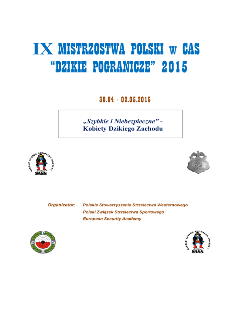 IX MISTRZOSTWA POLSKI w CAS “DZIKIE POGRANICZE” 2015 30.04 - 02.05.2015 „Szybkie i Niebezpieczne” Kobiety Dzikiego Zachodu Organizator: Polskie Stowarzyszenie Strzelectwa Westernowego Polski Związek Strzelectwa Sportowego European Security Academy Regulamin Cel zawodów: -popularyzacja strzelectwa westernowego -integracja środowiska strzeleckiego -rywalizacja sportowa -zdobywanie klas sportowych i odznak strzeleckich Miejsce: Strzelnica European Security Academy Pokrzywnica, gmina Śrem 51° 57 ´ 49” N 17° 06´ 21” E Zawody główne wg regulaminów SASS -12 torów (wszystkie kategorie wg SASS) Zawody dodatkowe w kategorii „Plainsman” (PC) - Daleki Dystans (100 m precyzyjne – tylko broń odprzodowa) Zawody dodatkowe (za osobną opłatą): -Dzika Banda (3 tory wg SASS) -Daleki Dystans (100 m) & Nocne Polowanie na Bizona -Derringer & Pojedynek & ”Michał Strogow Cup” -Szybki pistolet, karabin i strzelba (indywidualne i zespołowe) -Top Gun – ustanawianie rekordu Polski, regulamin wg SASS zatwierdzony przez PZSS Uczestnictwo: Wszyscy posiadający broń zgodnie z aktualnie obowiązującymi przepisami (z wyłączeniem broni na amunicję bocznego zapłonu) Nagrody: Przewidziane we wszystkich kategoriach za pierwsze trzy miejsca, w zawodach dodatkowych dyplomy dla wszystkich zawodników. UWAGA ! Do strzelań wg SASS dopuszczona jest broń i amunicja zgodna z regulaminami SASS. Wyklucza się amunicję rewolwerową o współczynniku mocy < 60, Magnum, WC oraz śrut stalowy. Dopuszczona jest broń czarnoprochowa zgodna z epoką (poza pistoletami jednostrzałowymi), zaś strzelby gładko lufowe, karabiny LA i rewolwery (zgodne z przepisami SASS) udostępnia organizator (za odpłatnością amunicji). Wolno używać pocisków i śrutu jedynie z czystego, niewzbogaconego ołowiu. Minimalna ilość potrzebnej amunicji - Zawody Główne Dzika Banda Rewolwer 130 Pistol et 60 Karabin 130 Karabin 30 Strzelba 70+ Strzelba 30+ Minimalna ilość potrzebnej amunicji w konkurencjach dodatkowych: § Rewolwer 50 + § Karabin 50+ § Strzelba 50+ Sprawy różne: Organizator zastrzega sobie prawo zmiany regulaminu do chwili rozpoczęcia zawodów i jego późniejszej interpretacji. Protesty w formie ustnej lub pisemnej mogą być składane na ręce Dyrektora Zawodów w czasie maks. 10 minut od zakończenia danego toru i zostaną rozpatrzone do chwili rozpoczęcia następnego w sposób ostateczny. Zawody umieszczone są w Kalendarzu Imprez Polskiego Związku Strzelectwa Sportowego i odbędą się w obecności Delegata Technicznego PZSS. Zgłoszenia przyjmowane są do 30.04.2015. Koszt zgłoszenia dla zawodników CAS 60.- euro (udział w zawodach głównych, parking, napoje) .Pozostali: 180,- zł