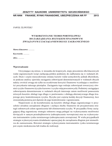 ZESZYTY NAUKOWE UNIWERSYTETU SZCZECIŃSKIEGO NR NNN FINANSE, RYNKI FINANSOWE, UBEZPIECZENIA NR FF 2013 Paweł Śliwiński Wykorzystanie teorii portfelowej do zarządzania ryzykiem finansowym związanym z zaciąganiem długu zagranicznego Słowa kluczowe: ............ Keywords: ............ JEL: ............ Wprowadzanie Utrzymujące się niższe, w stosunku do krajowych, stopy procentowe dla kluczowych walut zagranicznych wciąż zachęcają polskie podmioty do zadłużania się w walutach obcych. Duże i często nieoczekiwane zmiany kursów walut uzmysłowiły jednak dłużnikom, że podczas analizy zjawiska zaciągania zobowiązań denominowanych w walutach obcych należy zwrócić uwagę nie tylko na oczekiwane korzyści finansowe wynikające z możliwości pozyskania tańszego pieniądza. Zaciąganiu tego rodzaju zobowiązań towarzyszy również ryzyko finansowe (ryzyko kursowe i ryzyko stóp procentowych). Podmioty zaciągające zobowiązania denominowane w walutach obcych interesuje zatem możliwość ponoszenia niższych kosztów obsługi tego długu w porównaniu z obsługą alternatywnego długu krajowego przy kontrolowanym ryzyku. Ryzyko jest częścią każdej decyzji finansowej, lecz zrozumiałą postawą jest dążenie do jego kontrolowania i ograniczania. Niepewność co do kształtowania się kosztów obsługi długu zagranicznego w przyszłości utrudnia zarządzanie długiem i zachęca służby finansowe do przyjmowania strategii osłonowych celem ograniczenia lub eliminowania ryzyka. W przypadku firmy zaciągającej dług zagraniczny strategie osłonowe mogą polegać na wykorzystaniu możliwości tkwiących w samym przedsiębiorstwie (zabezpieczenie wewnętrzne) oraz na wykorzystaniu instrumentów rynku terminowego (zabezpieczanie zewnętrzne). W wielu przypadkach strategia wykorzystywania działalności operacyjnej do zarządzania długiem jest niemożliwa do zastosowania. Również strategia wykorzystania instrumentów rynku terminowego jest często nieskuteczna lub trudna do realizacji. Paweł Śliwiński Co zrobić zatem, jeżeli przedsiębiorstwo nie ma możliwości skorzystania z tych rodzajów zabezpieczeń lub nie chce z nich skorzystać, a wykazuje przy tym wyraźną awersję do podejmowania ryzyka? Kiedy dłużnik ma wiele możliwości zaciągnięcia zobowiązań zagranicznych, charakteryzujących się przy tym różnym stopniem ryzyka, to może zmniejszyć niepewność związaną z długiem zagranicznym poprzez równoczesne zadłużanie się w wielu walutach, czyli poprzez dywersyfikację swojego portfela długu. Konieczność dywersyfikacji portfela długu wynika z wielu przyczyn, często również z chęci uniknięcia niekorzystnego wpływu destabilizacji politycznej i ekonomicznej mogącej się ujawnić w krajach, których waluty stają się denominatorami długu. Celem niniejszego artykułu jest teoretyczna analiza możliwości dywersyfikacji portfela długu zagranicznego i próba adaptacji teorii dywersyfikacji portfela inwestycyjnego do zarządzania długiem zagranicznym. Dochód z inwestycji a oszczędności związane z pozyskaniem długu zagranicznego Podstawę nowoczesnych teorii ograniczania ryzyka stanowi teoria Harry’ego Markowitza, wyłożona w 1952 roku w artykule Portfolio Selection. Harry Markowitz założył, że każdą inwestycję można opisać za pomocą dwóch charakterystyk: oczekiwanego dochodu oraz ryzyka. Podstawowym celem każdego inwestora jest wzrost wartości zainwestowanego kapitału. Efektywność inwestycji w czasie można mierzyć za pomocą stopy zwrotu, określającej dochód z inwestycji. Do jej szacowania można stosować m.in. dane historyczne lub określać prawdopodobieństwa wystąpienia danego stanu gospodarki i odpowiadającego mu poziomu stopy zwrotu z inwestycji. W przypadku zaciągania zobowiązań, zachowanie podmiotu na rynku długu jest podobne do zachowania inwestora na rynku kapitałowym. Podstawowym celem każdego podmiotu gospodarczego jest wzrost wartości firmy. Wzrost wartości firmy odbywa się dzięki zainwestowaniu pozyskanego kapitału w przedsięwzięcia, które charakteryzują się wyższą rentownością w porównaniu z kosztem pozyskania kapitału. Maksymalizacja wartości firmy odbywa się z kolei albo poprzez maksymalizację stopy zwrotu z inwestycji przy danym koszcie pieniądza, albo poprzez minimalizację kosztów pozyskania pieniądza przy danej oczekiwanej stopie zwrotu z inwestycji. W przypadku zaciągania zobowiązań, przedsiębiorstwa poszukają najtańszego źródła finansowania na rynku krajowym i zagranicznym. Dług zagraniczny (tzn. denominowany w walutach obcych), w porównaniu z długiem krajowym, obarczony jest dodatkowym ryzykiem kursowym, co powoduje, że jest on zaciągany tylko pod warunkiem zrekompensoH.M. Markowitz: Portfolio Selection, „The Journal of Finance”, marzec 1952, s. 77–91. Całościowa teoria portfelowa Markowitza zawarta została w książce Portfolio Selection: Efficient Diversification of Investments, wydanej w 1959 roku. H.M. Markowitz: Portfolio Selection: Efficient Diversification of Investments, Yale University Press, New Haven 1959. Wykorzystanie teorii portfelowej do zarządzania ryzykiem finansowym... wania wyższego ryzyka niższymi kosztami. Niższe koszty długu zagranicznego oznaczają uzyskanie oszczędności w stosunku do kosztów alternatywnego długu krajowego. Oszczędności dotyczące pozyskiwania zagranicznych funduszy zdefiniować można jako różnicę pomiędzy wyższymi kosztami długu krajowego a niższymi kosztami długu zagranicznego po jego przeliczeniu na walutę krajową. Zależność tę można wyrazić następującym wzorem: O = kL – kF/L gdzie: O – kL – kF/L – (1) oszczędności wynikające z zaciągnięcia tańszej pożyczki zagranicznej w porównaniu z pożyczką krajową, koszt pożyczki w walucie krajowej, krajowy koszt pożyczki zagranicznej. Oszczędności przyjmują wartości dodatnie w przypadku pozy
