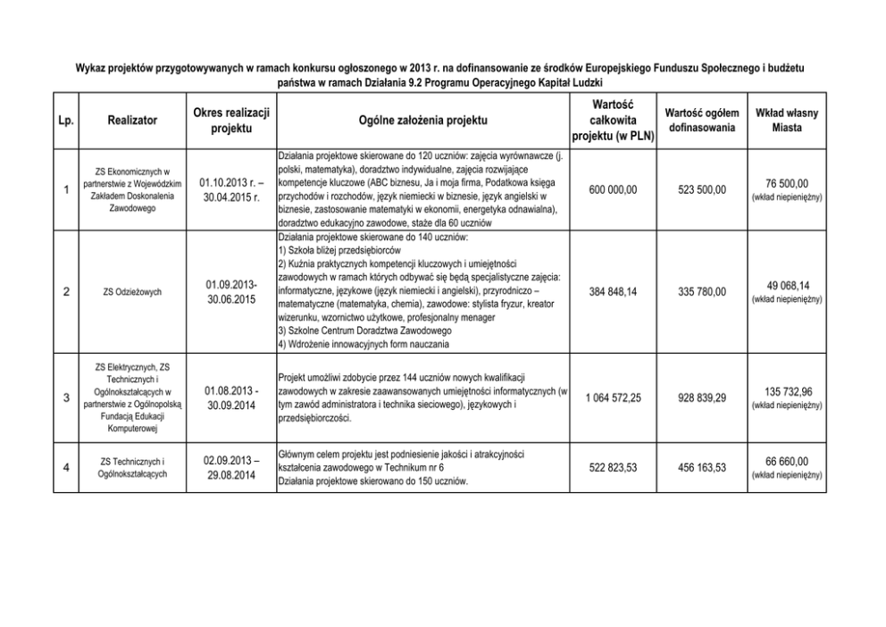 Wykaz projektów przygotowywanych w ramach konkursu ogłoszonego w 2013 r. na dofinansowanie ze środków Europejskiego Funduszu Społecznego i budżetu państwa w ramach Działania 9.2 Programu Operacyjnego Kapitał Ludzki Lp. Realizator Okres realizacji projektu Ogólne założenia projektu Działania projektowe skierowane do 120 uczniów: zajęcia wyrównawcze (j. polski, matematyka), doradztwo indywidualne, zajęcia rozwijające kompetencje kluczowe (ABC biznesu, Ja i moja firma, Podatkowa księga przychodów i rozchodów, język niemiecki w biznesie, język angielski w biznesie, zastosowanie matematyki w ekonomii, energetyka odnawialna), doradztwo edukacyjno zawodowe, staże dla 60 uczniów Działania projektowe skierowane do 140 uczniów: 1) Szkoła bliżej przedsiębiorców 2) Kuźnia praktycznych kompetencji kluczowych i umiejętności zawodowych w ramach których odbywać się będą specjalistyczne zajęcia: informatyczne, językowe (język niemiecki i angielski), przyrodniczo – matematyczne (matematyka, chemia), zawodowe: stylista fryzur, kreator wizerunku, wzornictwo użytkowe, profesjonalny menager 3) Szkolne Centrum Doradztwa Zawodowego 4) Wdrożenie innowacyjnych form nauczania 1 ZS Ekonomicznych w partnerstwie z Wojewódzkim Zakładem Doskonalenia Zawodowego 01.10.2013 r. – 30.04.2015 r. 2 ZS Odzieżowych 01.09.201330.06.2015 3 ZS Elektrycznych, ZS Technicznych i Ogólnokształcących w partnerstwie z Ogólnopolską Fundacją Edukacji Komputerowej 01.08.2013 30.09.2014 Projekt umożliwi zdobycie przez 144 uczniów nowych kwalifikacji zawodowych w zakresie zaawansowanych umiejętności informatycznych (w tym zawód administratora i technika sieciowego), językowych i przedsiębiorczości. 4 ZS Technicznych i Ogólnokształcących 02.09.2013 – 29.08.2014 Głównym celem projektu jest podniesienie jakości i atrakcyjności kształcenia zawodowego w Technikum nr 6 Działania projektowe skierowano do 150 uczniów. Wartość Wartość ogółem całkowita dofinasowania projektu (w PLN) 600 000,00 523 500,00 384 848,14 335 780,00 1 064 572,25 928 839,29 522 823,53 456 163,53 Wkład własny Miasta 76 500,00 (wkład niepieniężny) 49 068,14 (wkład niepieniężny) 135 732,96 (wkład niepieniężny) 66 660,00 (wkład niepieniężny) 5 ZS Mechanicznych w partnerstwie ze Stowarzyszeniem Służb Społecznych "KRĄG" i oddziałem Telewizji Polskiej w Gorzowie Wlkp. 01.11.2013 30.06.2015 6 ZS Mechanicznych w partnerstwie z firmą STILTRANS 01.09.2013 31.05.2015 7 ZS Mechanicznych i Zespół Szkół nr 12 w partnerstwie z Zachodnim Centrum Konsultingowym Euro Invest 01.09.2013 31.08.2014 8 Zespół Szkół nr 12 w partnerstwie z Akademią Kształcenia Europejskiego Krzysztof Kuryłowicz Jelenia Góra 01.09.2013 30.06.2015 Działania projektowe skierowane do 60 uczniów: 1) Zajęcia dydaktyczno-wyrównawcze: zawodowy język angielski, język polski, matematyka, 2) Kursy specjalistyczne: zawodowy z wykorzystania ICT (Techniki graficzne i multimedialne), Public Relations, energetyka odnawialna, obsługa klienta, ekonomia społeczna, 3) Doradztwo zawodowe, 4) Praktyki zawodowe. 5) Wyjazdy edukacyjne: m.in. Targi Poznańskie, lotnisko w Warszawie 6) Zajęcia rozwijające kompetencje kluczowe 7) Doradztwo i opieka pedagogiczno – psychologiczna 8) Doposażenie szkoły w nowe pomoce dydaktyczne oraz wdrożenie nowych, innowacyjnych form nauczania i oceniania. Działania projektowe skierowane do 60 uczniów obejmują: dodatkowe zajęcia z doradztwa edukacyjno-zawodowego, kursy zawodowe, laboratoria wirtualne. Działania projektowe skierowane do 100 uczniów zakładają Wzrost poziomu kompetencji kluczowych w zakresie języka angielskiego, matematyki, kompetencji i praktycznych umiejętności zawodowych, umiejętności poruszania się po rynku pracy. Działania projektowe skierowane do 80 uczniów: 1) Staże u pracodawcy 2) Zajęcia dodatkowe: język włoski, funkcjonowanie firmy w sektorze turystycznym/asystent, Trening Kompetencji Społecznych 3) Zajęcia specjalizacyjne: LSI obsługa recepcji (szkolenie + praktyki), Consierge (szkolenie + praktyki), sprzedaż ofert (marketing sprzedaży + prawo jazdy) 4) Doradztwo zawodowe oraz doradztwo i opieka psychologiczno – pedagogiczna. RAZEM 890 000,00 776 525,00 370 000,00 322 825,00 486 901,95 424 821,95 1 500 000,00 1 308 750,00 5 819 145,87 5 077 204,77 113 475,00 (wkład niepieniężny) 47 175,00 (wkład niepieniężny) 62 080,00 (wkład niepieniężny) 191 250, 00 (wkład niepieniężny) 741 941,10