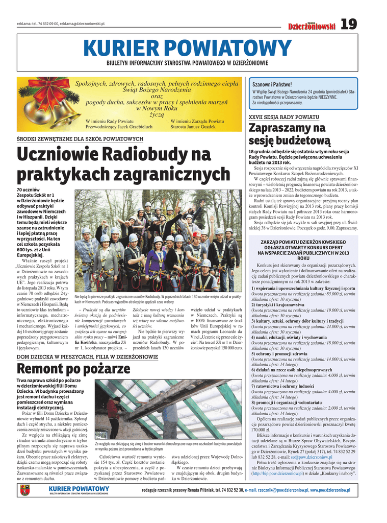 reklama: tel. 74 832 09 00, [email protected] KURIER POWIATOWY 19 Biuletyn Informacyjny Starostwa Powiatowego w Dzierżoniowie Spokojnych, zdrowych, radosnych, pełnych rodzinnego ciepła Świąt Bożego Narodzenia oraz pogody ducha, sukcesów w pracy i spełnienia marzeń w Nowym Roku życzą W imieniu Rady Powiatu Przewodniczący Jacek Grzebieluch W imieniu Zarządu Powiatu Starosta Janusz Guzdek Środki zewnętrzne dla szkół powiatowych Uczniowie Radiobudy na praktykach zagranicznych 70 uczniów Zespołu Szkół nr 1 w Dzierżoniowie będzie odbywać praktyki zawodowe w Niemczech i w Hiszpanii. Dzięki temu będą mieli większe szanse na zatrudnienie i lepiej płatną pracę w przyszłości. Na ten cel szkoła pozyskała 600 tys. zł z Unii Europejskiej. Właśnie ruszył projekt „Uczniowie Zespołu Szkół nr 1 w Dzierżoniowie na zawodowych praktykach w krajach UE”. Jego realizacja potrwa do listopada 2013 roku. W tym czasie 70 osób odbędzie 2-tygodniowe praktyki zawodowe w Niemczech i Hiszpanii. Będą to uczniowie klas technikum – informatycznego, mechatronicznego, elektronicznego i mechanicznego. Wyjazd każdej 14-osobowej grupy zostanie poprzedzony przygotowaniem pedagogicznym, kulturowym i językowym. Nie będą to pierwsze praktyki zagraniczne uczniów Radiobudy. W poprzednich latach 130 uczniów wzięło udział w praktykach w Niemczech. Podczas wyjazdów atrakcyjnie spędzali czas walony – Praktyki są dla uczniów świetną okazją do podniesienie kompetencji zawodowych i umiejętności językowych, co zwiększa ich szanse na europejskim rynku pracy – mówi Emilia Kosińska, nauczycielka ZS nr 1, koordynator projektu. – Zdobycie nowej wiedzy i kontakt z inną kulturą wzmacnia też wiarę we własne możliwości uczniów. Nie będzie to pierwszy wyjazd na praktyki zagraniczne uczniów Radiobudy. W poprzednich latach 130 uczniów wzięło udział w praktykach w Niemczech. Praktyki są w 100% finansowane ze środków Unii Europejskiej w ramach programu Leonardo da Vinci „Uczenie się przez całe życie”. Na ten cel ZS nr 1 w Dzierżoniowie pozyskał 150 000 euro. Dom Dziecka w Pieszycach, filia w Dzierżoniowie Remont po pożarze Trwa naprawa szkód po pożarze w dzierżoniowskiej filii Domu Dziecka. W budynku prowadzony jest remont dachu i części pomieszczeń oraz wymiana instalacji elektrycznej. Pożar w filii Domu Dziecka w Dzierżoniowie wybuchł 14 października. Spłonął dach i część strychu, a niektóre pomieszczenia zostały zniszczone w akcji gaśniczej. Ze względu na zbliżającą się zimę i trudne warunki atmosferyczne w trybie pilnym rozpoczęła się naprawa uszkodzeń budynku powstałych w wyniku pożaru. Obecnie prace zakończyli elektrycy, dzięki czemu mogą rozpocząć się roboty tynkarsko-malarskie w pomieszczeniach. Zaawansowane są również prace związane z remontem dachu. Ze względu na zbliżającą się zimę i trudne warunki atmosferyczne naprawa uszkodzeń budynku powstałych w wyniku pożaru jest prowadzona w trybie pilnym Całościowa wartość remontu wyniesie 154 tys. zł. Część kosztów zostanie pokryta z ubezpieczenia, a część z pozyskanej przez Starostwo Powiatowe w Dzierżoniowie pomocy z budżetu pań- KURIER POWIATOWY Biuletyn Informacyjny Starostwa Powiatowego w Dzierżoniowie stwa udzielonej przez Wojewodę Dolnośląskiego. W czasie remontu dzieci przebywają w znajdującym się obok, drugim budynku w Dzierżoniowie. Szanowni Państwo! W Wigilię Świąt Bożego Narodzenia 24 grudnia (poniedziałek) Starostwo Powiatowe w Dzierżoniowie będzie NIECZYNNE. Za niedogodności przepraszamy. XXVII sesja Rady Powiatu Zapraszamy na sesję budżetową 18 grudnia odbędzie się ostatnia w tym roku sesja Rady Powiatu. Będzie poświęcona uchwaleniu budżetu na 2013 rok. Sesja rozpocznie się od wręczenia nagród dla zwycięzców XI Powiatowego Konkursu Szopek Bożonarodzeniowych. W części roboczej radni zajmą się głównie sprawami finansowymi – wieloletnią prognozą finansową powiatu dzierżoniowskiego na lata 2013 – 2022, budżetem powiatu na rok 2013, a także wprowadzeniem zmian do tegorocznego budżetu. Radni ustalą też sprawy organizacyjne: przyjmą roczny plan kontroli Komisji Rewizyjnej na 2013 rok, plany pracy komisji stałych Rady Powiatu na I półrocze 2013 roku oraz harmonogram posiedzeń sesji Rady Powiatu na 2013 rok. Sesja odbędzie się jak zwykle w sali sesyjnej przy ul. Świdnickiej 38 w Dzierżoniowie. Początek o godz. 9.00. Zapraszamy. ZARZĄD POWIATU DZIERŻONIOWSKIEGO OGŁASZA OTWARTY KONKURS OFERT NA WSPARCIE ZADAŃ PUBLICZNYCH W 2013 ROKU Konkurs jest skierowany do organizacji pozarządowych. Jego celem jest wyłonienie i dofinansowanie ofert na realizację zadań publicznych powiatu dzierżoniowskiego o charakterze ponadgminnym na rok 2013 w zakresie: 1) wspierania i upowszechniania kultury fizycznej i sportu (kwota przeznaczona na realizację zadania: 85.000 zł, termin składania ofert: 10 stycznia) 2) turystyki i krajoznawstwa (kwota przeznaczona na realizację zadania: 19.000 zł, termin składania ofert: 30 stycznia) 3) kultury, sztuki, ochrony dóbr kultury i tradycji (kwota przeznaczona na realizację zadania: 24.000 zł, termin składania ofert: 30 stycznia) 4) nauki, edukacji, oświaty i wychowania (kwota przeznaczona na realizację zadania: 18.000 zł, termin składania ofert: 30 stycznia) 5) ochrony i promocji zdrowia (kwota przeznaczona na realizację zadania: 14.000 zł, termin składania ofert: 14 lutego) 6) działań na rzecz osób niepełnosprawnych (kwota przeznaczona na realizację zadania: 4.000 zł, termin składania ofert: 14 lutego) 7) ratownictwa i ochrony ludności (kwota przeznaczona na realizację zadania: 4.000 zł, termin składania ofert: 14 lutego) 8) promocji i organizacji wolontariatu (kwota przeznaczona na realizację zadania: 2.000 zł, termin składania ofert: 14 lutego) Ogółem na realizację zadań publicznych przez organizacje poz