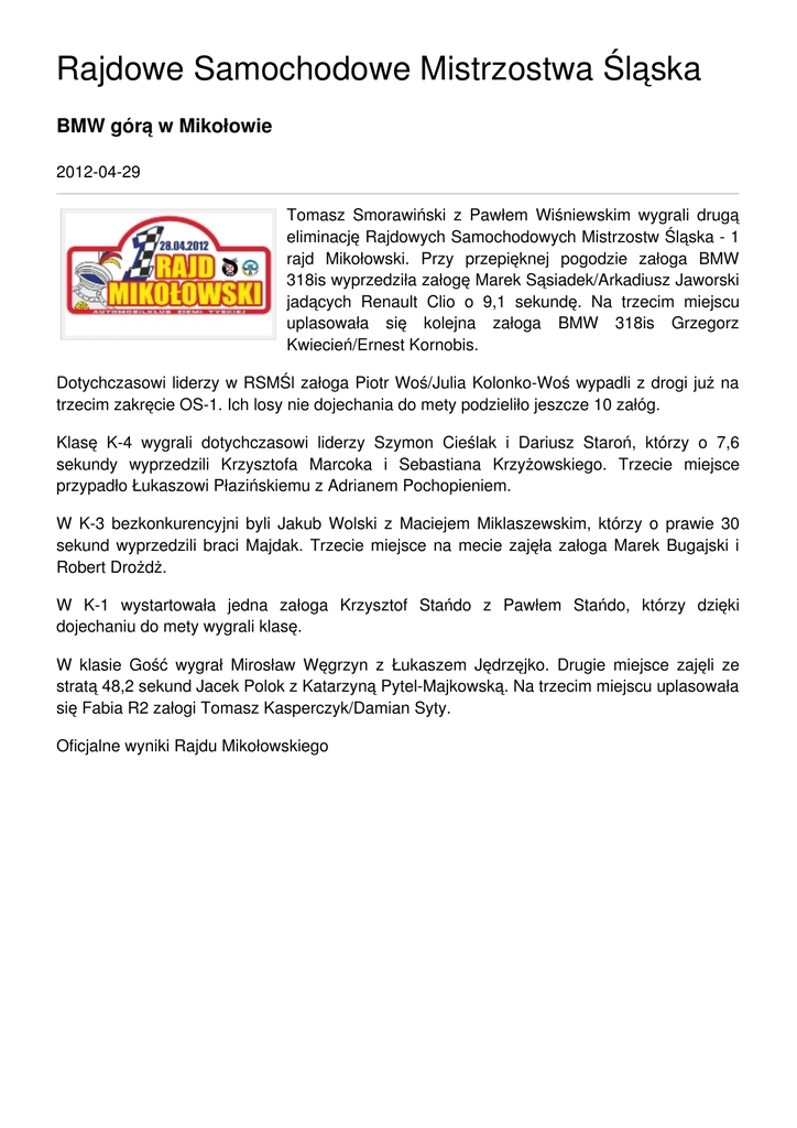 Rajdowe Samochodowe Mistrzostwa Śląska BMW górą w Mikołowie 2012-04-29 Tomasz Smorawiński z Pawłem Wiśniewskim wygrali drugą eliminację Rajdowych Samochodowych Mistrzostw Śląska - 1 rajd Mikołowski. Przy przepięknej pogodzie załoga BMW 318is wyprzedziła załogę Marek Sąsiadek/Arkadiusz Jaworski jadących Renault Clio o 9,1 sekundę. Na trzecim miejscu uplasowała się kolejna załoga BMW 318is Grzegorz Kwiecień/Ernest Kornobis. Dotychczasowi liderzy w RSMŚl załoga Piotr Woś/Julia Kolonko-Woś wypadli z drogi już na trzecim zakręcie OS-1. Ich losy nie dojechania do mety podzieliło jeszcze 10 załóg. Klasę K-4 wygrali dotychczasowi liderzy Szymon Cieślak i Dariusz Staroń, którzy o 7,6 sekundy wyprzedzili Krzysztofa Marcoka i Sebastiana Krzyżowskiego. Trzecie miejsce przypadło Łukaszowi Płazińskiemu z Adrianem Pochopieniem. W K-3 bezkonkurencyjni byli Jakub Wolski z Maciejem Miklaszewskim, którzy o prawie 30 sekund wyprzedzili braci Majdak. Trzecie miejsce na mecie zajęła załoga Marek Bugajski i Robert Drożdż. W K-1 wystartowała jedna załoga Krzysztof Stańdo z Pawłem Stańdo, którzy dzięki dojechaniu do mety wygrali klasę. W klasie Gość wygrał Mirosław Węgrzyn z Łukaszem Jędrzęjko. Drugie miejsce zajęli ze stratą 48,2 sekund Jacek Polok z Katarzyną Pytel-Majkowską. Na trzecim miejscu uplasowała się Fabia R2 załogi Tomasz Kasperczyk/Damian Syty. Oficjalne wyniki Rajdu Mikołowskiego