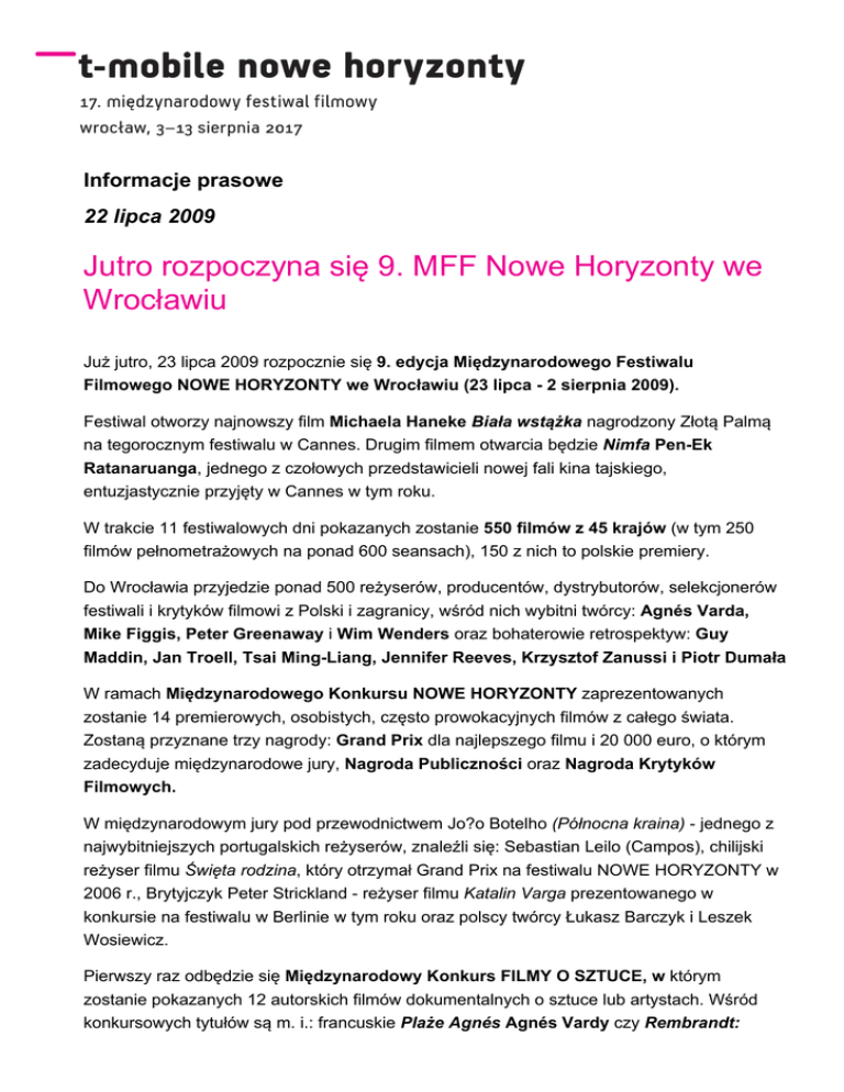 Informacje prasowe 22 lipca 2009 Jutro rozpoczyna się 9. MFF Nowe Horyzonty we Wrocławiu Już jutro, 23 lipca 2009 rozpocznie się 9. edycja Międzynarodowego Festiwalu Filmowego NOWE HORYZONTY we Wrocławiu (23 lipca - 2 sierpnia 2009). Festiwal otworzy najnowszy film Michaela Haneke Biała wstążka nagrodzony Złotą Palmą na tegorocznym festiwalu w Cannes. Drugim filmem otwarcia będzie Nimfa Pen-Ek Ratanaruanga, jednego z czołowych przedstawicieli nowej fali kina tajskiego, entuzjastycznie przyjęty w Cannes w tym roku. W trakcie 11 festiwalowych dni pokazanych zostanie 550 filmów z 45 krajów (w tym 250 filmów pełnometrażowych na ponad 600 seansach), 150 z nich to polskie premiery. Do Wrocławia przyjedzie ponad 500 reżyserów, producentów, dystrybutorów, selekcjonerów festiwali i krytyków filmowi z Polski i zagranicy, wśród nich wybitni twórcy: Agnés Varda, Mike Figgis, Peter Greenaway i Wim Wenders oraz bohaterowie retrospektyw: Guy Maddin, Jan Troell, Tsai Ming-Liang, Jennifer Reeves, Krzysztof Zanussi i Piotr Dumała W ramach Międzynarodowego Konkursu NOWE HORYZONTY zaprezentowanych zostanie 14 premierowych, osobistych, często prowokacyjnych filmów z całego świata. Zostaną przyznane trzy nagrody: Grand Prix dla najlepszego filmu i 20 000 euro, o którym zadecyduje międzynarodowe jury, Nagroda Publiczności oraz Nagroda Krytyków Filmowych. W międzynarodowym jury pod przewodnictwem Jo?o Botelho (Północna kraina) - jednego z najwybitniejszych portugalskich reżyserów, znaleźli się: Sebastian Leilo (Campos), chilijski reżyser filmu Święta rodzina, który otrzymał Grand Prix na festiwalu NOWE HORYZONTY w 2006 r., Brytyjczyk Peter Strickland - reżyser filmu Katalin Varga prezentowanego w konkursie na festiwalu w Berlinie w tym roku oraz polscy twórcy Łukasz Barczyk i Leszek Wosiewicz. Pierwszy raz odbędzie się Międzynarodowy Konkurs FILMY O SZTUCE, w którym zostanie pokazanych 12 autorskich filmów dokumentalnych o sztuce lub artystach. Wśród konkursowych tytułów są m. i.: francuskie Plaże Agnés Agnés Vardy czy Rembrandt: oskarżam…! Petera Greenawaya. Międzynarodowe jury przyzna nagrodę w wysokości 10 000 euro. W jury zasiadają: Katarzyna Kozyra - artystka i reżyserka, Jay Weissberg - krytyk filmowy (Variety), Marie Losier - francuska eksperymentatorka oraz Tibor Szemzö - węgierski artysta i reżyser. W Konkursie NOWE FILMY POLSKIE znalazło się 13 powstałych w ostatnim roku filmów fabularnych. Na festiwalu światowe premiery będą miały: Handlarz cudów Bolesława Pawicy i Jarosława Szody, Hel Kingi Dębskiej oraz Las Piotra Dumały. Międzynarodowe jury przyzna Wrocławską Nagrodę Filmową ufundowaną przez Prezydenta Wrocławia, Pana Rafała Dutkiewicza w wysokości 100 tysięcy złotych (60 tysięcy dla reżysera i 40 tysięcy dla producenta) oraz nagrodę za debiut reżyserski w wysokości 40 tysięcy złotych, którą ufundował Marszałek Województwa Dolnośląskiego, Pan Marek Łapiński. W jury pod przewodnictwem węgierskiej reżyserki Marthy Mészáros znaleźli się: brytyjski reżyser Paweł Pawlikowski (Lato miłości); Michael Brooke - brytyjski krytyk filmowy współpracujący z magazynem Sight & Sound; niemiecka reżyserka Emily Atef (Droga Molly) oraz Miroljub Vuckovic - dyrektor festiwalu w Belgradzie. Wszystkie nagrodzone w konkursach filmy mają zagwarantowaną dystrybucję w Polsce. Na festiwalu światową premierę będzie miał film Krzysztofa Zanussiego Rewizyta, w którym ostatnią rolę zagrał Zbigniew Zapasiewicz. Podczas festiwalu zaprezentowane zostaną także przeglądy współczesnego kina szwedzkiego i kanadyjskiego oraz klasyczne filmy węgierskie z przełomu lat 60. i 70. W klubie festiwalowym wystąpią zespoły reprezentujące alternatywną sceny muzyczną ze Szwecji, Kanady i Węgier. Więcej informacji: www.nowehoryzonty.pl Materiały prasowe: ftp://nowehoryzonty.pl (login i hasło: press) PR festiwalu: Agnieszka Wolak, [email protected], +48 0 600 534 978 Mecenasem głównym festiwalu już po raz czwarty jest miasto Wrocław. Po raz siódmy sponsorem głównym festiwalu jest Polska Telefonia Cyfrowa, operator sieci ERA. Oficjalnym samochodem festiwalowym jest Volkswagen.