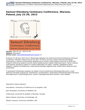 Samuel Eilenberg Centenary Conference, Warsaw, Poland, July 22-26, 2013 Opublikowane na Polskie Towarzystwo Matematyczne (http://www.ptm.org.pl) Samuel Eilenberg Centenary Conference, Warsaw, Poland, July 22-26, 2013 Termin: 2013-07-22 - 2013-07-26 Miejsce: Warszawa Strona www: http://eilenberg100.ptm.org.pl/ [1] W dniach 22-26 lipca 2013 roku w Warszawie odbędzie się konferencja Samuel Eilenberg Centenary Conference, Warsaw, Poland, July 22-26, 2013. W setną rocznicę urodzin Samuela Eilenberga matematycy z różnych kontynentów spotkają się na uczelni, której dyplom otrzymał w 1934 roku. Program konferencji obejmie szeroki zakres współczesnych badań matematycznych. Patron imprezy miał bowiem zasadniczy wpływ na rozwój matematyki XX wieku. Topolog, współtwórca teorii kategorii, algebry homologicznej, nowoczesnej topologii algebraicznej; wniósł także wkład do teorii automatów. Z nazwiskiem Eilenberga związane są między innymi przestrzenie Eilenberga-MacLane'a, ścisła definicja homologii singularnej, twierdzenie o przeszkodach, aksjomatyka Eilenberga-Steenroda teorii homologicznych i kohomologicznych, wyniki z topologicznej teorii wymiaru, teorii węzłów. Zaproszeni mówcy plenarni: Paul Balmer, University of California at Los Angeles, USA John Greenlees, University of Sheffield, UK André Joyal, Université du Québec à Montréal, Canada Martin Hyland, University of Cambridge, UK William Lawvere, University at Buffalo, USA Strona 1 z 2 Samuel Eilenberg Centenary Conference, Warsaw, Poland, July 22-26, 2013 Opublikowane na Polskie Towarzystwo Matematyczne (http://www.ptm.org.pl) Haynes Miller, Massachusetts Institute of Technology, USA Ieke Moerdijk, Radboud University Nijmegen, Netherlands Bertrand Toën, Université de Montpellier, France Shmuel Weinberger, University of Chicago, USA Mariusz Wodzicki, University of California at Berkeley, USA Równie wybitnym jak matematykiem, był Samuel Eilenberg znawcą i kolekcjonerem dzieł sztuki, zwłaszcza dalekowschodniej. W świecie matematyków był znany jako Sammy, a w świecie sztuki nazywano go Profesorem. Samuel Eilenberg był członkiem Polskiego Towarzystwa Matematycznego (PTM) - w 1991 roku otrzymał godność członka honorowego PTM, Amerykańskiego Towarzystwa Matematycznego (AMS), amerykańskiej Narodowej Akademii Nauk (The National Academy of Sciences, USA), a także Polskiej Akademii Nauk. Więcej informacji i rejestracja na portalu konferencji: http://eilenberg100.ptm.org.pl/ [1] Organizatorzy: Polskie Towarzystwo Matematyczne, Uniwersytet Warszawski, Columbia University (USA), Amerykańskie Towarzystwo Matematyczne, Instytut Matematyczny PAN. Sponsor: Warszawskie Centrum Nauk Matematycznych Załącznik Wielkość e100-poster-druk.pdf [2] 1.19 MB Adres URL źródła: http://www.ptm.org.pl/konferencje/samuel-eilenberg-centenary-conference-warsaw-poland-july-22-26 -2013 Odnośniki: [1] http://eilenberg100.ptm.org.pl/ [2] http://www.ptm.org.pl/sites/default/files/e100-poster-druk_0.pdf Strona 2 z 2 Powered by TCPDF (www.tcpdf.org)